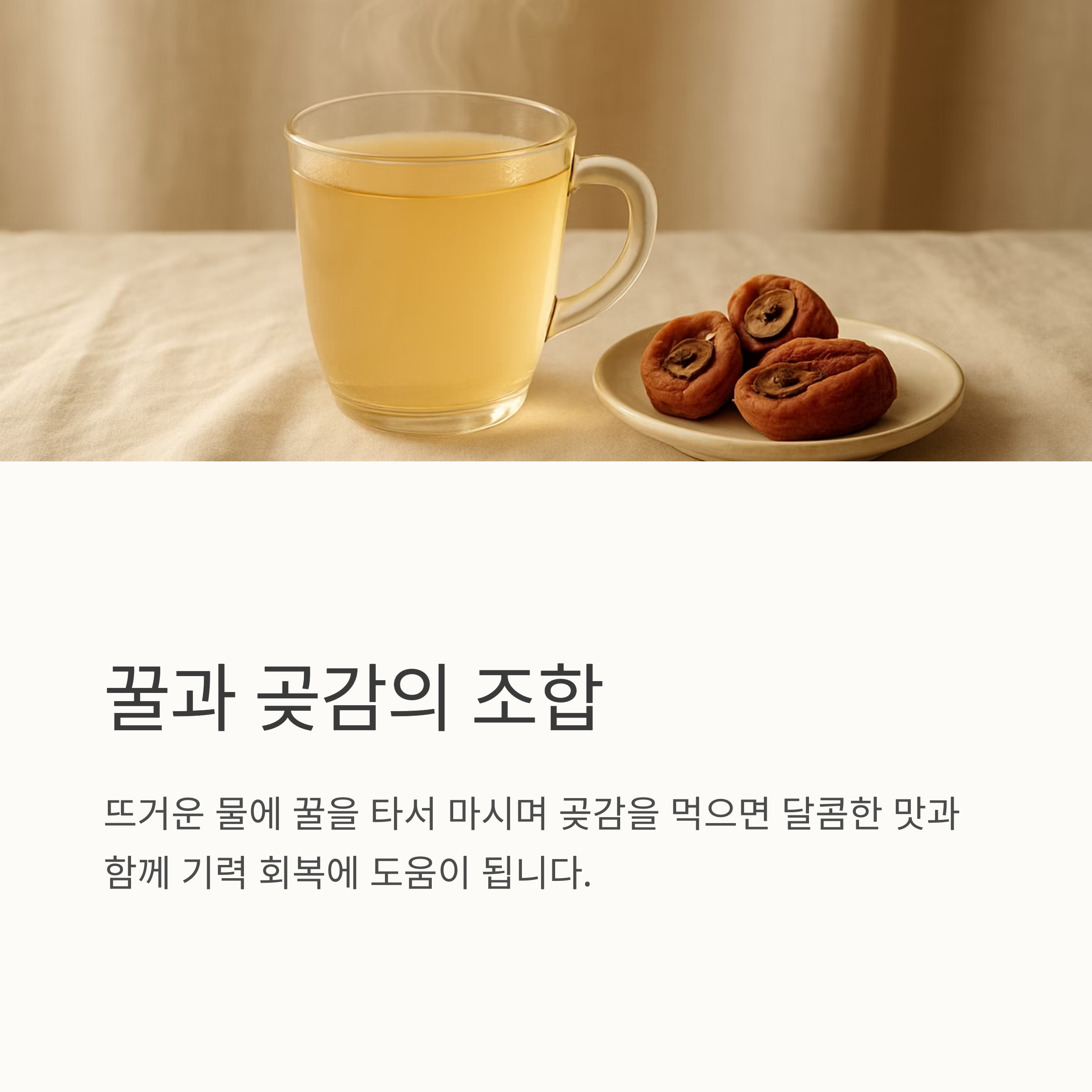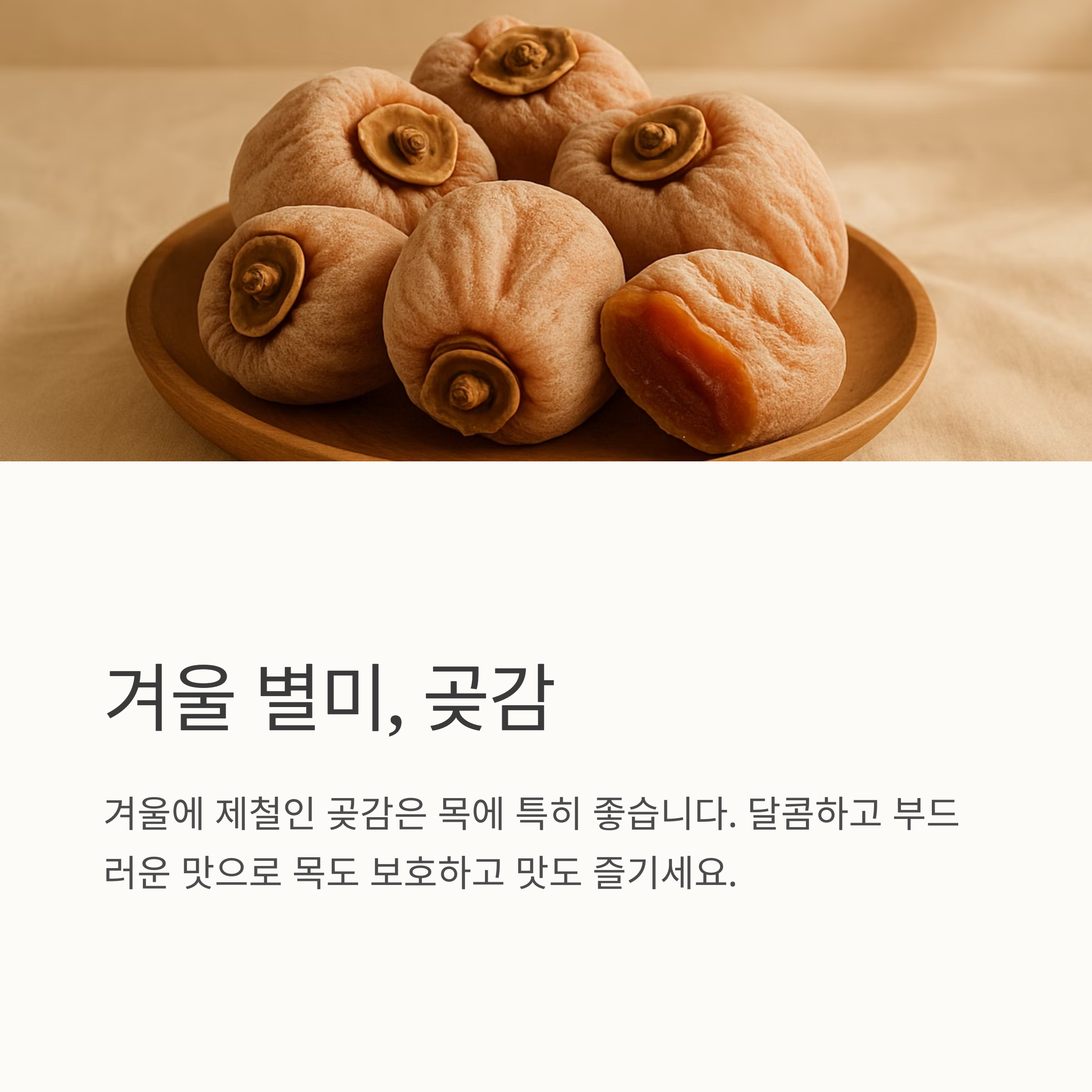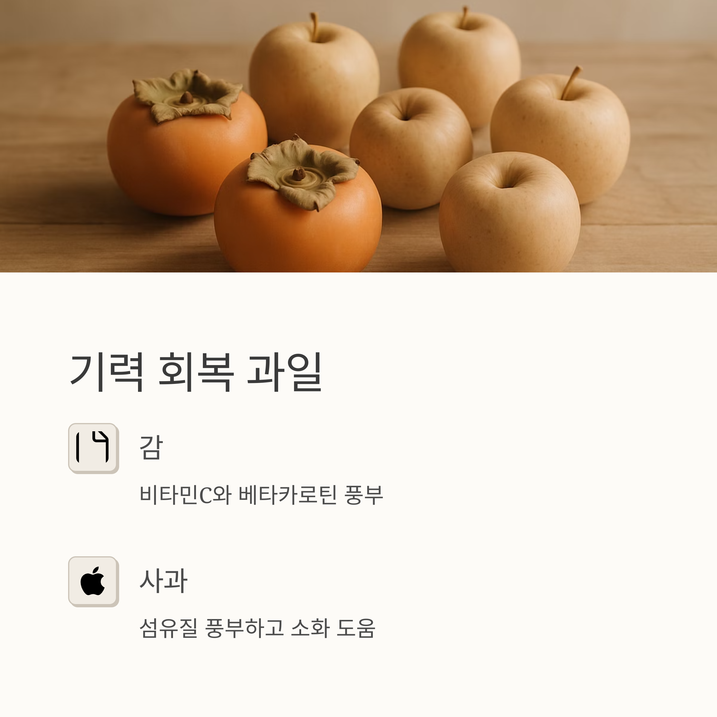 5. 감과 사과는 면역력 증진과 소화 기능 개선에 효과적입니다. 달콤하고 부드러운 과일로 기력 회복과 감기 증상 완화에 도움을 받으세요.
