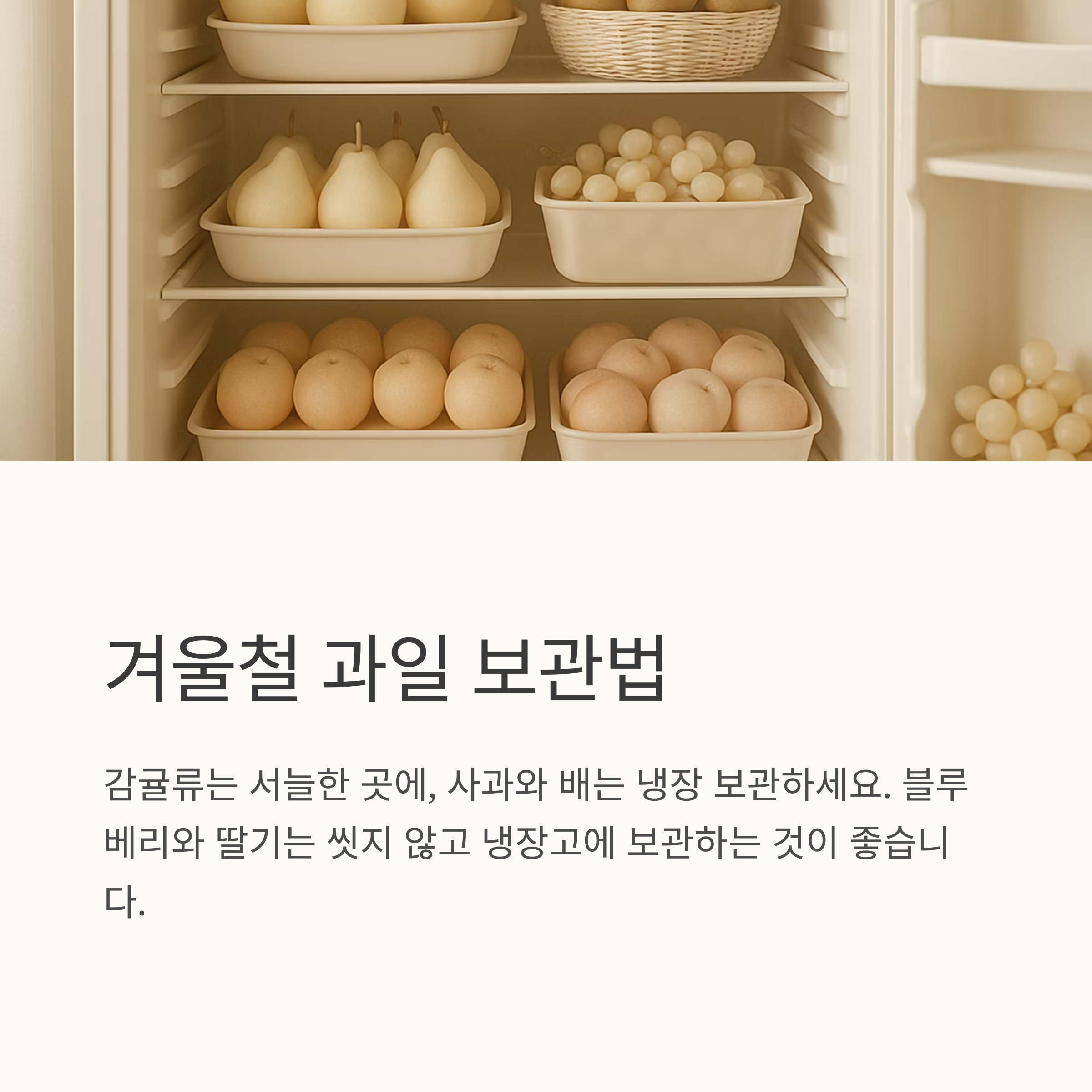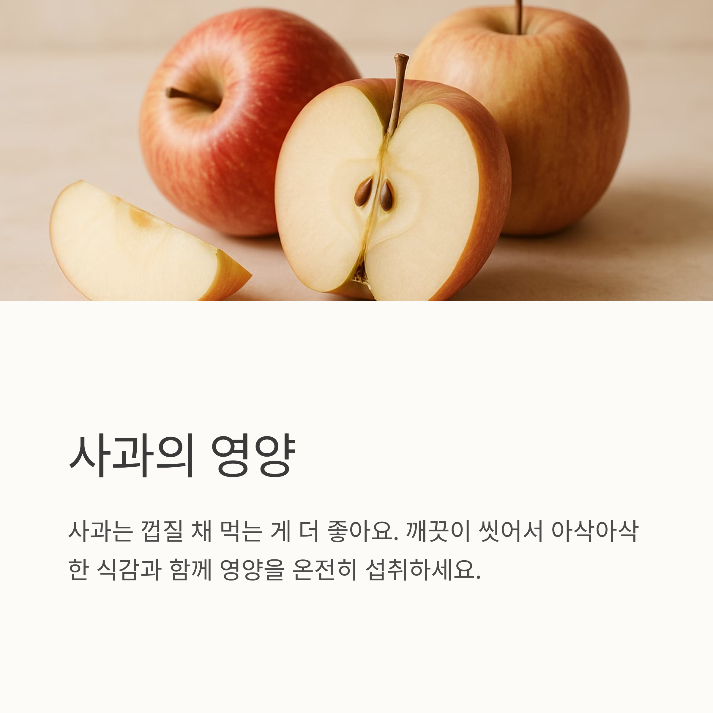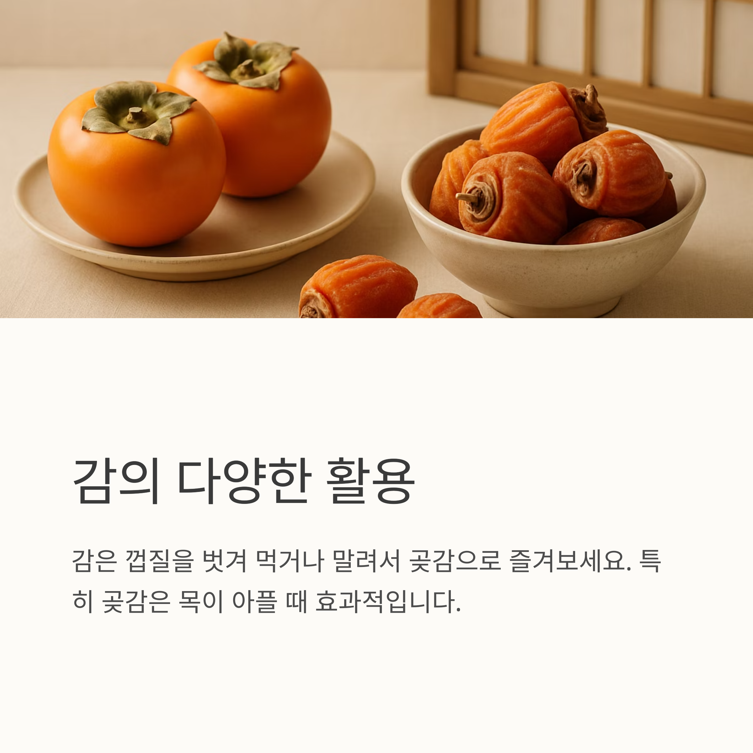 5. 감과 사과는 면역력 증진과 소화 기능 개선에 효과적입니다. 달콤하고 부드러운 과일로 기력 회복과 감기 증상 완화에 도움을 받으세요.