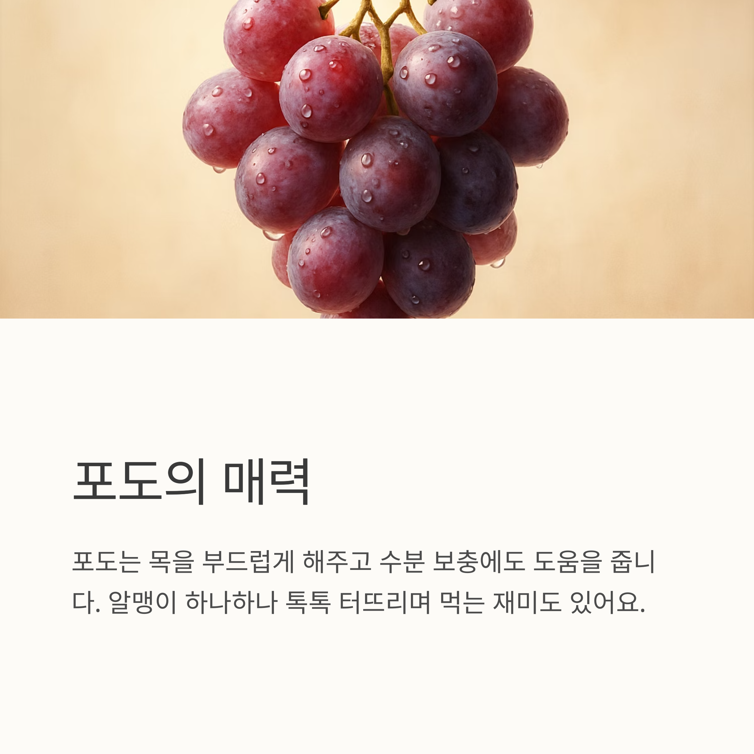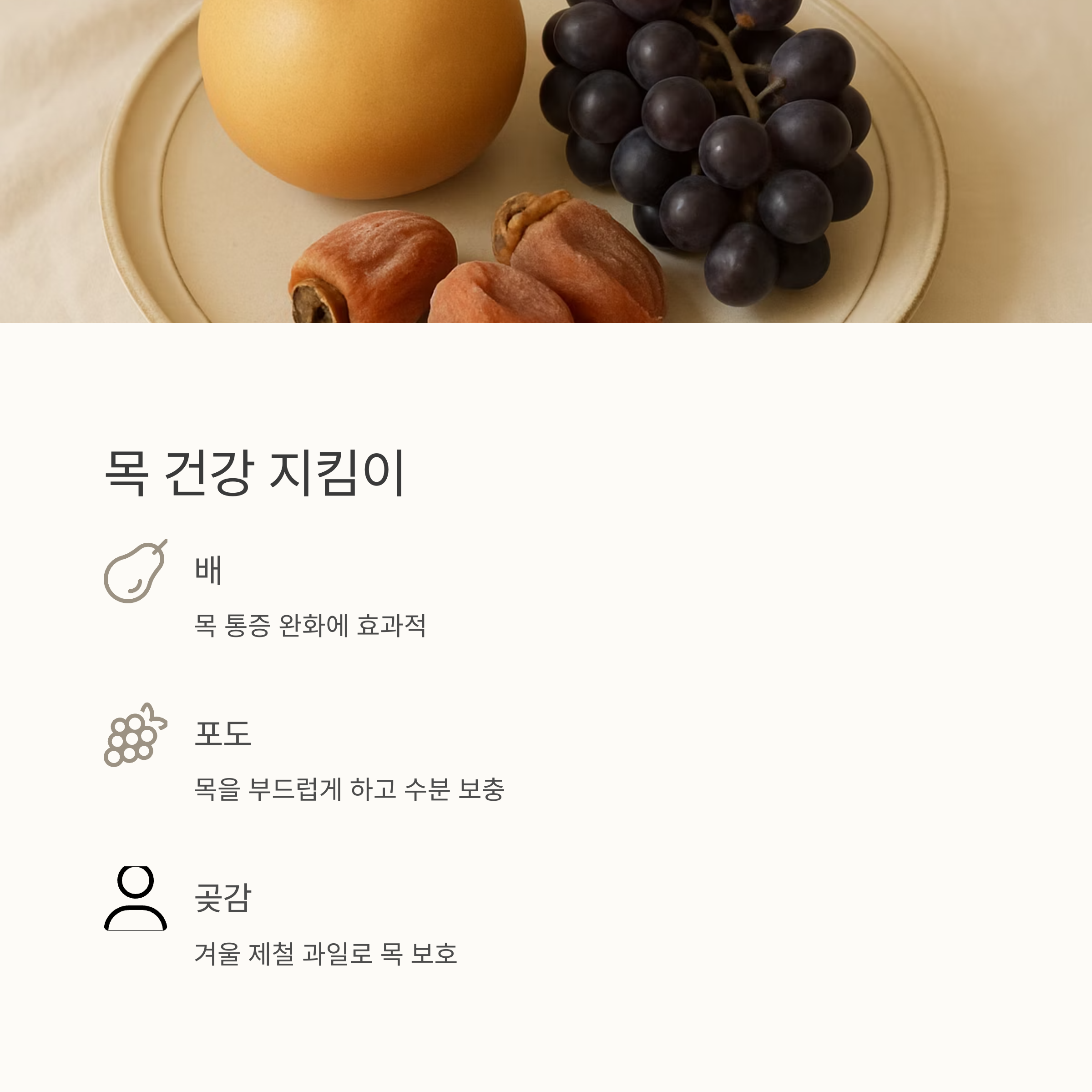 포도 알맹이 하나하나 톡톡 터뜨리면서 먹는 재미도 있고요. 저는 감기 걸리면 포도랑 배랑 번갈아 가면서 먹어요. 시원한 포도의 맛과 배의 부드러운 맛이 어우러져서 목이 훨씬 편해지는 느낌이랍니다. 특히 겨울에 제철인 곶감도 목에 좋다고 하니, 곶감 몇 개 쟁여두고 먹어보세요. 맛도 좋고 목도 보호하고 일석이조죠!