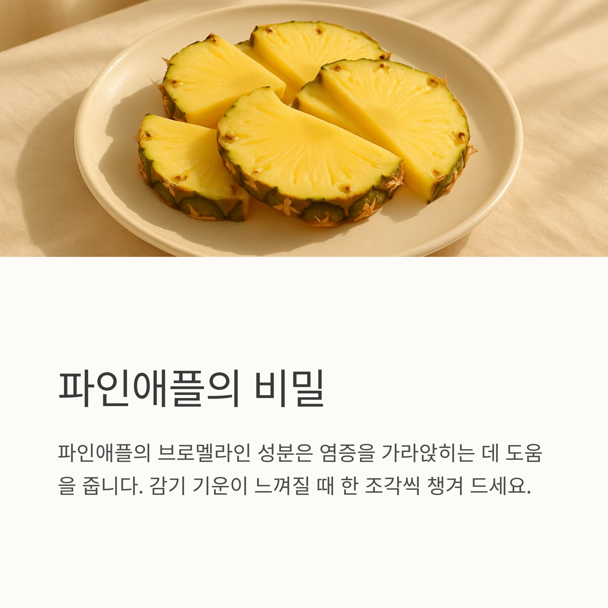 감기 걸리면 몸이 으슬으슬 춥고, 온몸이 쑤시죠. 이럴 때 도움이 되는 과일들이 있어요. 배는 수분이 많아서 목이 아플 때 먹으면 진짜 좋아요. 달콤하고 부드러워서 넘기기도 편하구요. 배 즙을 내서 따뜻하게 마시면 목이 많이 편해져요. 그리고 파인애플! 파인애플에는 브로멜라인이라는 성분이 들어있는데, 이게 염증을 가라앉히는 데 도움을 준대요.