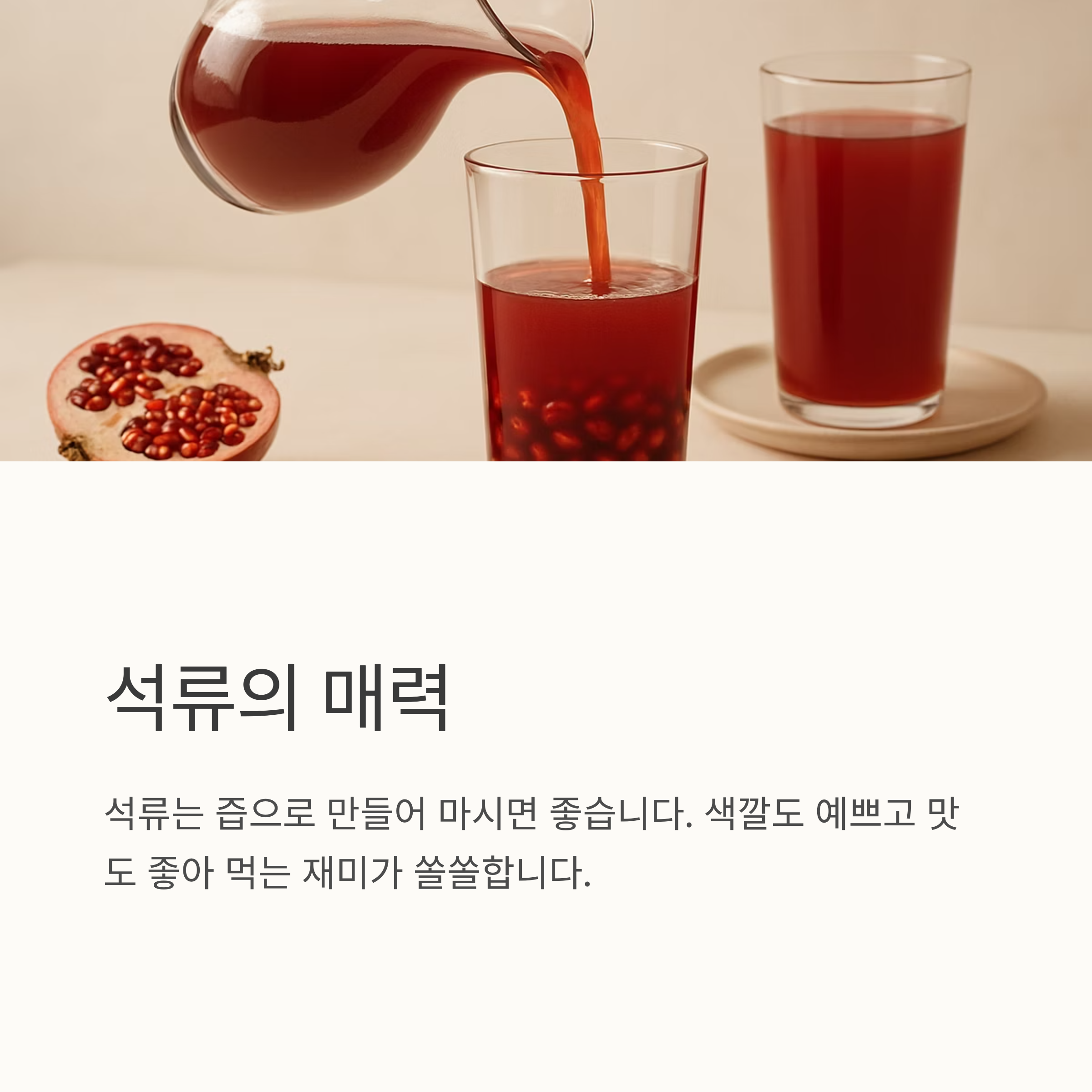 블루베리는 요거트에 넣어 먹어도 맛있고, 석류는 즙으로 만들어 마셔도 좋답니다. 색깔도 예쁘고 맛도 좋아서 먹는 재미도 쏠쏠해요. 저는 아침에 블루베리 요거트를 즐겨 먹고, 저녁에는 석류 주스를 한 잔 마시면서 하루를 마무리하는데요, 상큼하면서 달콤한 맛 덕분에 기분까지 좋아진답니다. 항산화 물질 듬뿍 먹고 건강하게 겨울 나자구요!
