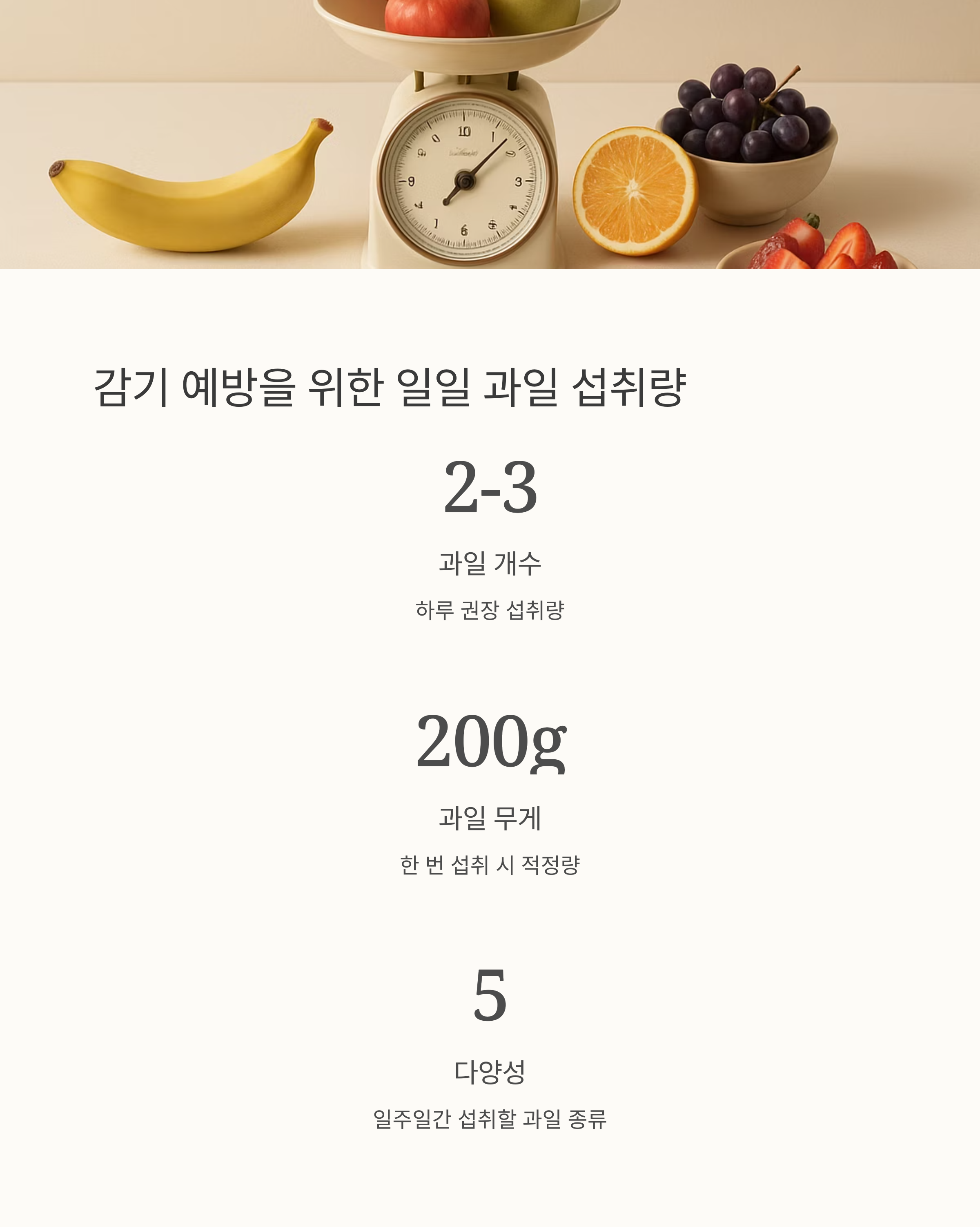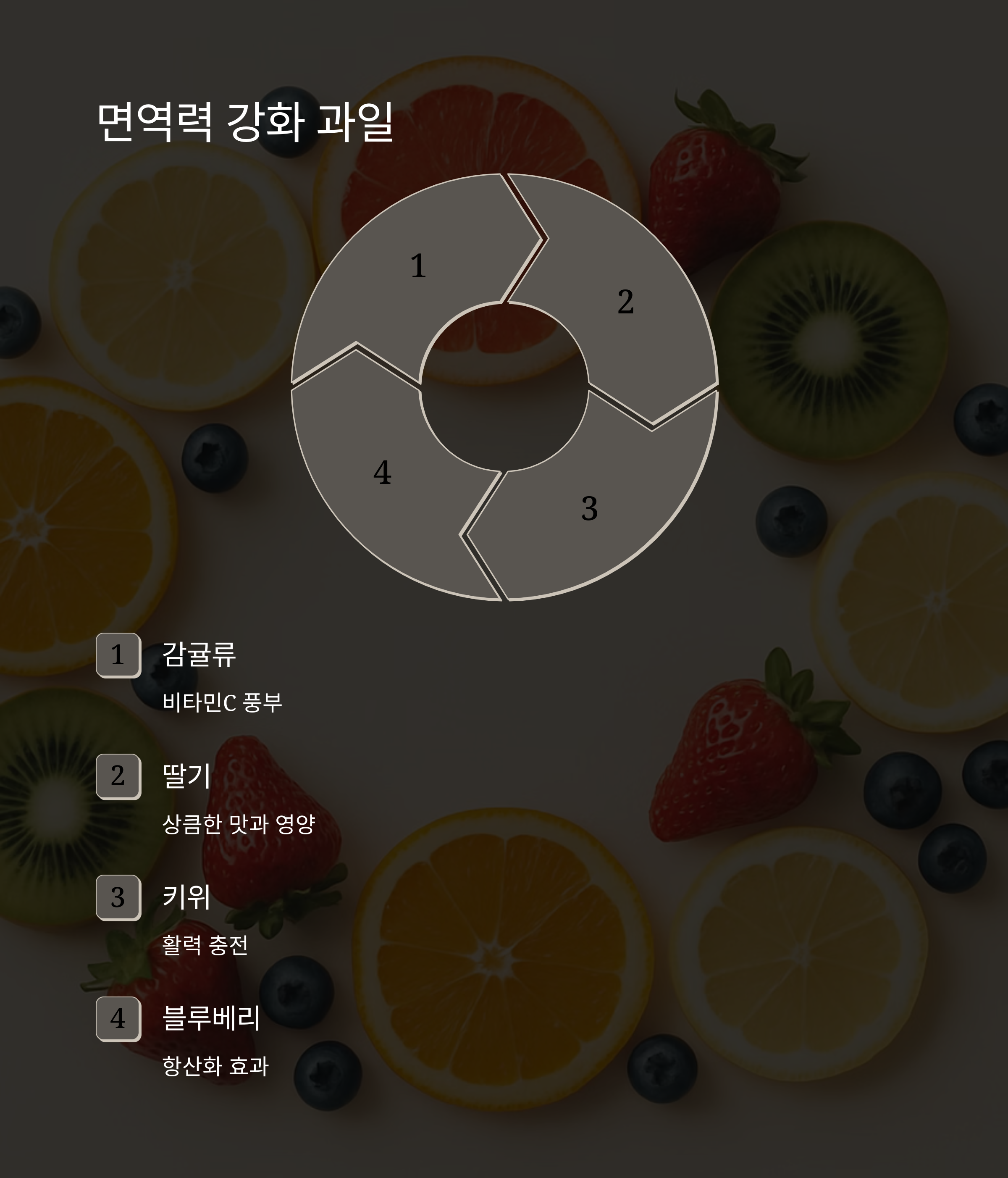 1. 비타민C 풍부한 과일들은 면역력 강화에 도움을 주고, 감기 예방에 효과적입니다. 상큼한 맛으로 입맛을 돋우고 활력을 충전해 보세요.