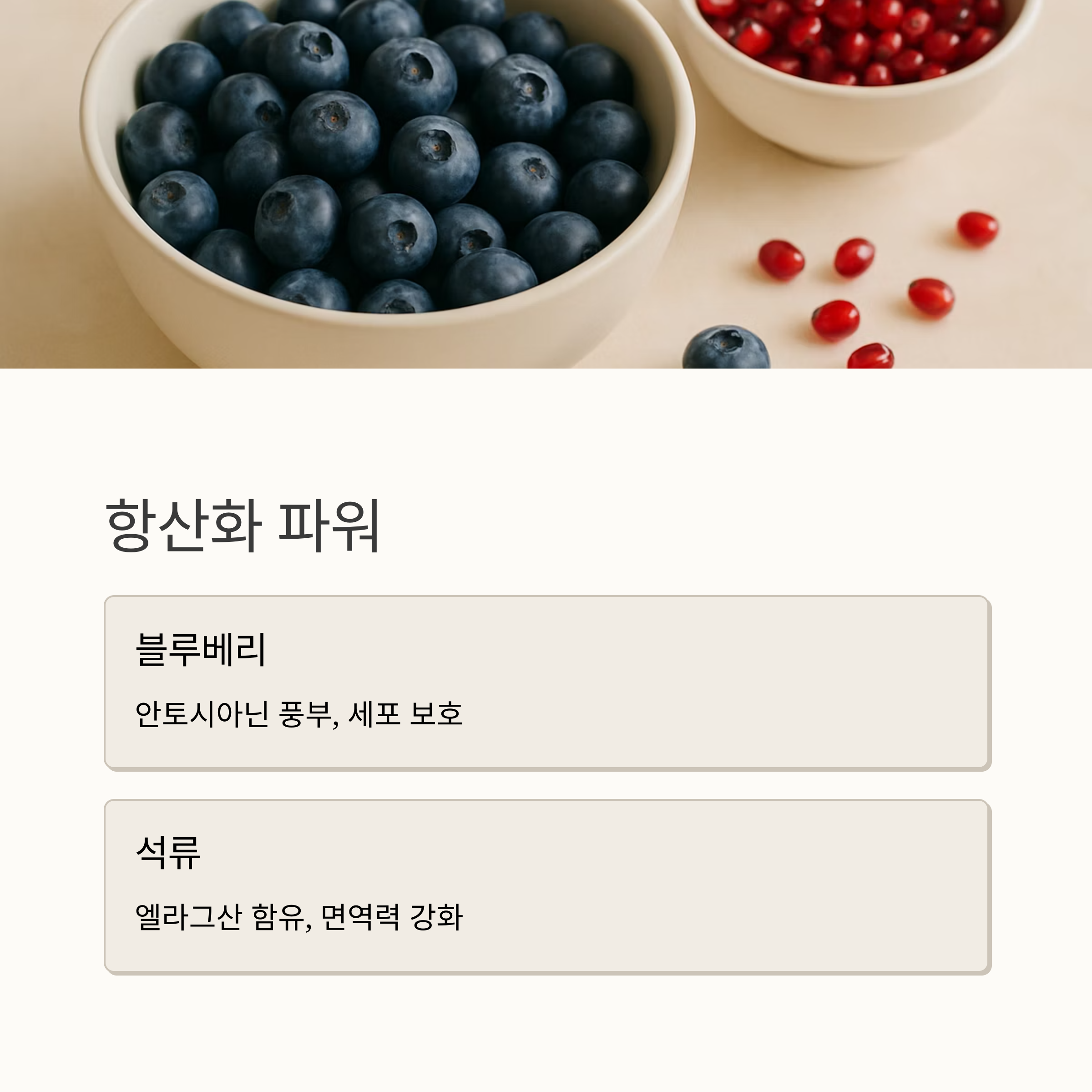 4. 블루베리와 석류의 항산화 성분은 면역력을 높이고 감기 회복을 돕습니다. 색감과 맛 모두 만족스러운 과일로 건강을 챙겨보세요.