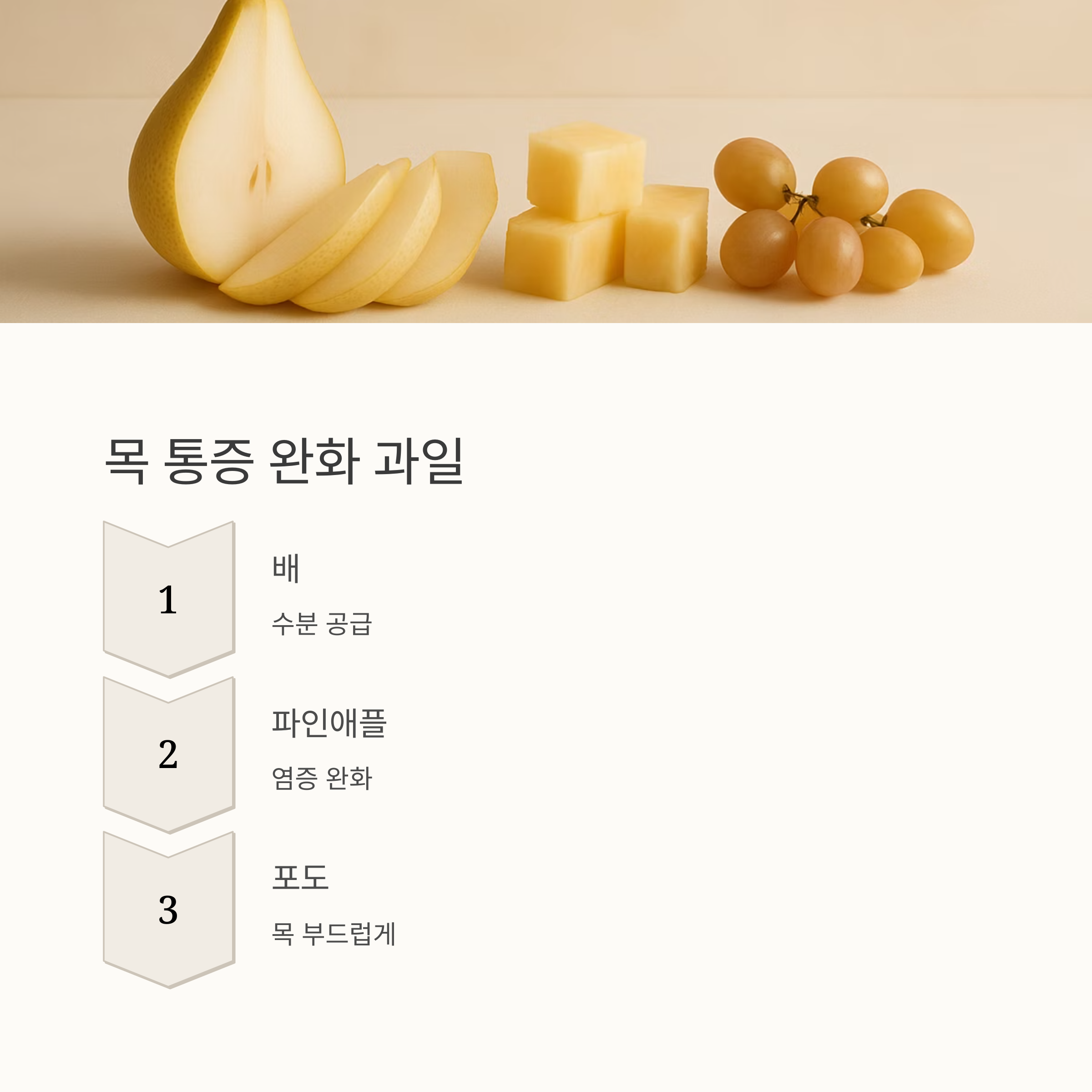 3. 배와 포도는 수분을 공급하고 목을 부드럽게 해주는 효과가 있습니다. 달콤하고 시원한 과일의 맛으로 기분 좋게 감기 증상을 이겨내세요.