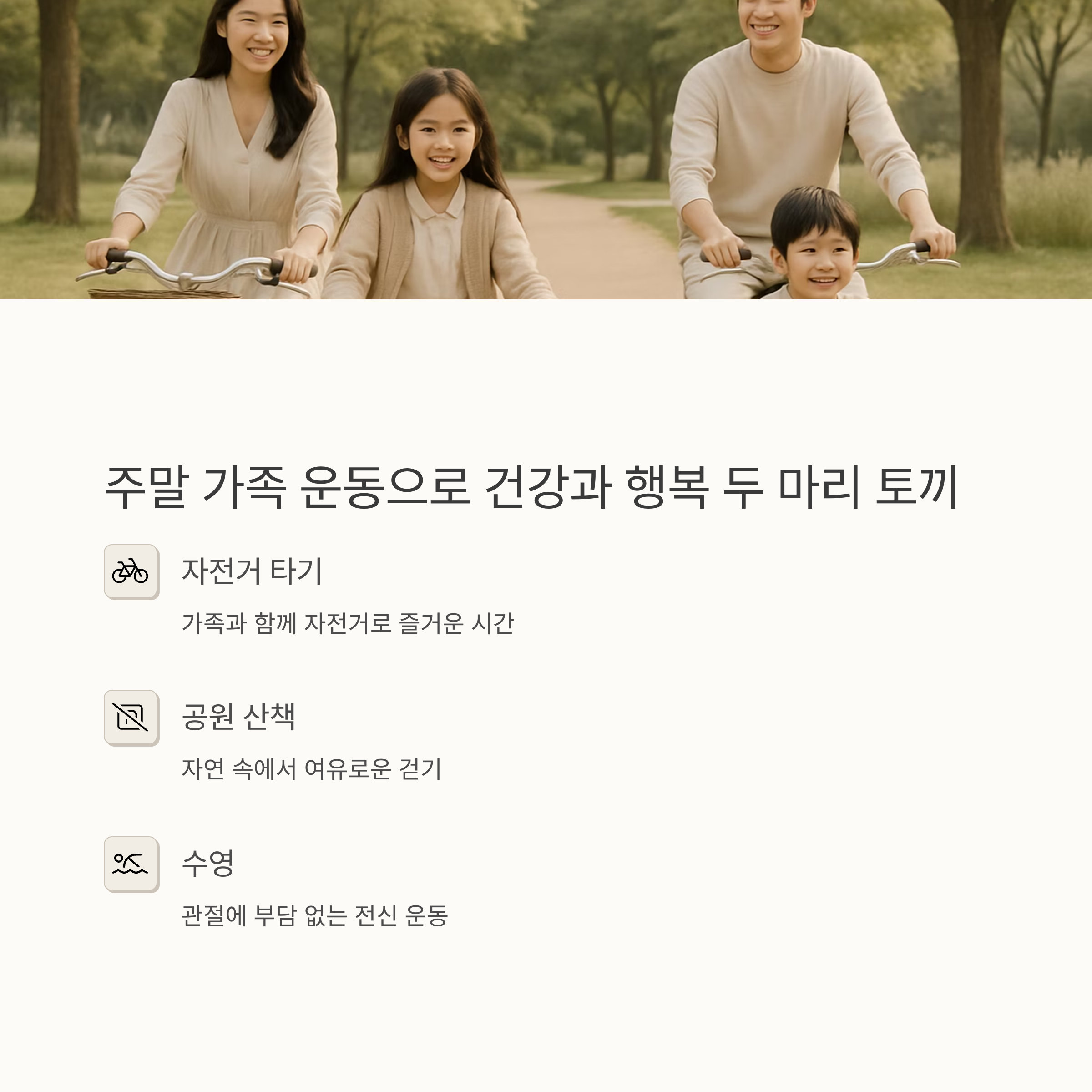 또, 주말에는 가족들과 함께 자전거를 타거나 공원에서 산책을 하면서 여유로운 시간을 보내려고 노력하고 있어요. 운동을 꾸준히 하면서 몸의 균형을 유지하고, 스트레스도 해소할 수 있을 것 같아요. 여러분은 어떤 운동을 하시나요? 저와 함께 운동 정보를 공유하면 좋을 것 같아요.