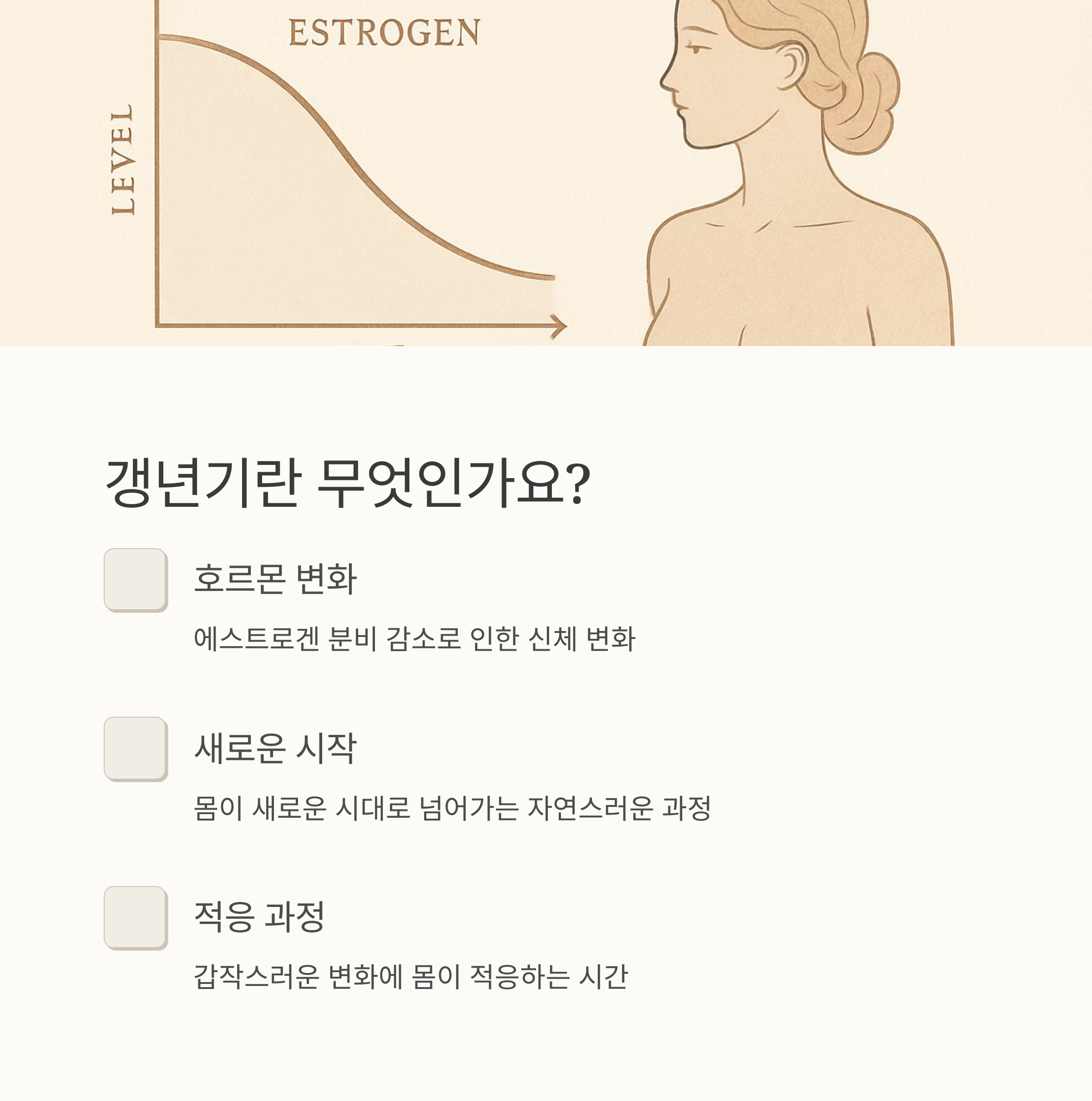 갱년기는 여성의 몸에서 에스트로겐이라는 호르몬의 분비가 줄어들면서 나타나는 변화예요. 봄에서 여름으로 넘어가는 계절처럼, 몸이 새로운 시대로 넘어가는 과정이라고 생각하면 이해하기 쉬울 거 같아요. 그런데 이 과정에서 몸이 갑작스럽게 변화에 적응하지 못해서 안면홍조, 야간 발한, 불면증 등의 다양한 증상이 나타나게 되는 거죠. 마치 갑작스러운 날씨 변화에 몸이 적응하지 못하는 것과 비슷하다고 할 수 있겠네요.
