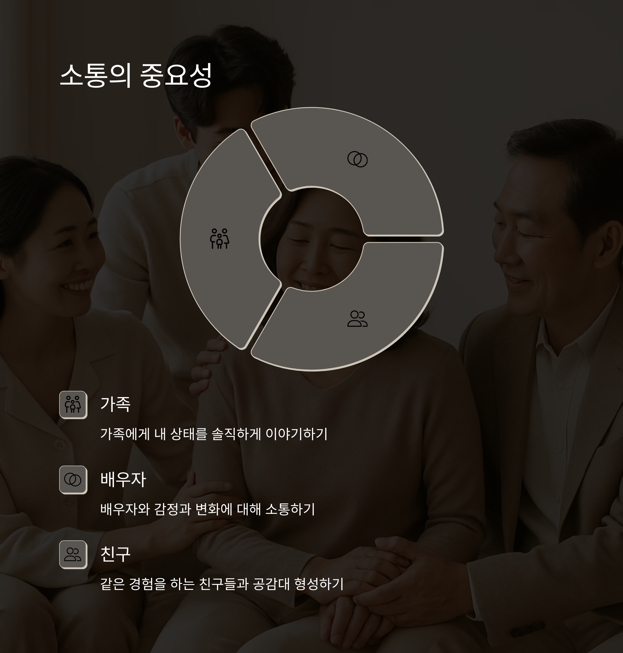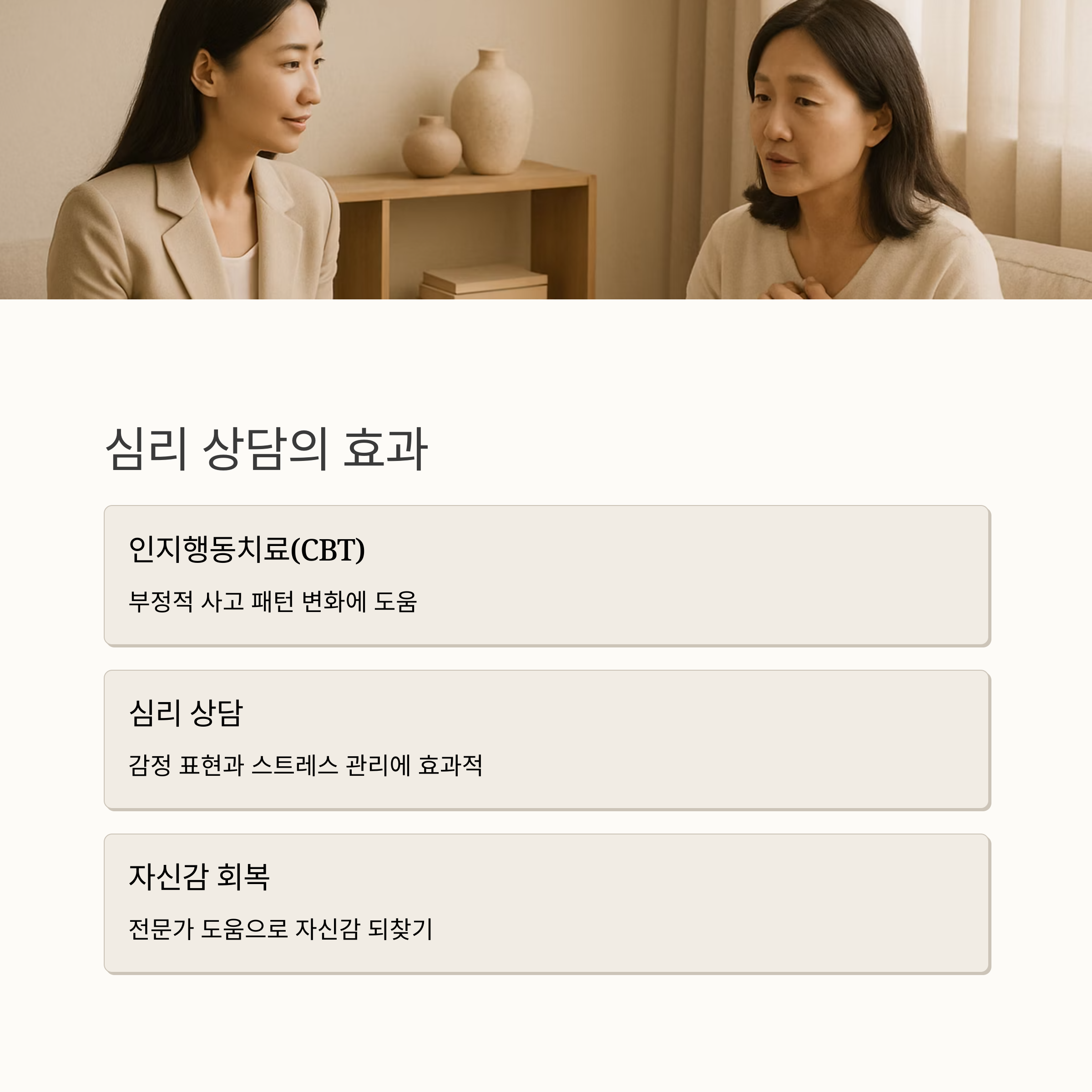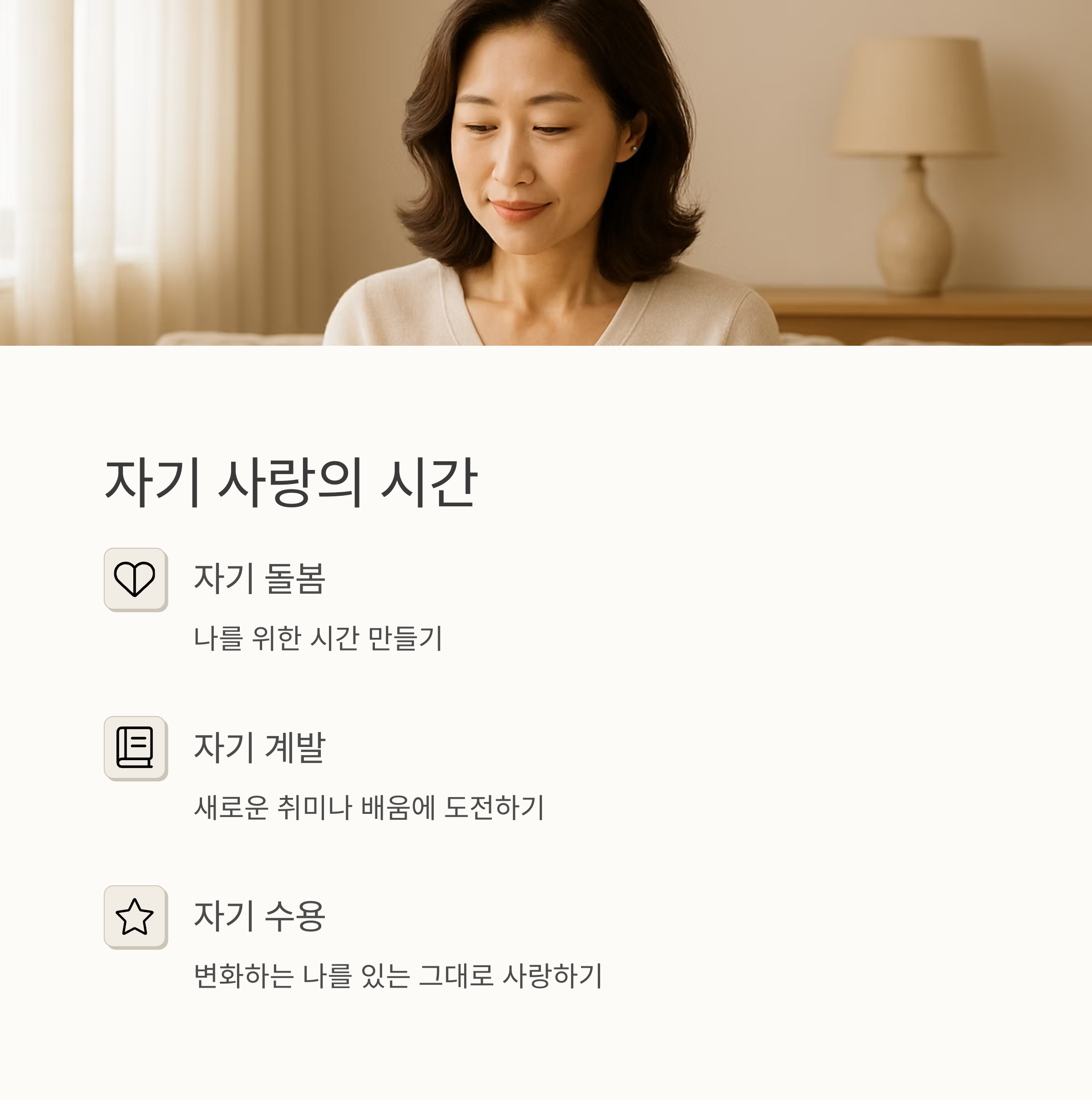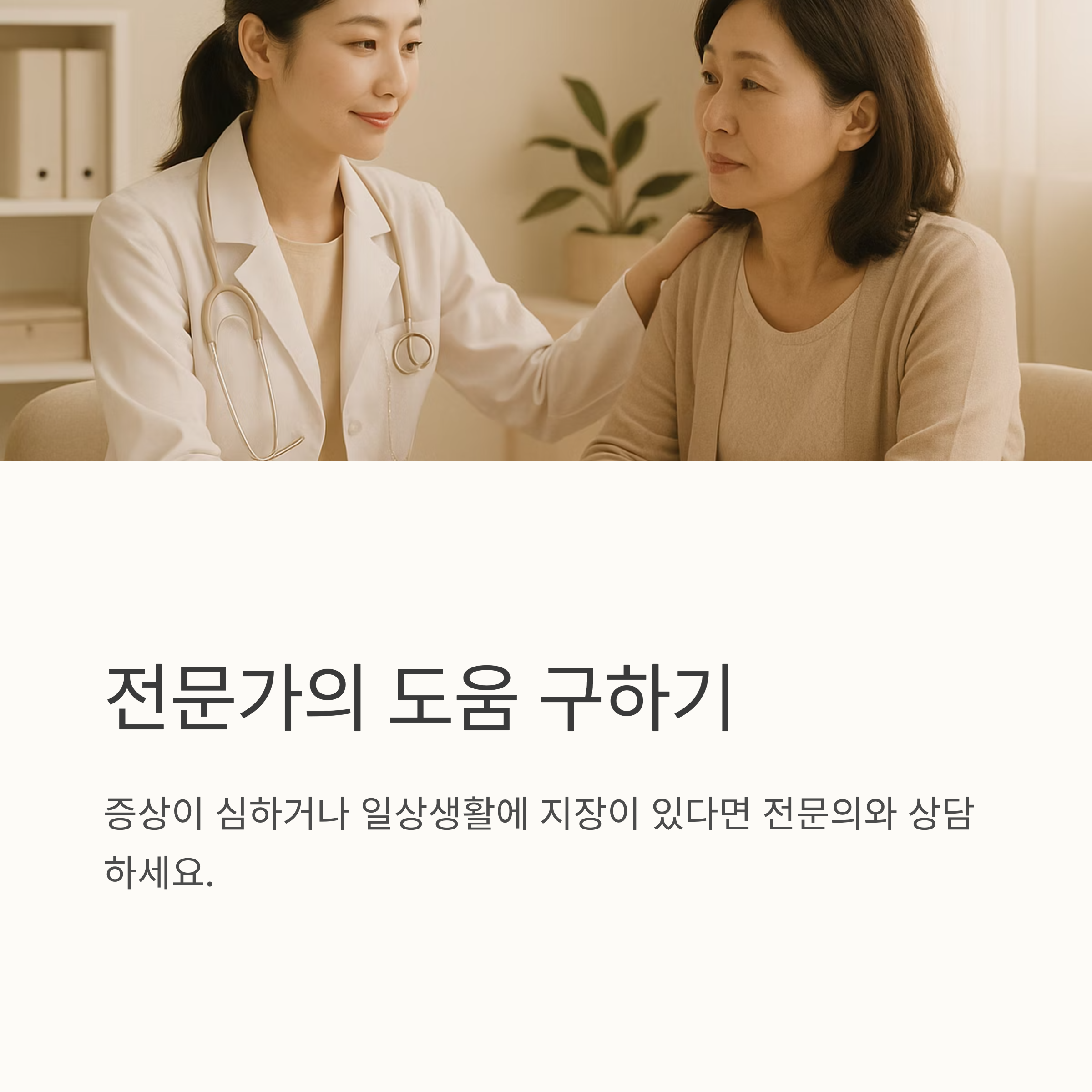 혹시 힘든 감정이 계속된다면 전문가의 도움을 받는 것도 좋은 방법입니다. 인지행동치료(CBT)나 심리 상담을 통해 갱년기의 어려움을 극복하고, 자신감을 회복할 수 있어요. 갱년기는 새로운 시작을 위한 전환점이라고 생각해 보세요. 나를 위한 시간을 갖고, 자신을 더욱 사랑하고 소중하게 여기는 시간을 가지세요. 가장 중요한 것은 ‘나’ 자신에게 집중하는 거예요. 갱년기를 통해 더욱 건강하고 행복한 당신의 모습을 발견할 수 있을 거예요.