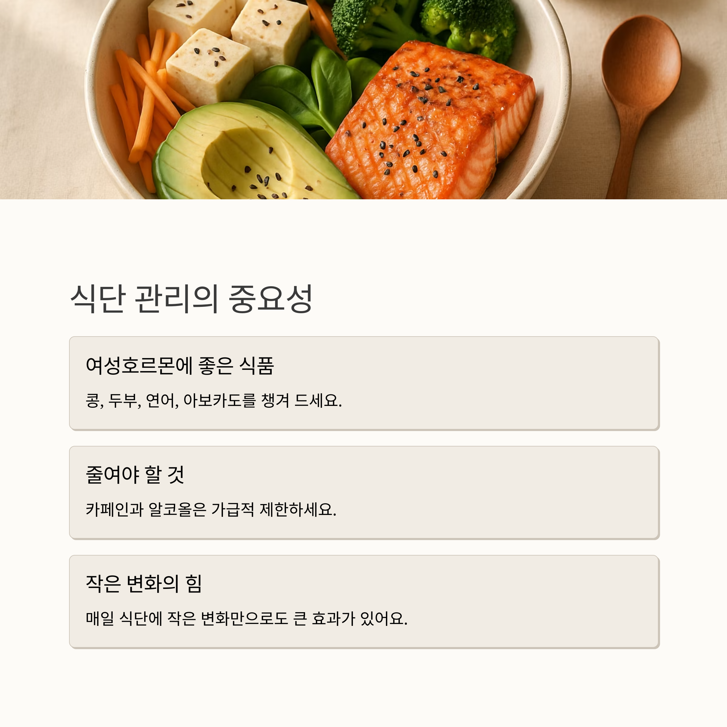 1. 식단 관리: 콩, 두부, 연어, 아보카도 같은 여성호르몬에 좋은 음식을 챙겨 먹어 보세요. 카페인과 알코올은 가급적 줄이는 게 좋아요. 매일 먹는 식단에 조금씩 변화를 주는 것 만으로도 큰 변화를 가져올 수 있어요.