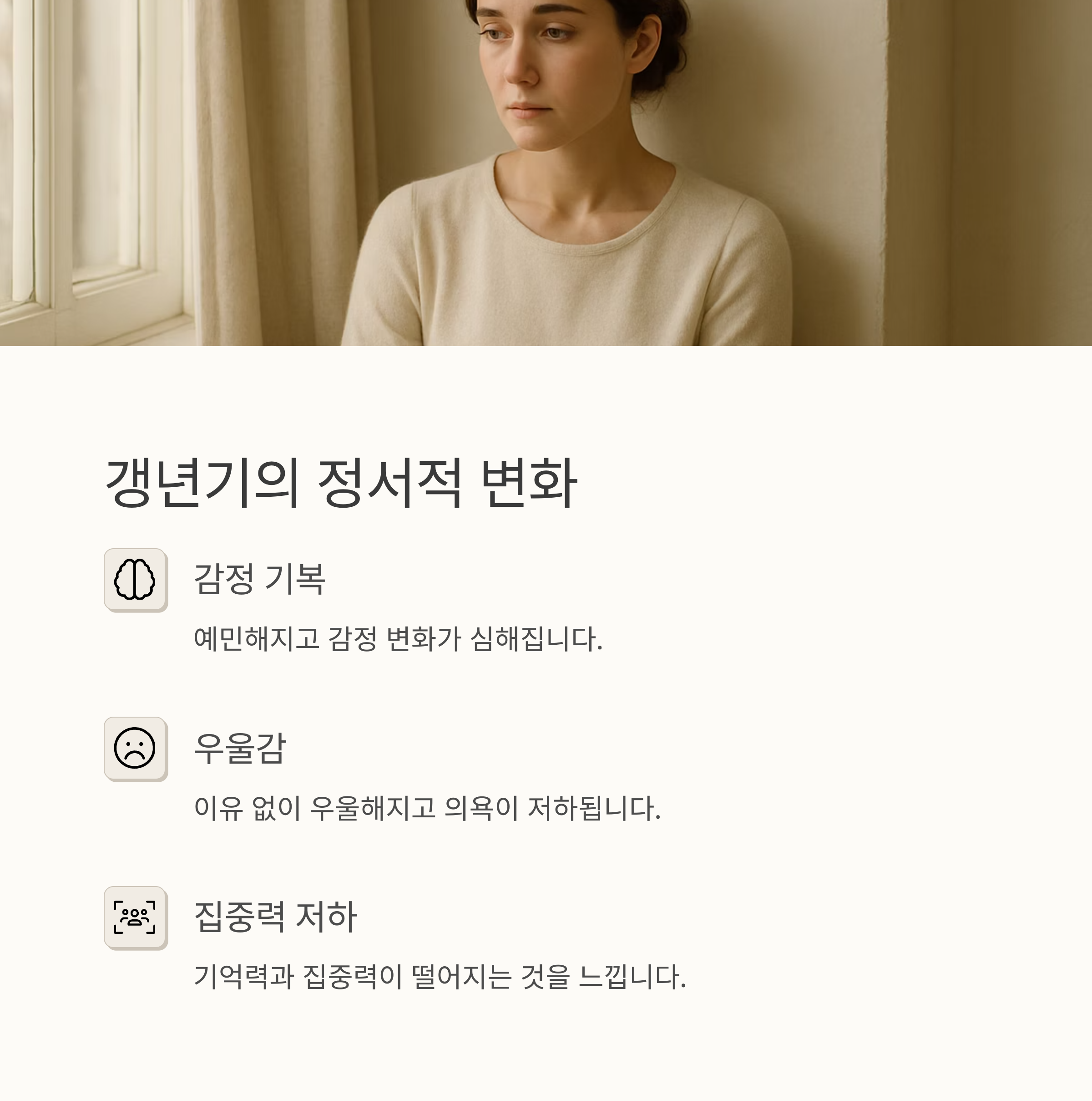 갱년기는 몸의 변화뿐 아니라 마음의 변화도 동반하는 시기입니다. 갑작스러운 감정 변화, 우울감, 불안감에 시달릴 수 있지만, 이 또한 자연스러운 과정입니다. 자신의 감정에 솔직해지고, 긍정적인 생각을 유지하는 것이 중요해요. 명상, 요가, 산책 등 마음을 편안하게 해주는 활동을 꾸준히 해보세요.