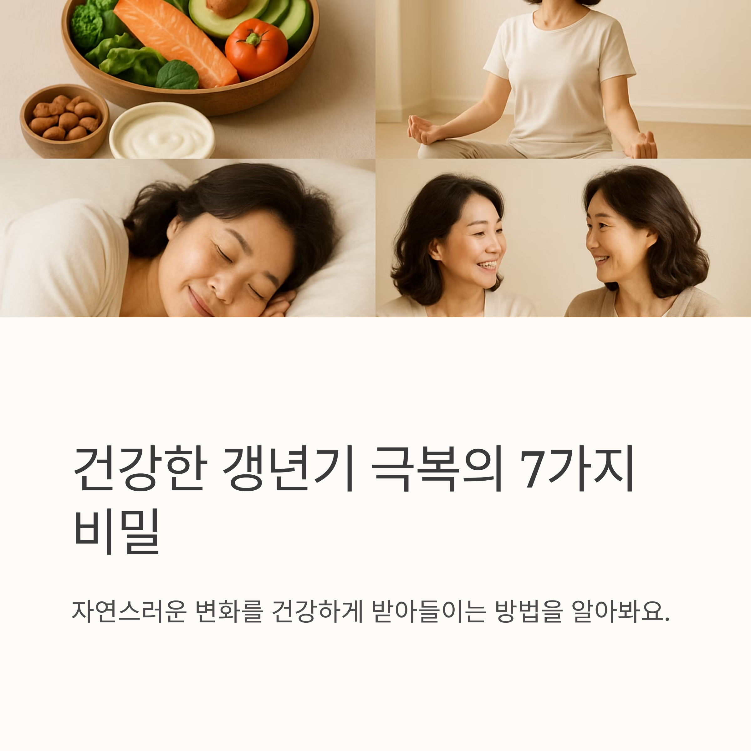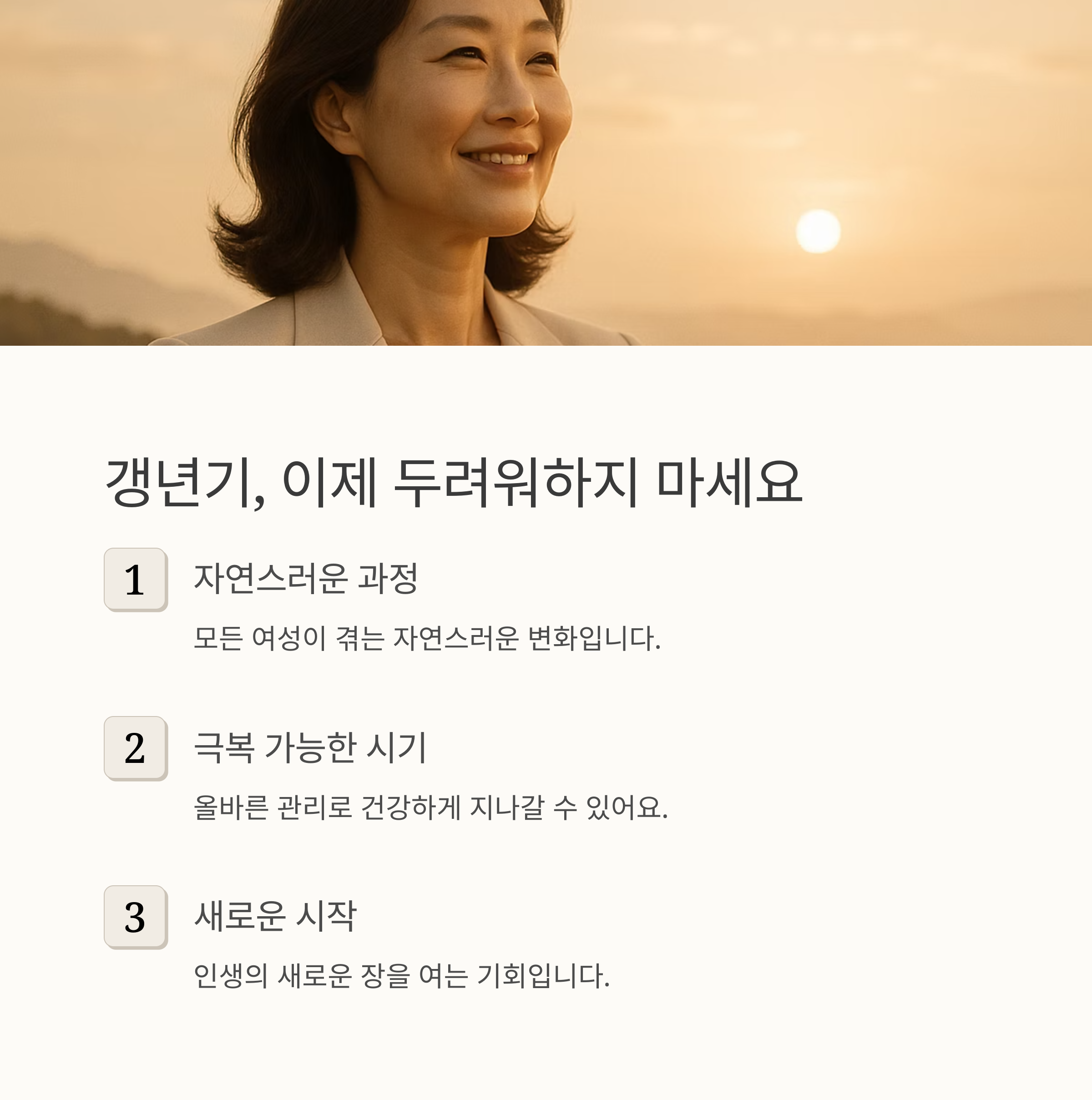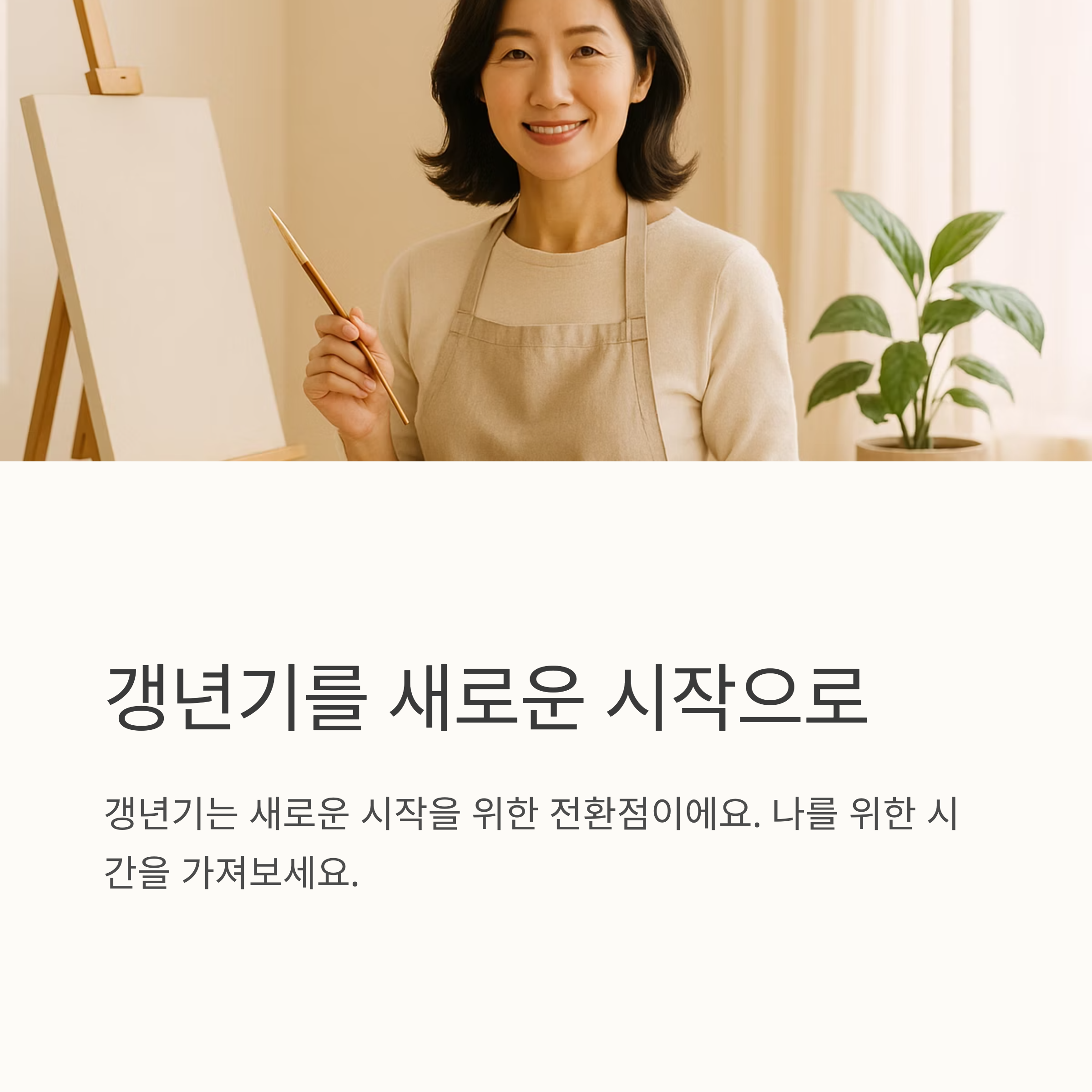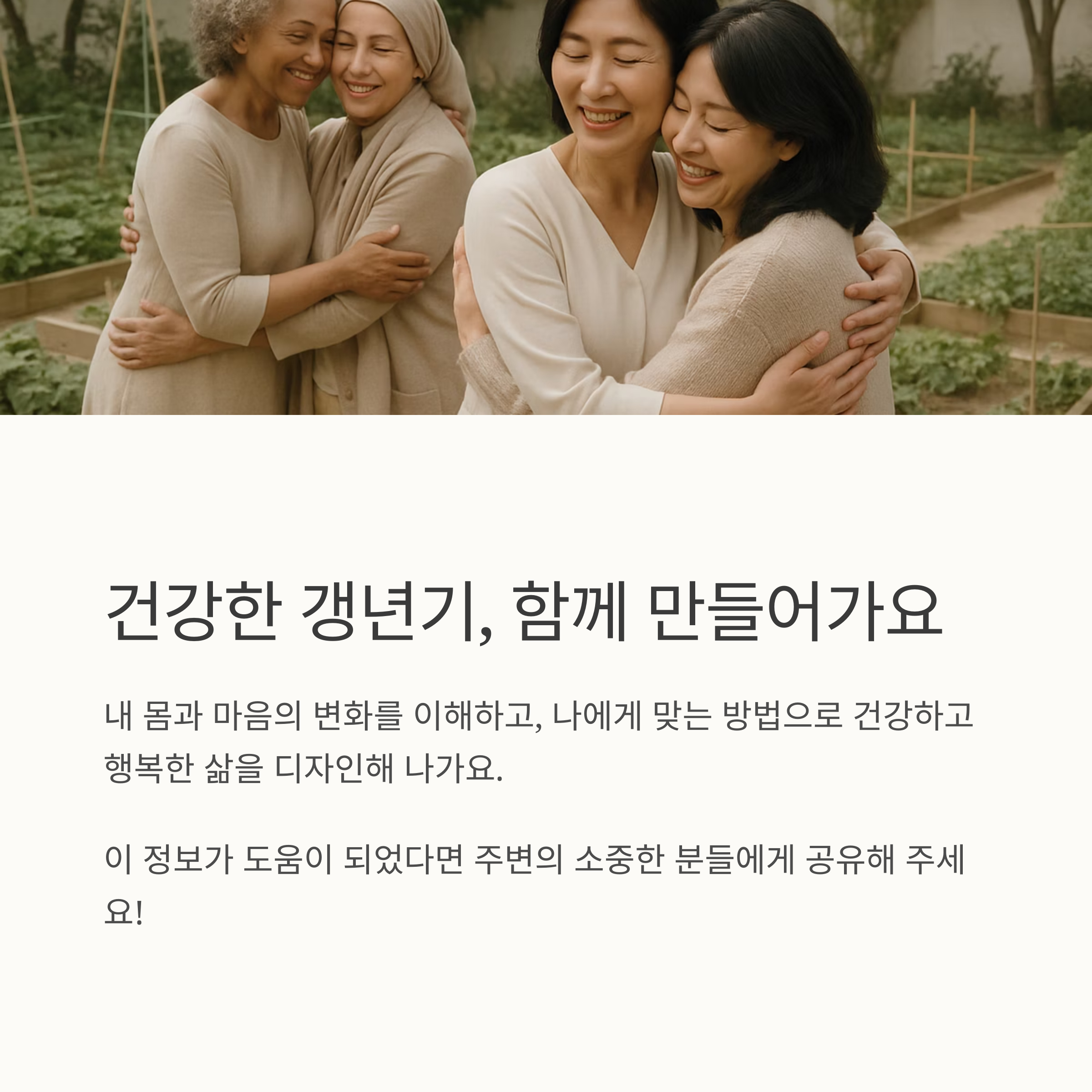 갱년기, 이제 두려워하지 마세요. 내 몸과 마음의 변화를 이해하고, 나에게 맞는 방법을 찾아 건강하고 행복한 삶을 디자인해 나가요. 우리는 충분히 잘 해낼 수 있습니다.