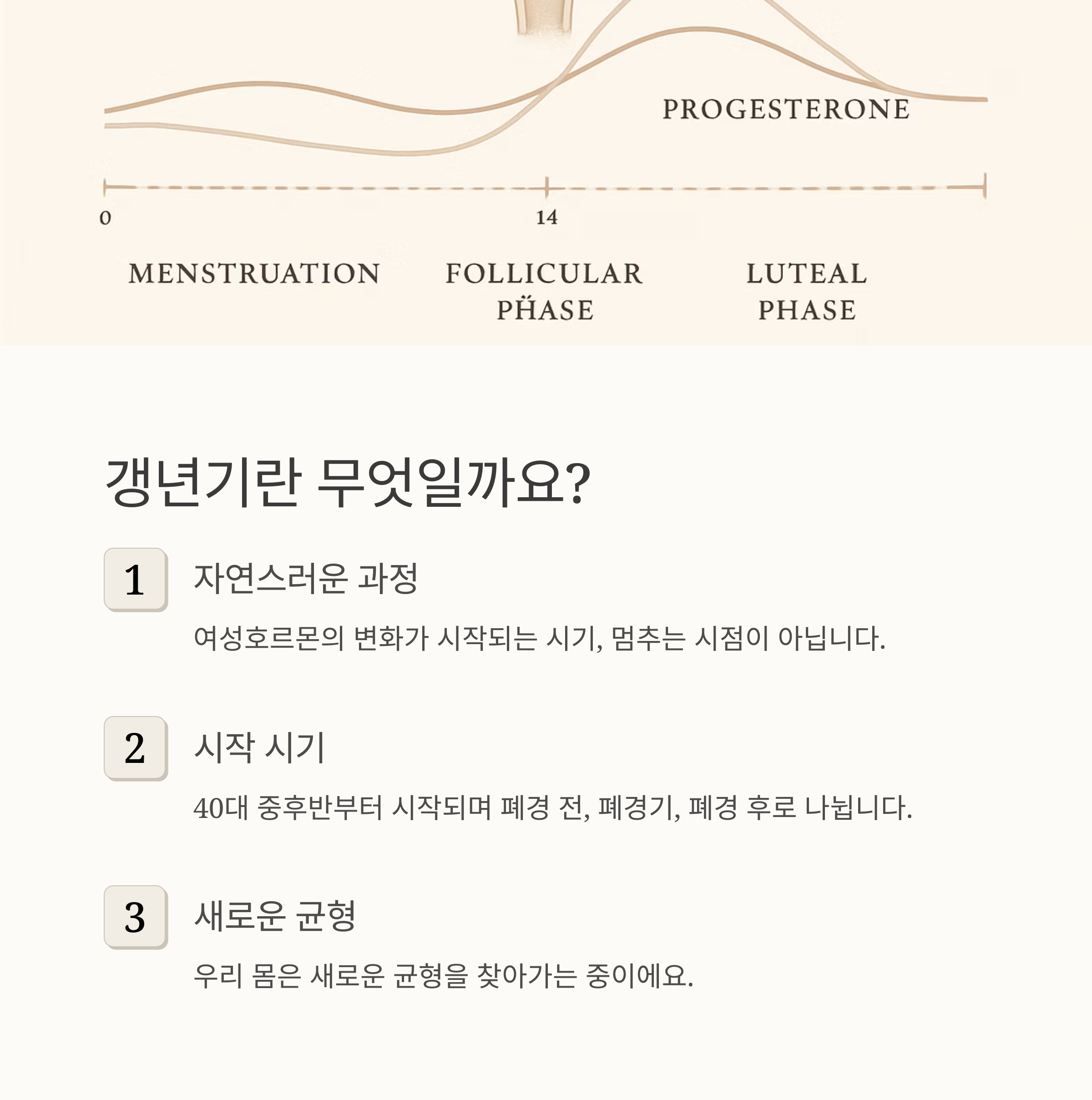 40대 중후반부터 시작되는 갱년기는 폐경 전, 폐경기, 폐경 후로 나뉘는데요, 생리 주기가 불규칙해지거나, 감정 기복이 심해지고, 잠 못 이루는 밤을 보내는 등의 변화를 경험하게 돼요. 하지만 이 모든 변화는 자연스러운 과정이고, 우리는 충분히 이 시기를 잘 헤쳐나갈 수 있어요. 조금 불편한 증상들이 나타나더라도, ‘아, 내 몸이 변하고 있구나’ 하고 받아들이고, 긍정적인 마음으로 새로운 변화에 적응해 나가는 자세가 중요해요.