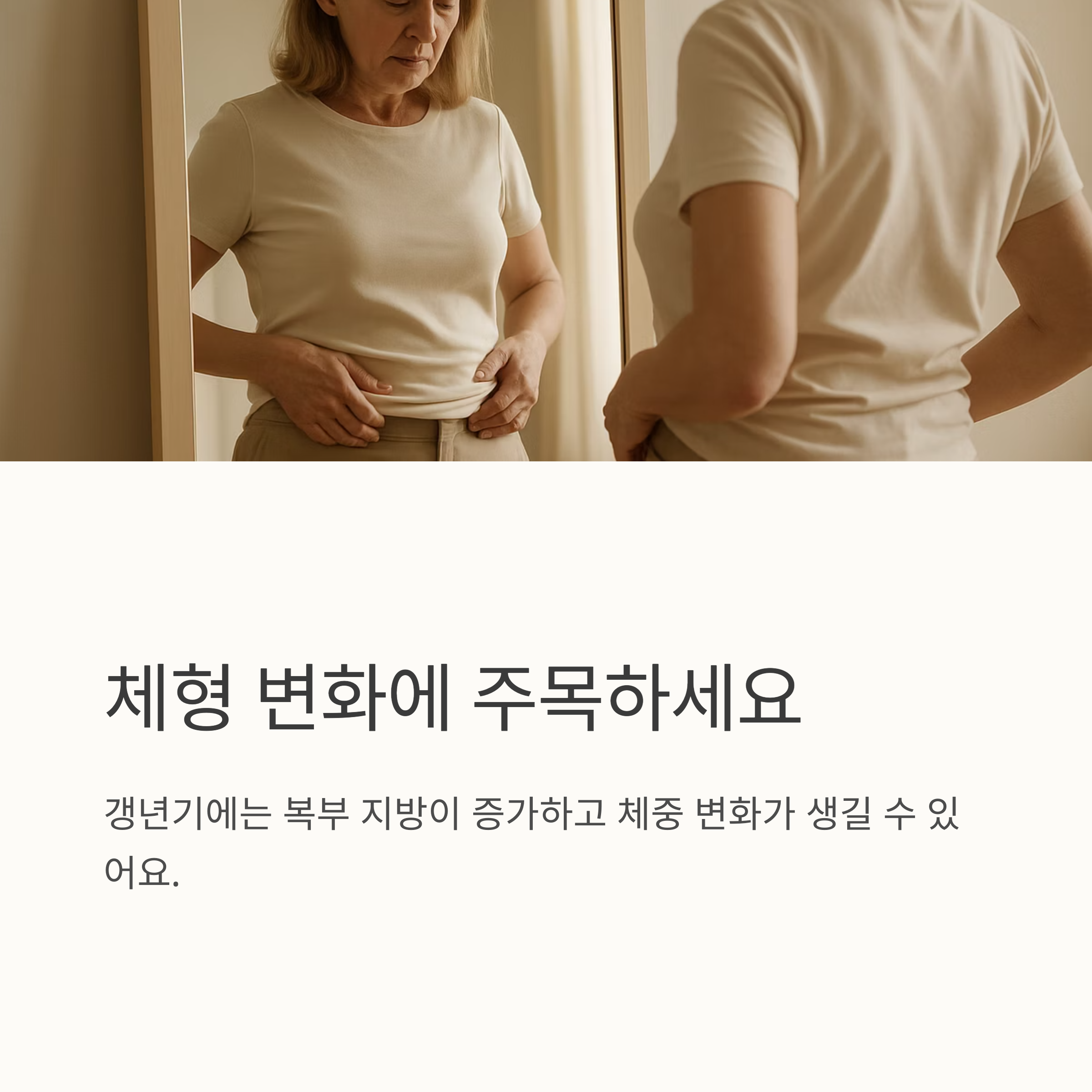 체중 변화도 겪을 수 있는데, 특히 뱃살이 늘어나는 경우가 많아요. 이 모든 변화는 자연스러운 과정이지만, 증상이 너무 심하거나 일상생활에 지장을 줄 정도라면 전문의의 도움을 받는 것이 좋답니다. 걱정하지 마세요. 혼자가 아니니까요.
