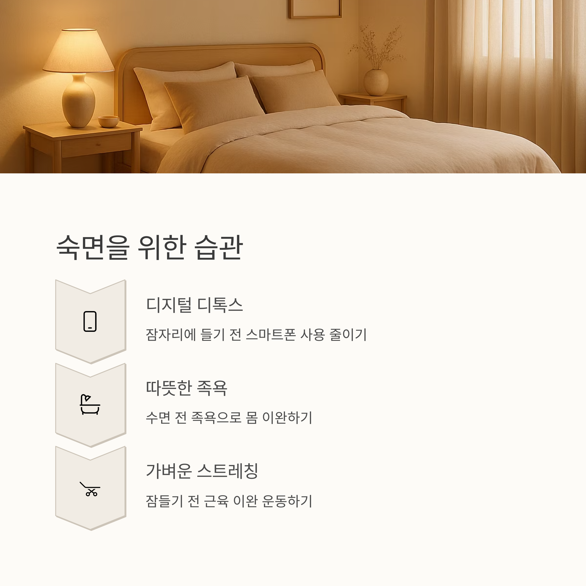 3. 숙면 습관: 잠자리에 들기 전 스마트폰 사용은 줄이고, 따뜻한 물로 족욕을 하거나 스트레칭을 해보는 것도 좋아요. 숙면을 위해 수면 영양제를 복용하는 것도 방법입니다.