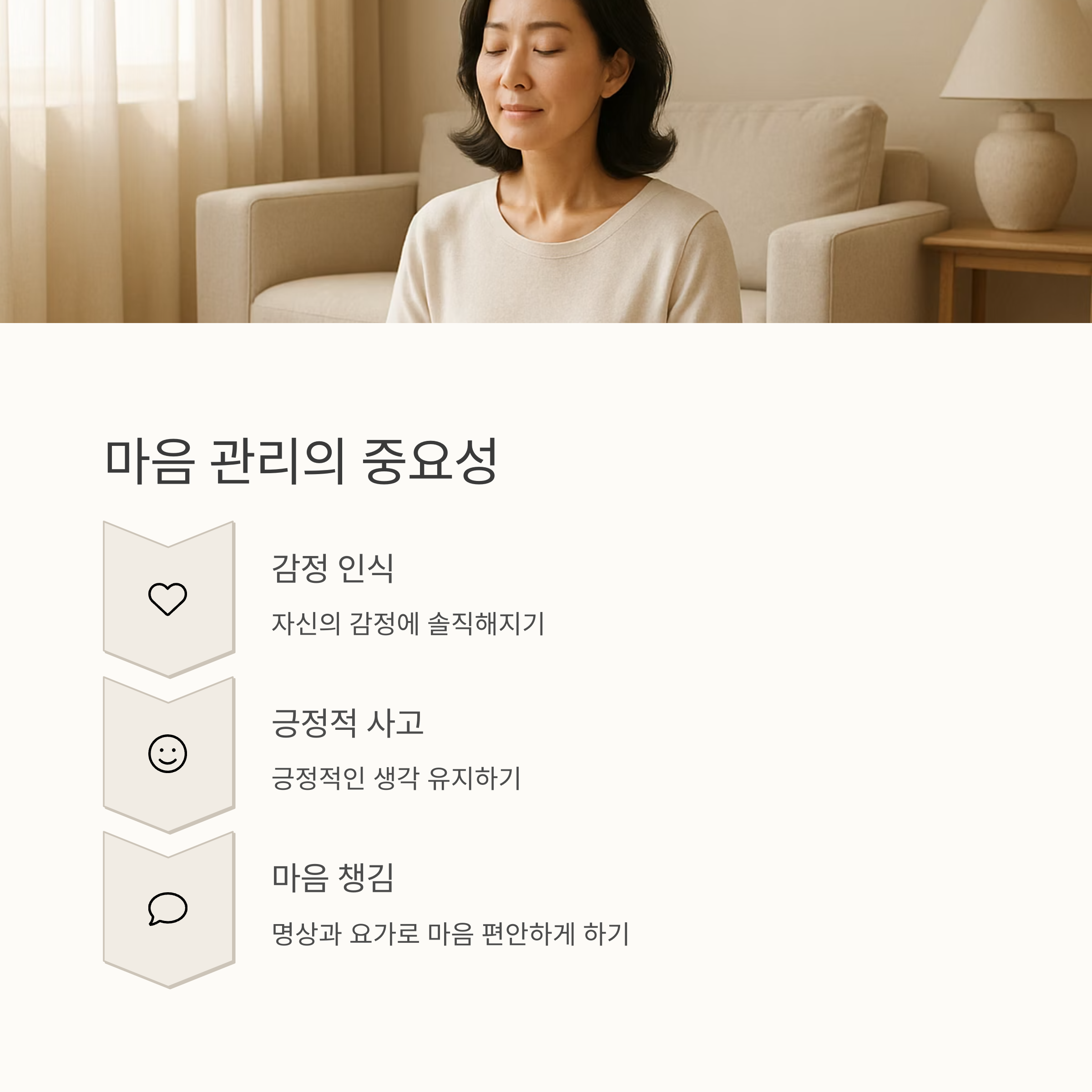 갱년기는 몸의 변화뿐 아니라 마음의 변화도 동반하는 시기입니다. 갑작스러운 감정 변화, 우울감, 불안감에 시달릴 수 있지만, 이 또한 자연스러운 과정입니다. 자신의 감정에 솔직해지고, 긍정적인 생각을 유지하는 것이 중요해요. 명상, 요가, 산책 등 마음을 편안하게 해주는 활동을 꾸준히 해보세요.