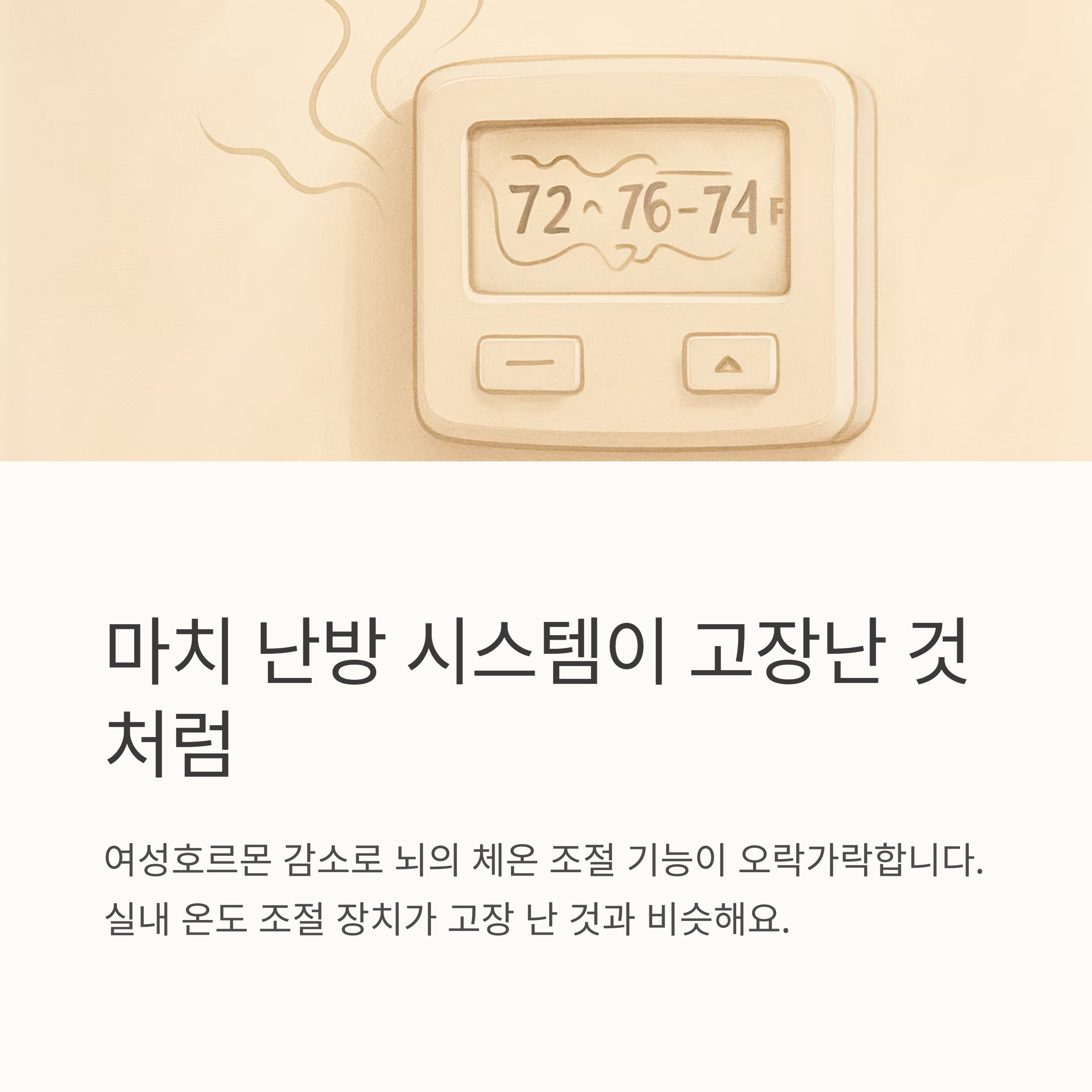 갱년기 열 오르는 증상은 단순히 더운 날씨 때문이 아니라, 몸속 여성호르몬의 변화 때문이랍니다. 나이가 들면서 여성호르몬인 에스트로겐의 양이 줄어들면서 뇌의 체온 조절 중추가 제대로 작동하지 않아 생기는 현상이에요. 난방 시스템이 고장 나서 실내 온도가 오락가락하는 것과 비슷하다고 생각하면 이해가 쉬울 거예요.