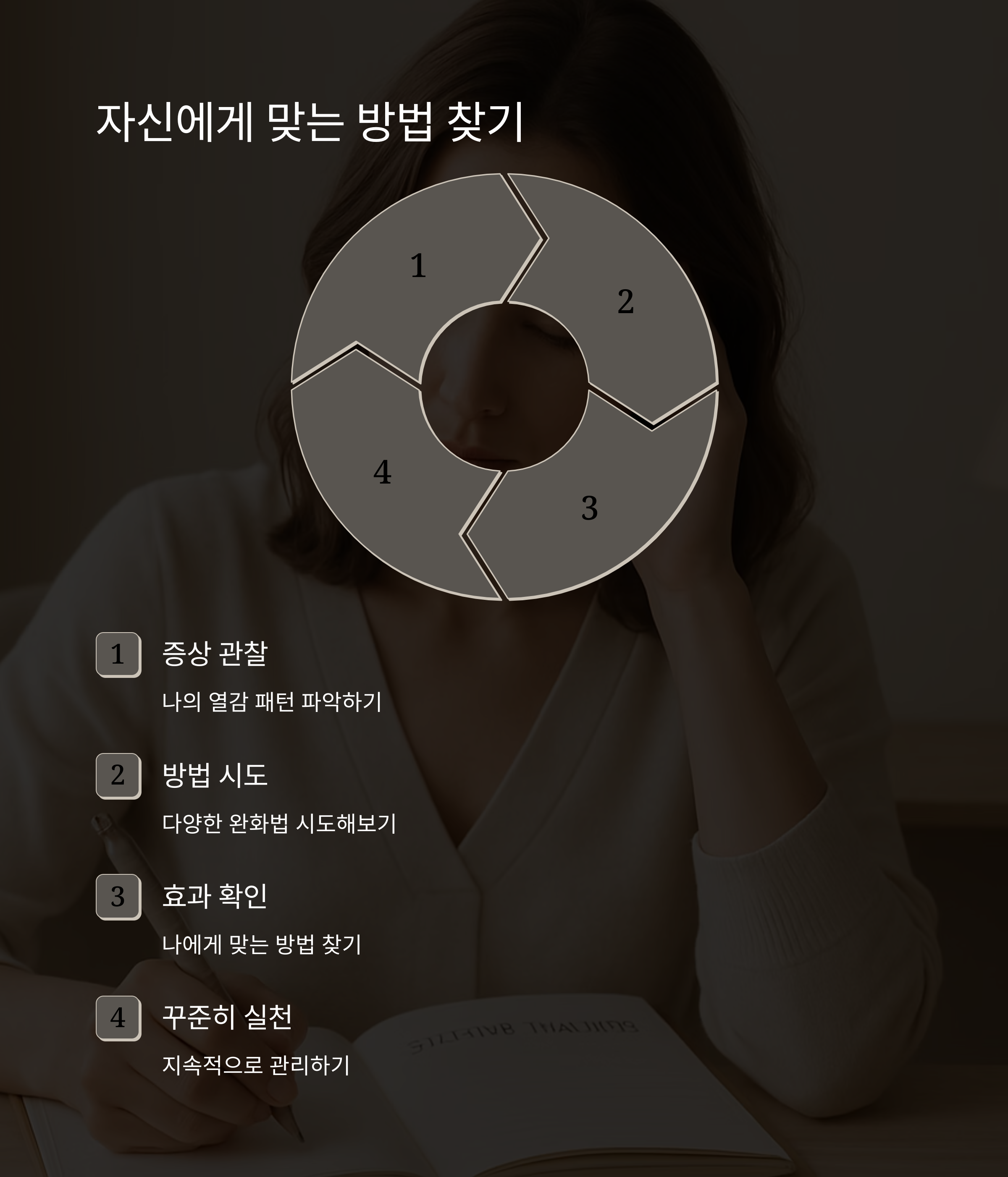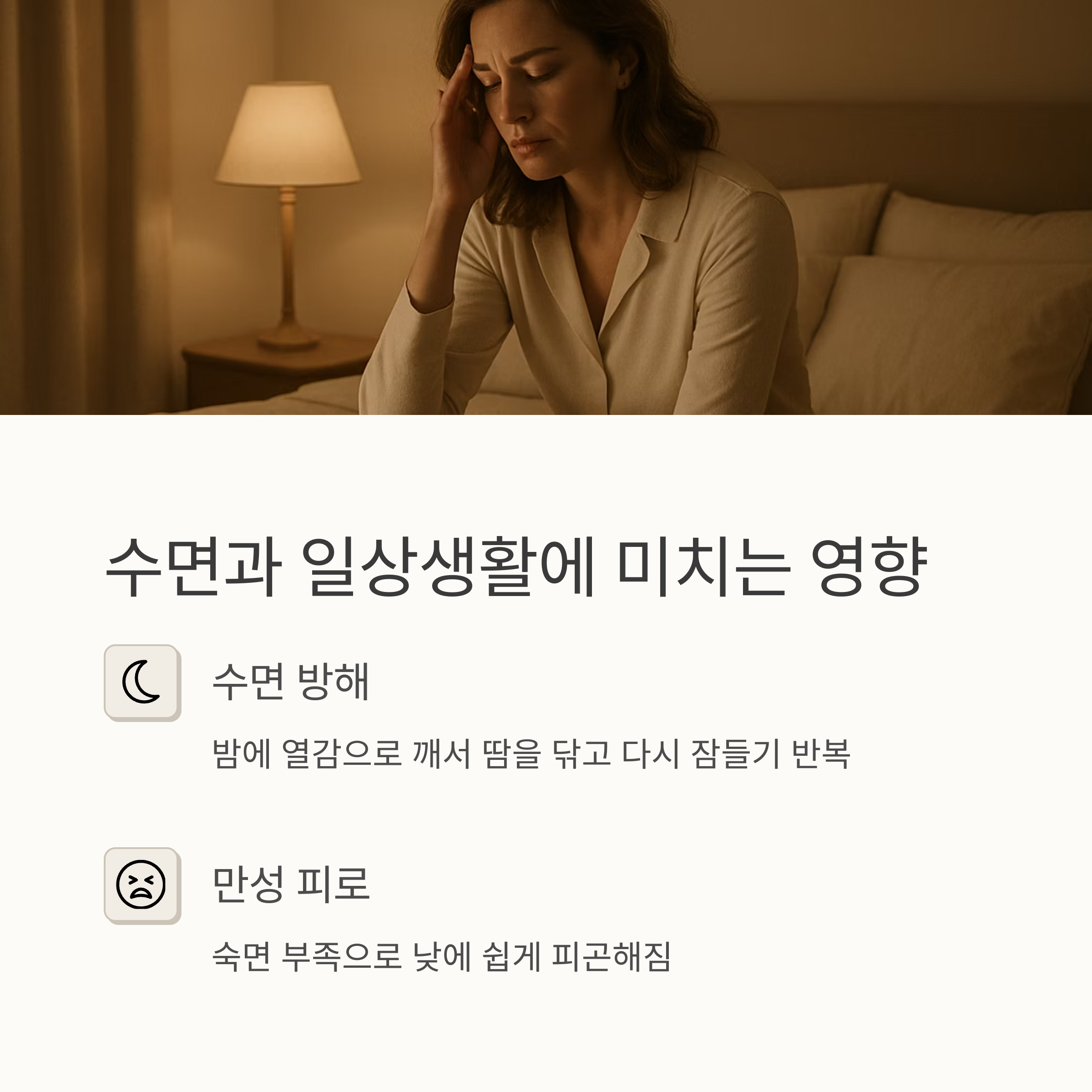 저는 특히 밤에 열이 오르는 게 가장 힘들었어요. 잠옷을 갈아입고 이불을 걷어차도 땀이 계속 나서 잠을 설치곤 했죠. 그리고 낮에는 쉽게 피곤해지고 집중력이 떨어져 일상생활에 어려움을 느꼈어요. 하지만 이러한  갱년기 열 오르는 증상들은 갱년기의 자연스러운 변화라는 것을 알고 나니 조금씩 마음의 안정을 찾을 수 있었답니다. 열감과 함께 나타나는 다른 증상들을 잘 관찰하고, 나에게 맞는 관리 방법을 찾는 것이 중요해요.