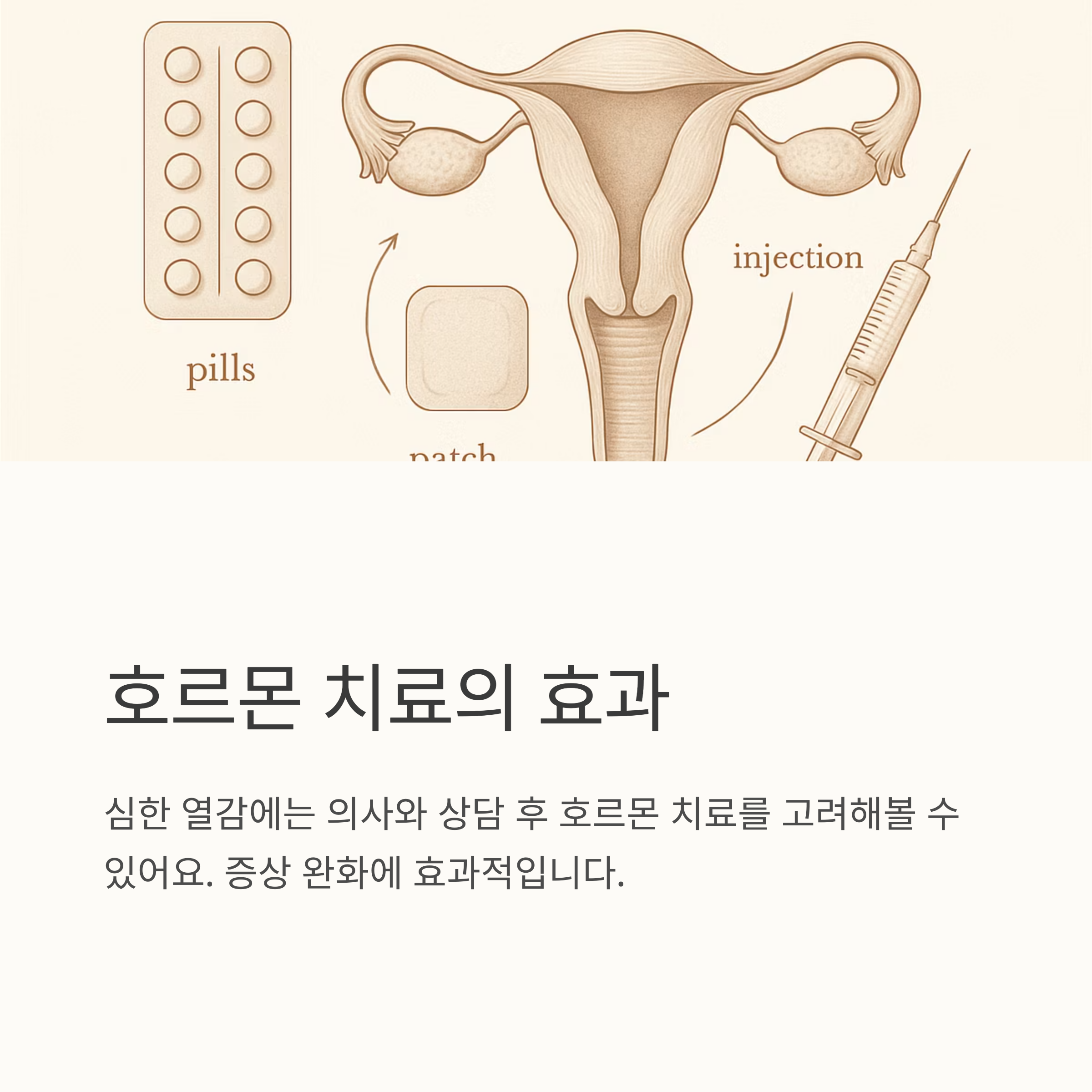 저는 처음에는 민간요법으로 열감을 관리하려고 했지만, 증상이 호전되지 않아 병원을 찾았어요. 의사선생님과 상담 후, 호르몬 치료를 시작했고, 그 결과 열감이 상당히 줄어들었어요. 또, 한방 치료도 도움이 될 수 있습니다.