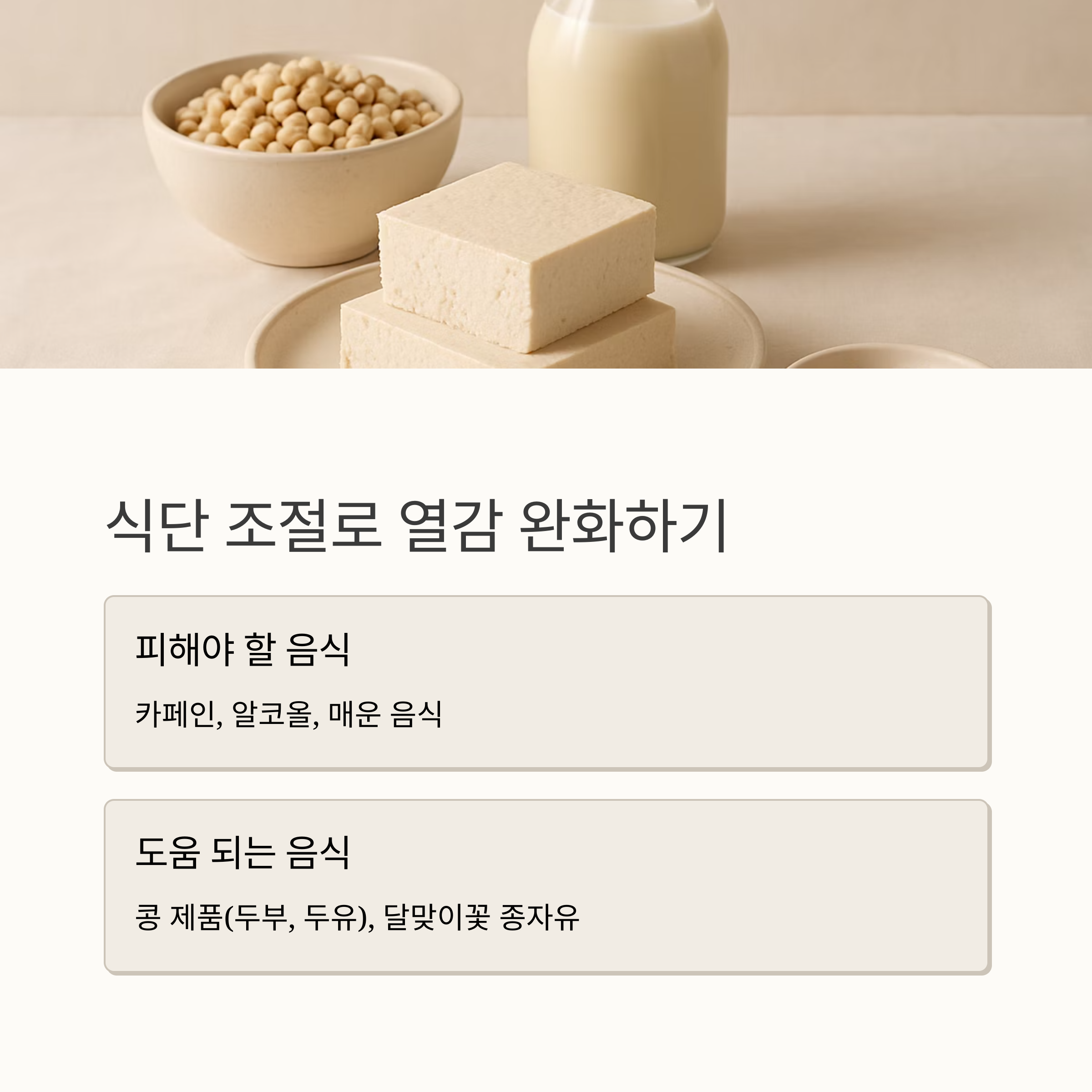 갱년기 열감을 해결하는 방법은 여러 가지가 있답니다. 우선, 식단 조절이 중요해요. 카페인이나 알코올, 매운 음식은 몸에 열을 더해 증상을 악화시킬 수 있으니 피하는 게 좋아요. 대신 콩에 풍부한 이소플라본이나 달맞이꽃 종자유에 들어있는 감마리놀렌산이 도움이 될 수 있어요. 저는 콩으로 만든 두부나 두유를 자주 먹고, 달맞이꽃 종자유 캡슐을 꾸준히 섭취했어요.