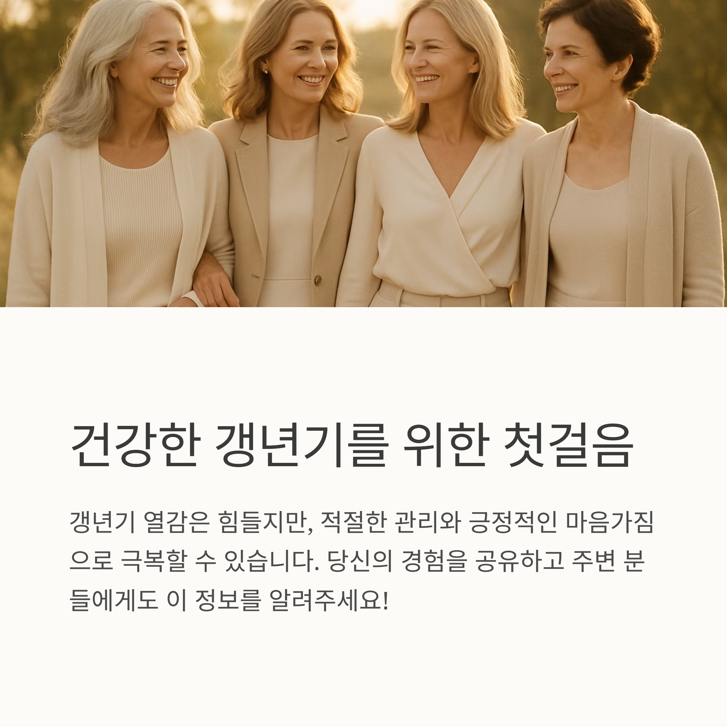 갱년기 열감은 힘든 과정이지만, 적절한 관리와 긍정적인 마음가짐으로 충분히 극복할 수 있어요. 이 글에서 소개한 방법들을 참고하여 자신에게 맞는 관리법을 찾고 건강한 갱년기를 보내시길 바랍니다. 건강하고 행복한 삶을 위해 꾸준히 노력하는 여러분을 응원합니다. 조금만 더 힘내세요!
