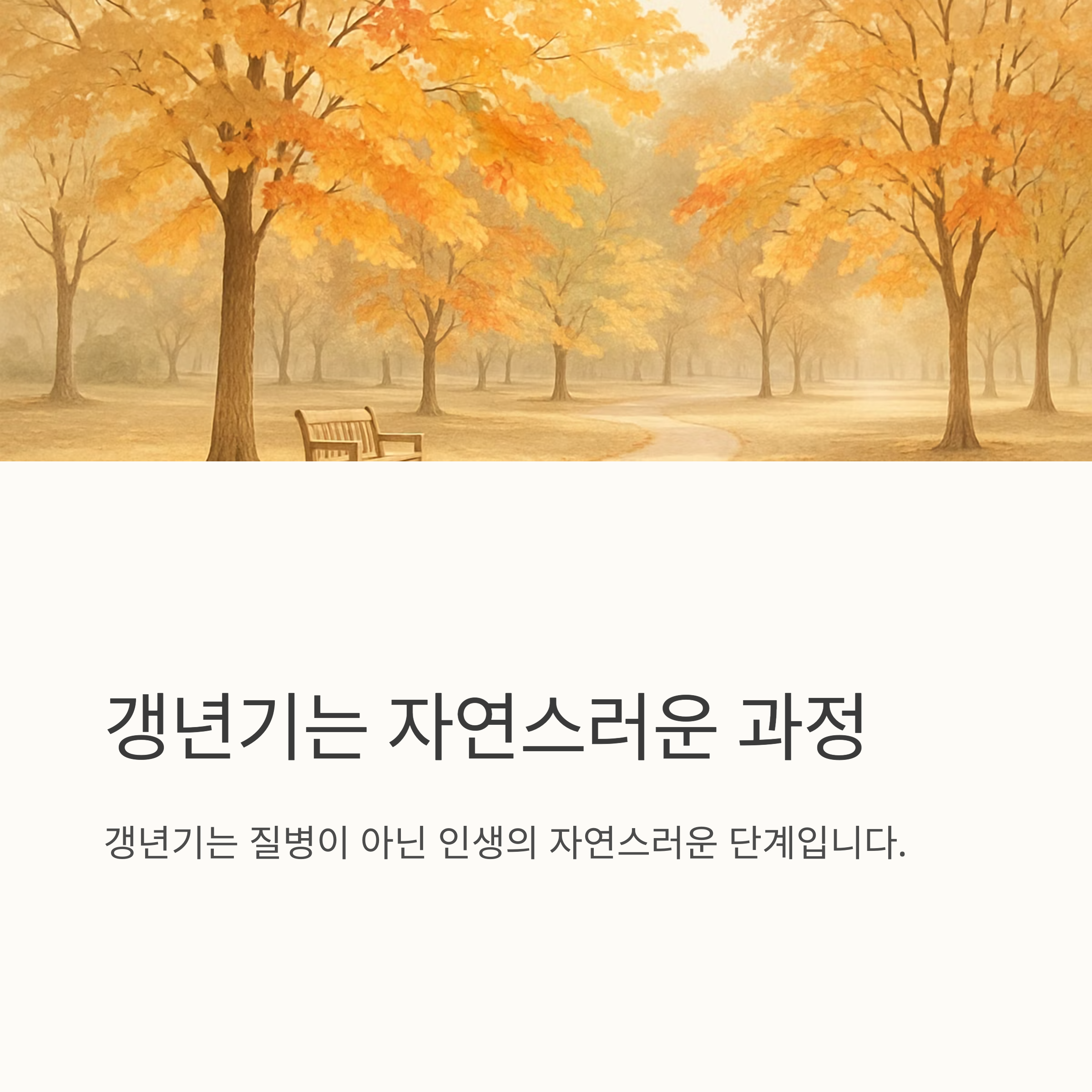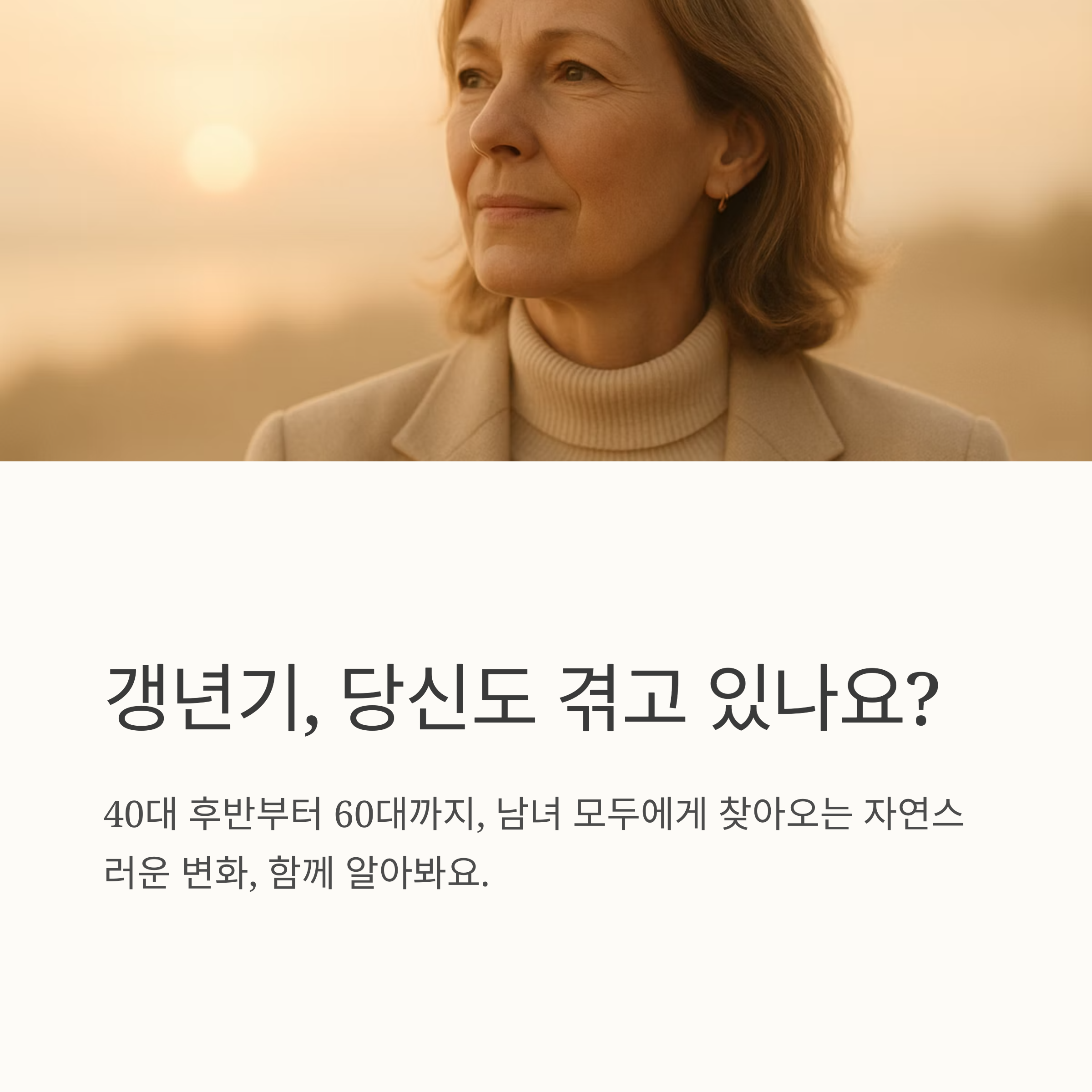 갱년기는 단순히 나이 듦의 문제가 아니에요. 여성의 경우, 에스트로겐 감소가 주요 원인이고요, 남성은 테스토스테론 감소로 인해 나타나는 변화입니다. 그래서 단순히 ‘나이가 들었나 보다’ 하고 넘어가기에는 너무 아까운, 중요한 시기라고 할 수 있죠. 몸의 변화는 물론이고, 감정의 변화도 크게 느끼실 거예요.