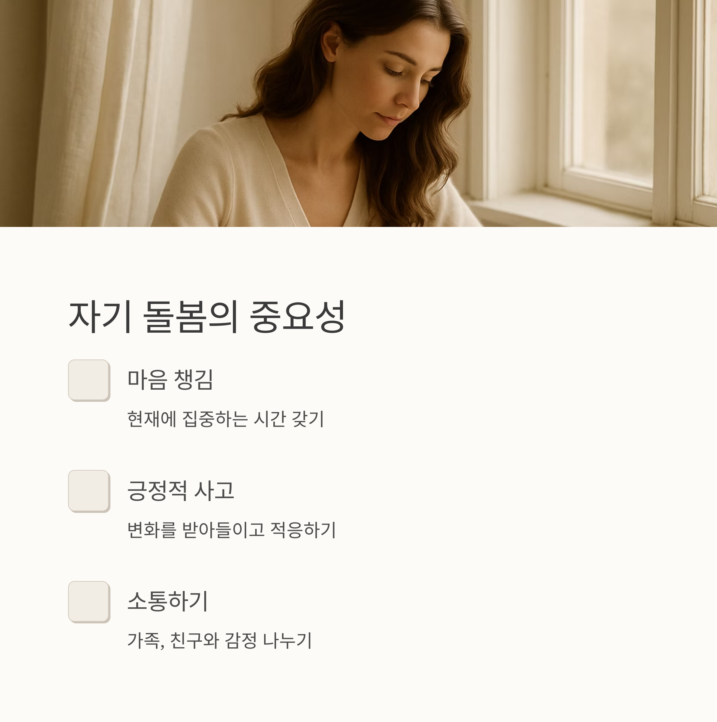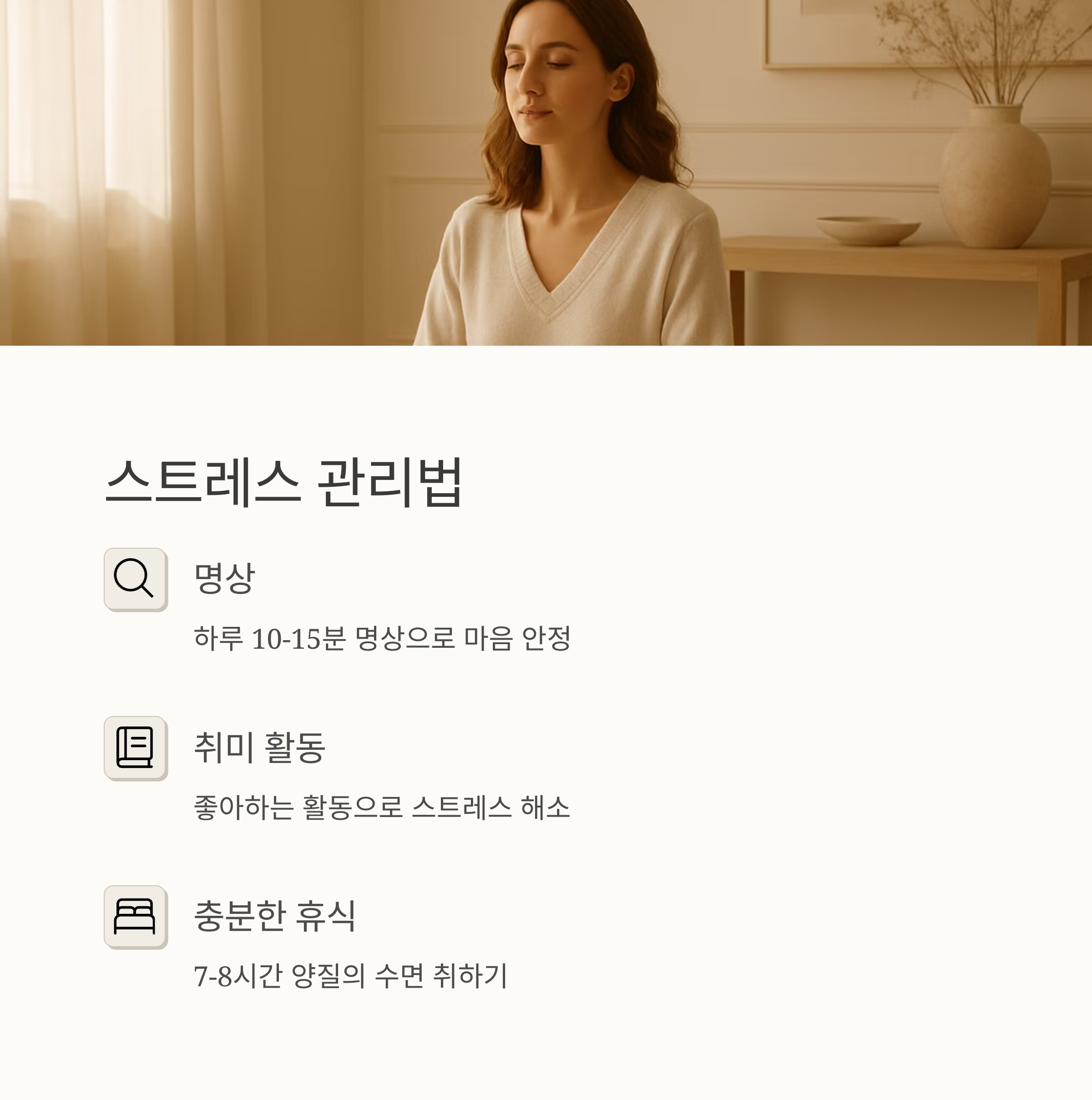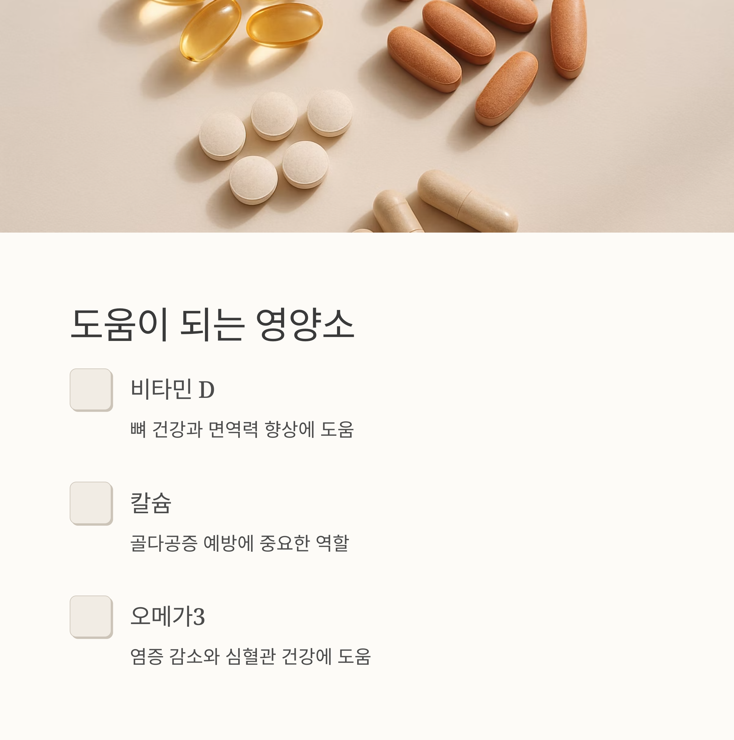 그리고 스트레스 관리도 중요해요. 명상이나 요가, 취미 활동 등으로 스트레스를 줄이도록 노력하고, 충분한 휴식을 취하는 것도 잊지 마세요. 균형 잡힌 식단도 중요합니다. 채소 위주의 식단에 단백질을 충분히 섭취하는 것을 추천하고요, 필요하다면 비타민D, 칼슘, 오메가3 등 건강 보조제를 섭취하는 것도 도움이 될 수 있어요. 하지만 무엇보다 중요한 것은 나 자신에게 집중하는 시간을 갖는 거예요. 내가 좋아하는 일을 하면서 행복을 느끼고 스트레스를 해소하는 시간을 꼭 만드세요.