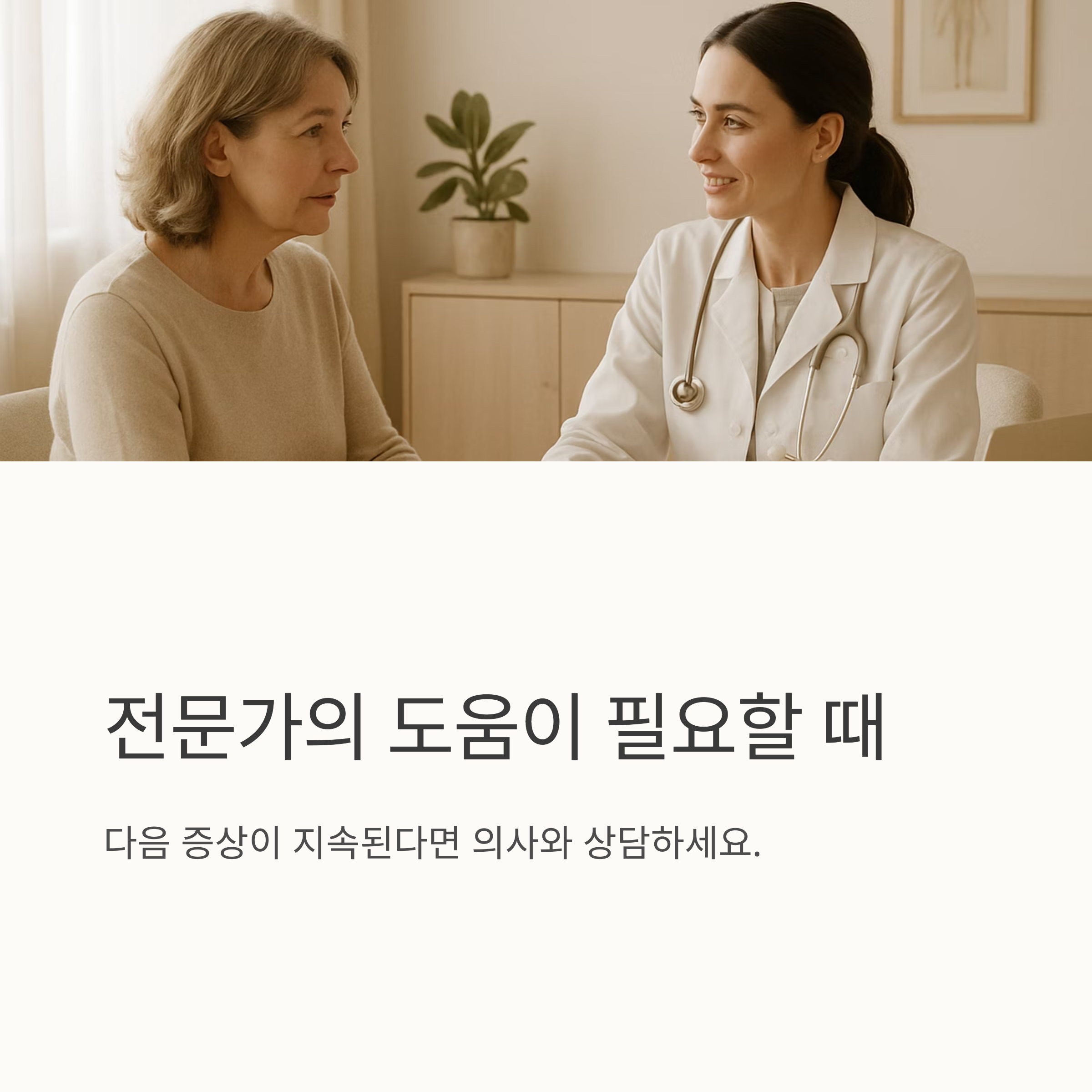 갱년기 증상이 심하거나 일상생활에 지장을 줄 정도라면 전문가의 도움을 받는 것이 좋습니다. 우울감이나 피로감이 심하고 지속되거나, 수면 장애가 3주 이상 이어지면 병원에 방문해 상담을 받는 것이 좋고요. 체중 증가가 심하거나 성욕 저하, 관절통 등이 심한 경우에도 전문가의 도움이 필요합니다.