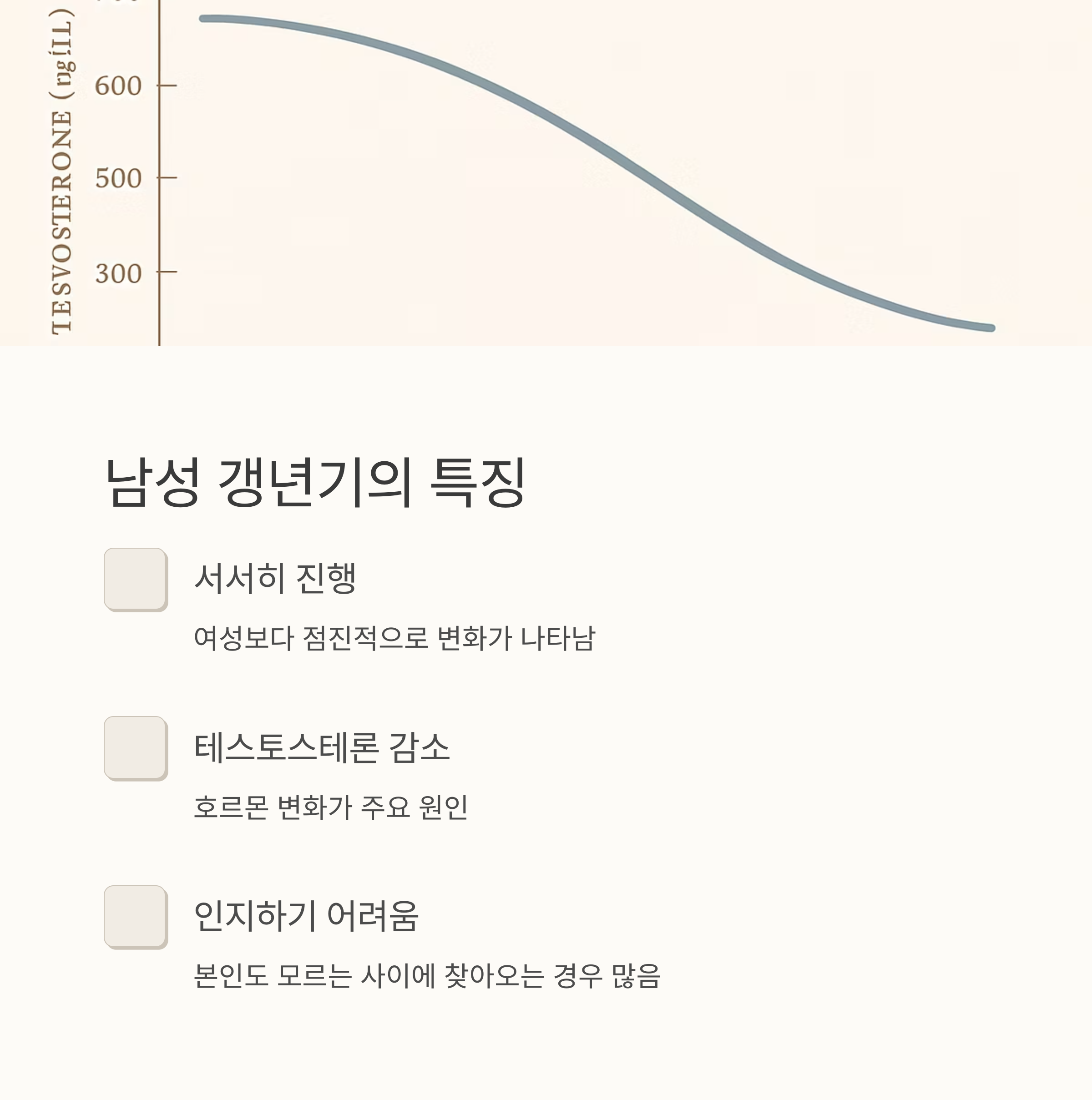 여성 갱년기만큼 남성 갱년기도 중요해요. 하지만 남성 갱년기는 여성 갱년기보다 변화가 서서히 진행되고, 본인도 모르는 사이에 찾아오는 경우가 많아요. 테스토스테론 감소로 인해 발생하는데, 주요 증상으로는 발기부전이나 성욕 감소가 있습니다. 여성과 달리 갑작스러운 신체 변화보다는 피로감, 무기력함, 근육량 감소, 집중력 저하 등이 더 두드러지게 나타날 수 있어요.