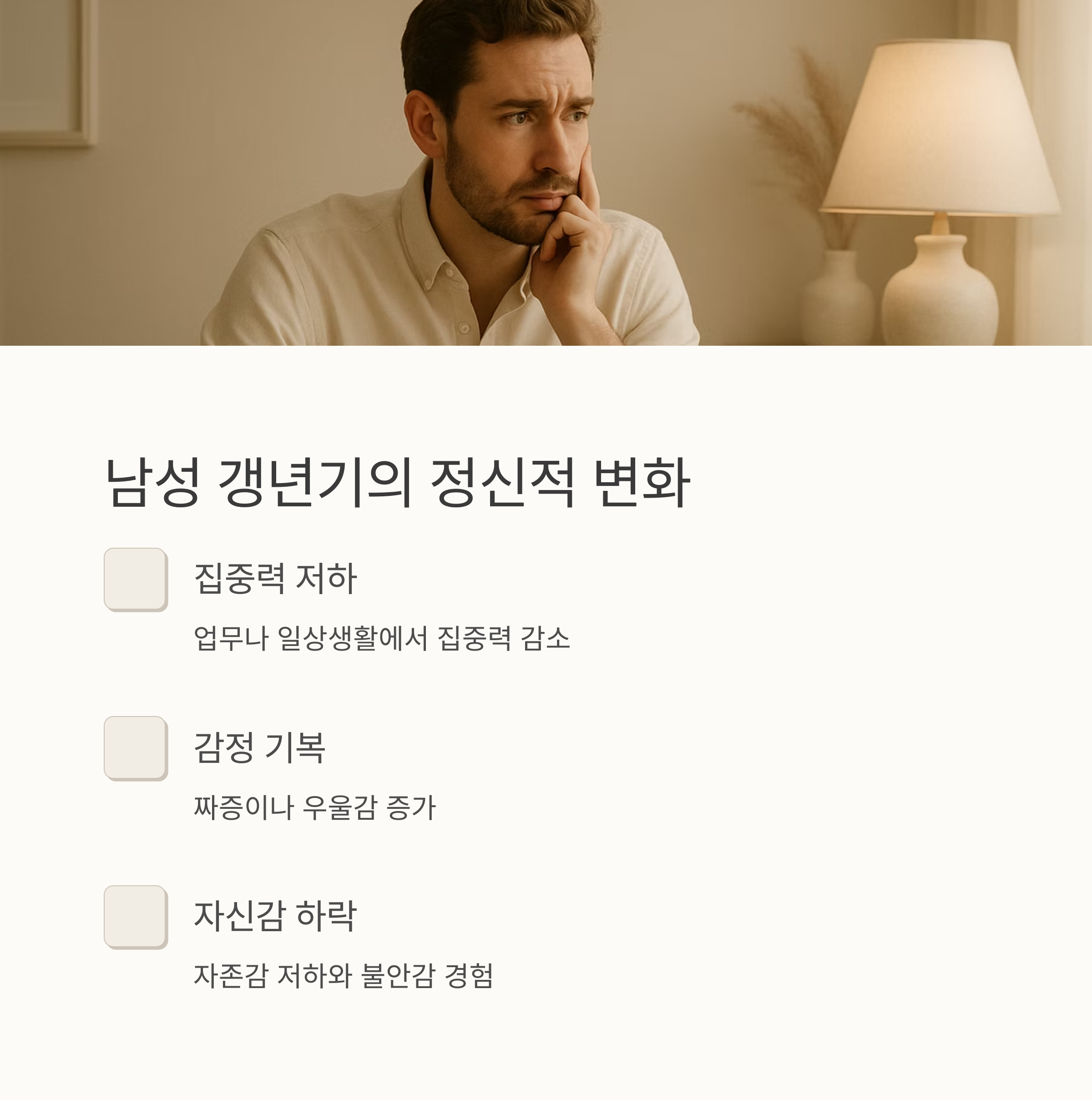 여성과 마찬가지로 감정 기복 또한 나타날 수 있고, 이로 인해 우울감을 느끼는 경우도 있습니다. 남성분들도 단순히 나이 탓으로 치부하지 마시고, 이러한 증상들이 지속된다면 병원에 방문하여 상담을 받아보는 것이 좋아요. 갱년기 증상은 꼭 여성에게만 있는 것이 아니라는 사실을 명심하세요.