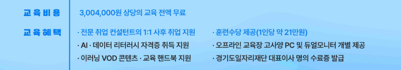 훈련을 수료하면 취업 지원까지 받을 수 있어요! 경기도에서 취업 연계 프로그램을 제공한다고 합니다. 단순히 교육만 끝나는 것이 아니라, 취업까지 확실하게 지원해 준다는 점이 정말 매력적이죠.