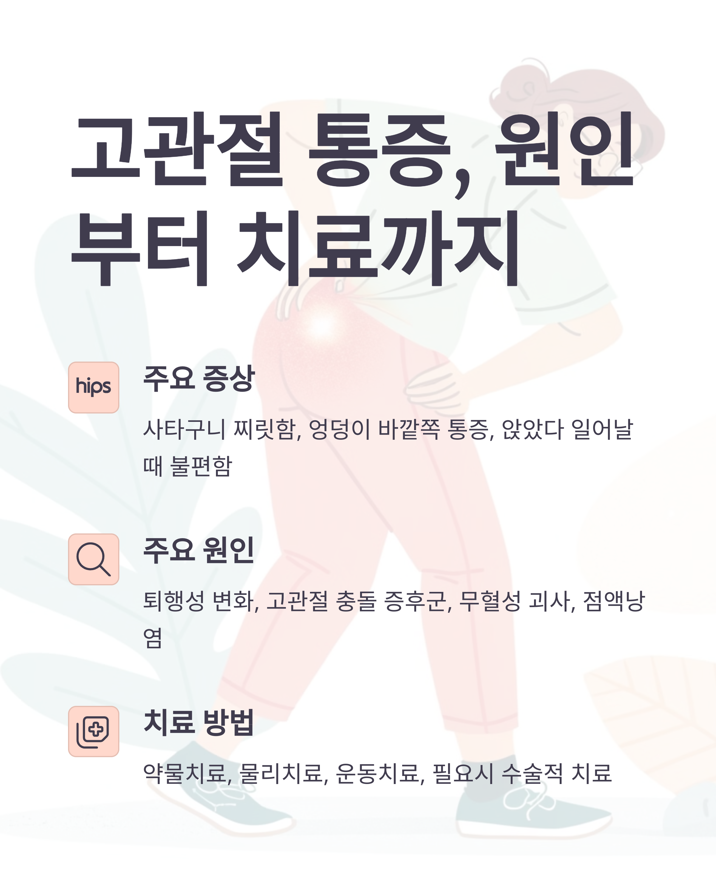 안녕하세요! 엉덩이와 허벅지 주변 통증 때문에 불편하신가요? 걷거나 앉았다 일어설 때 뻐근하고 찌릿한 통증, 설마 고관절 문제일까 걱정되시죠? 이 글에서는 고관절 통증의 원인부터 치료, 그리고 일상생활에서 쉽게 따라 할 수 있는 운동법까지 꼼꼼하게 알려드릴게요. 편안하게 읽으면서 엉덩이 건강을 되찾아보세요!