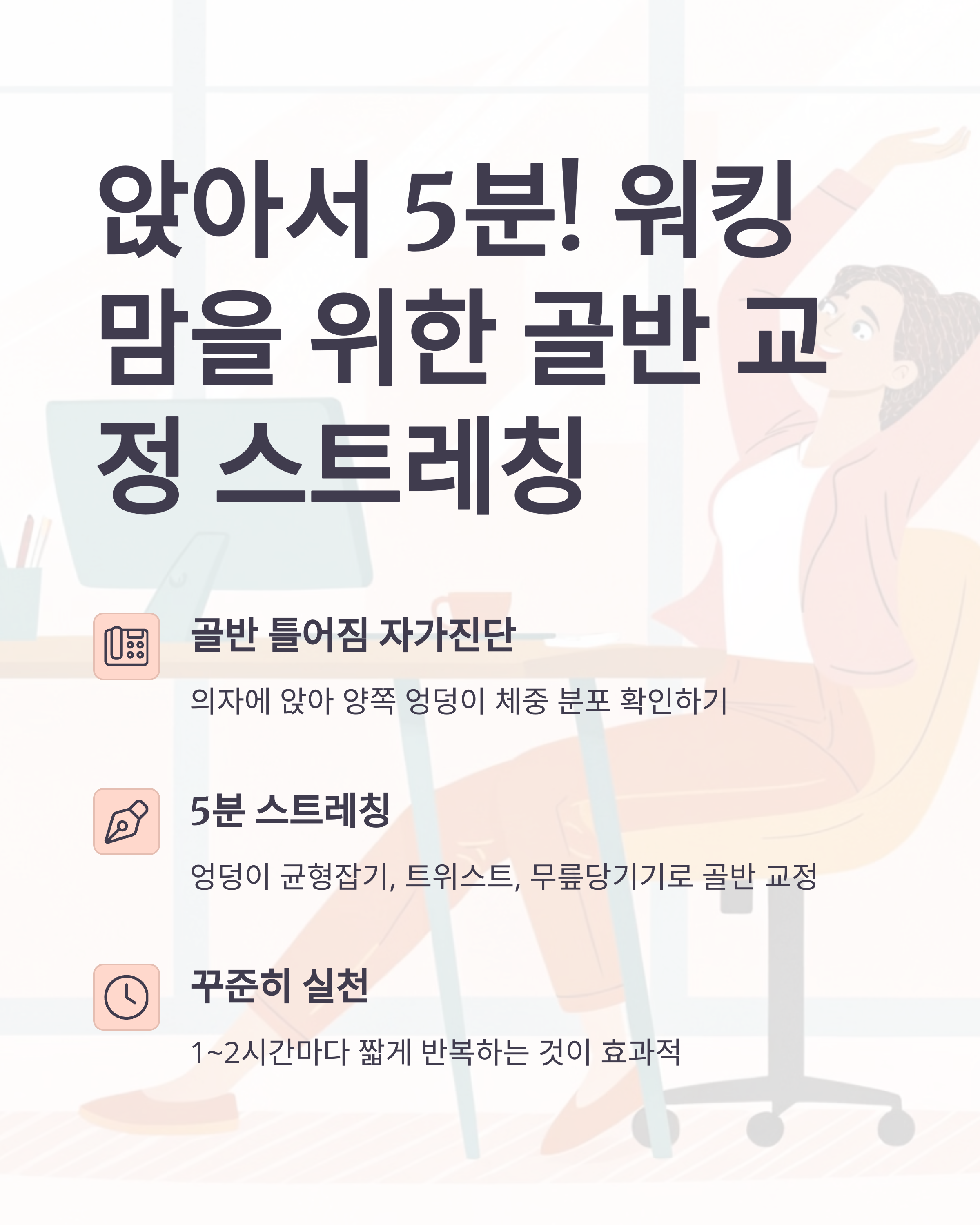 사무실에서 하는 간단한 골반 교정 스트레칭으로 건강을 지켜봐요! 작은 습관이 큰 변화를 가져올 거예요. 오늘부터 실천해보시고, 건강한 워킹맘 라이프를 즐겨보세요!