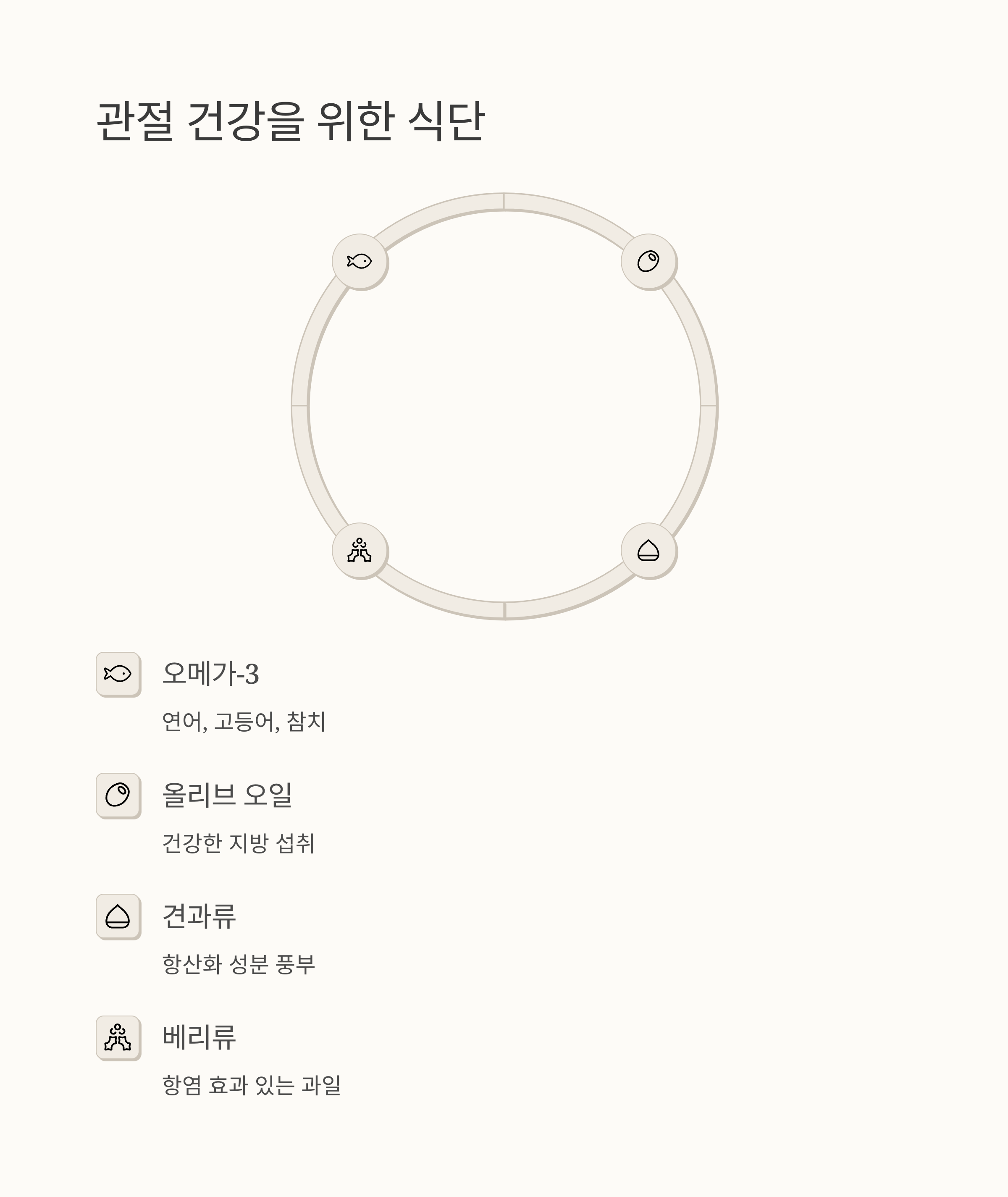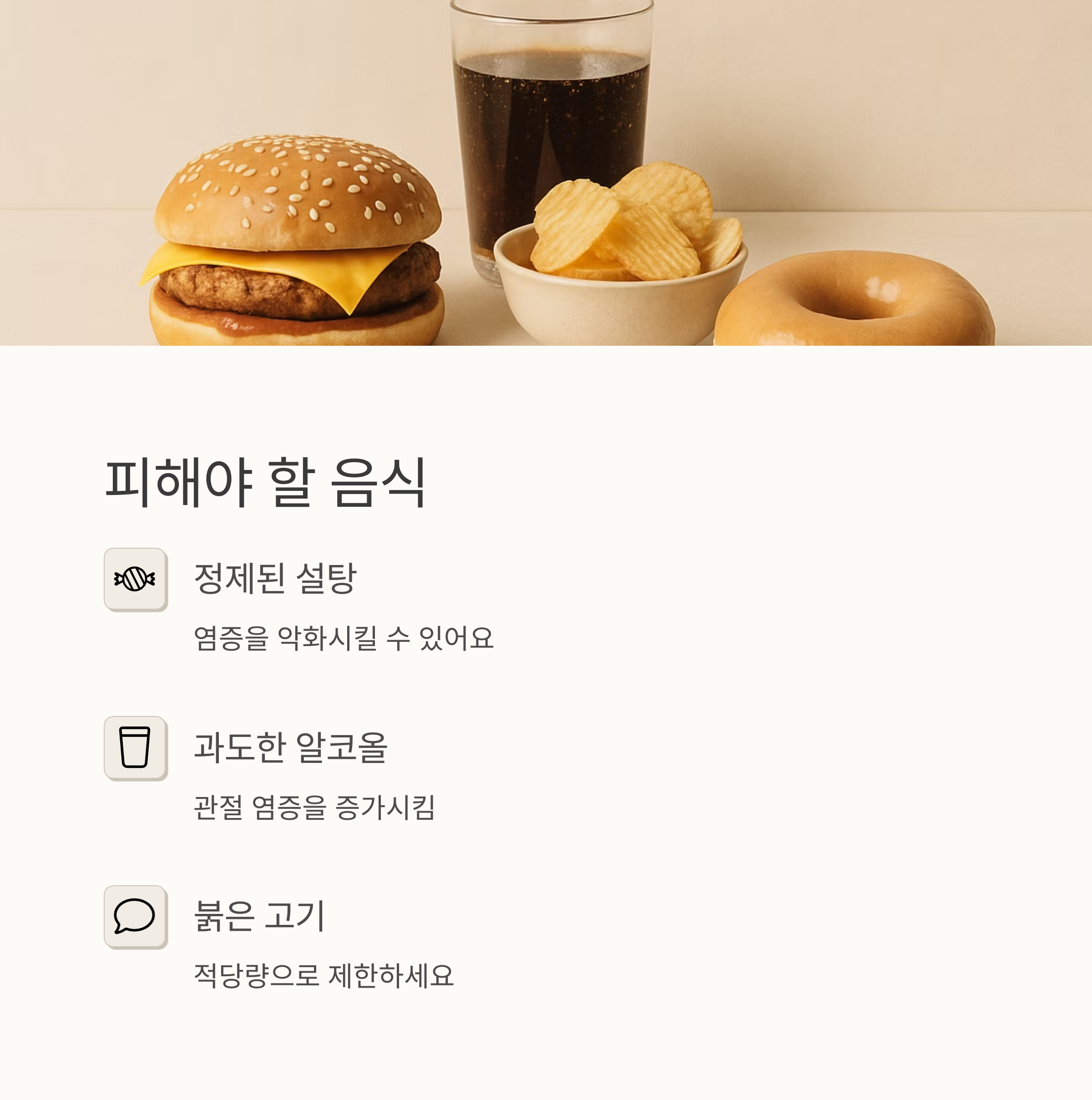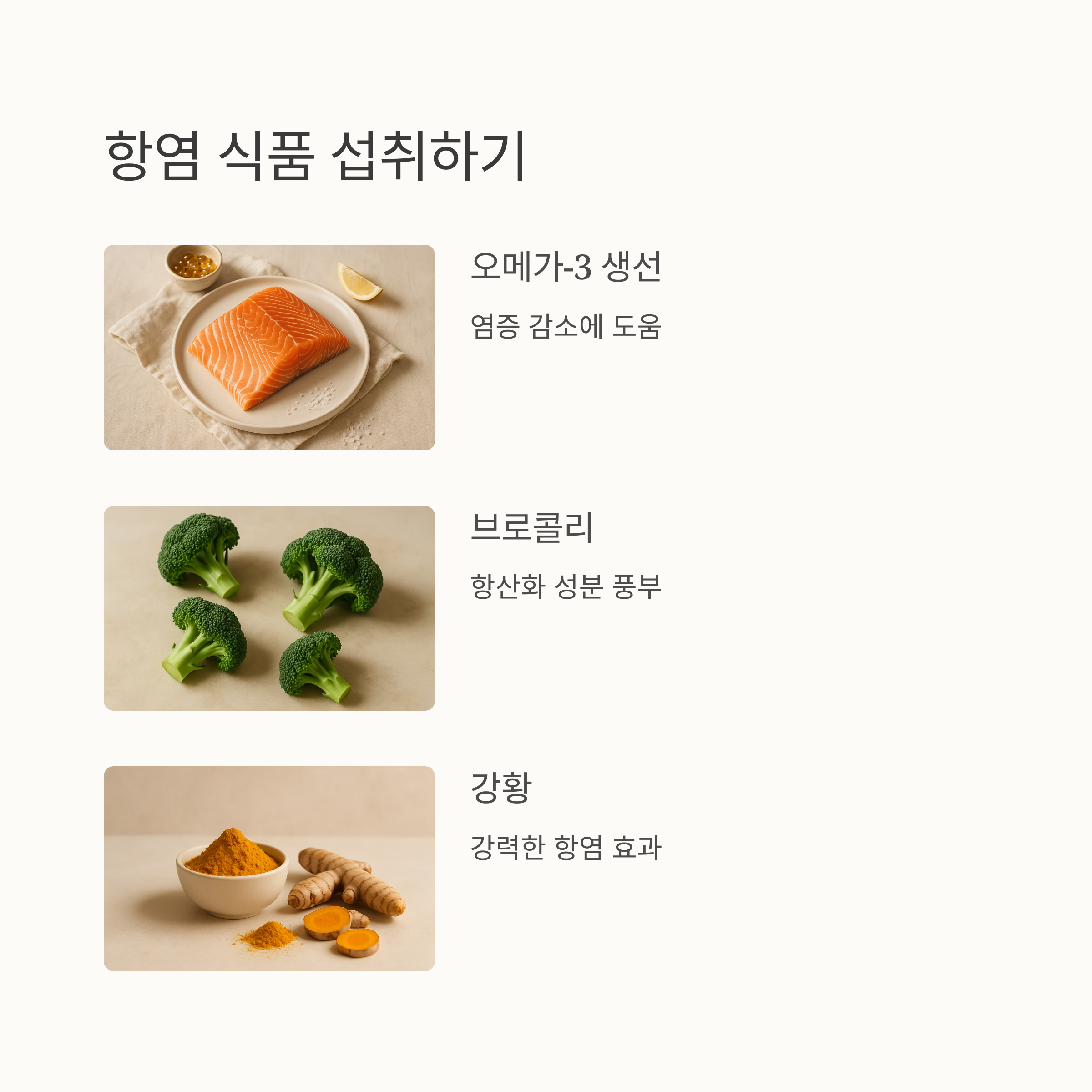 평소 걷기나 수영, 요가와 같은 저강도 운동을 꾸준히 하는 것도 좋습니다. 운동은 관절 주변 근육을 강화하고 유연성을 높여 관절에 가해지는 부담을 줄여주거든요. 그리고 염증을 줄여주는 오메가-3 지방산이 풍부한 생선이나 브로콜리, 강황 같은 항염 식품을 섭취하는 것도 도움이 될 수 있습니다. 작은 변화들이 모여 큰 효과를 만들어낼 수 있다는 것을 잊지 마세요.