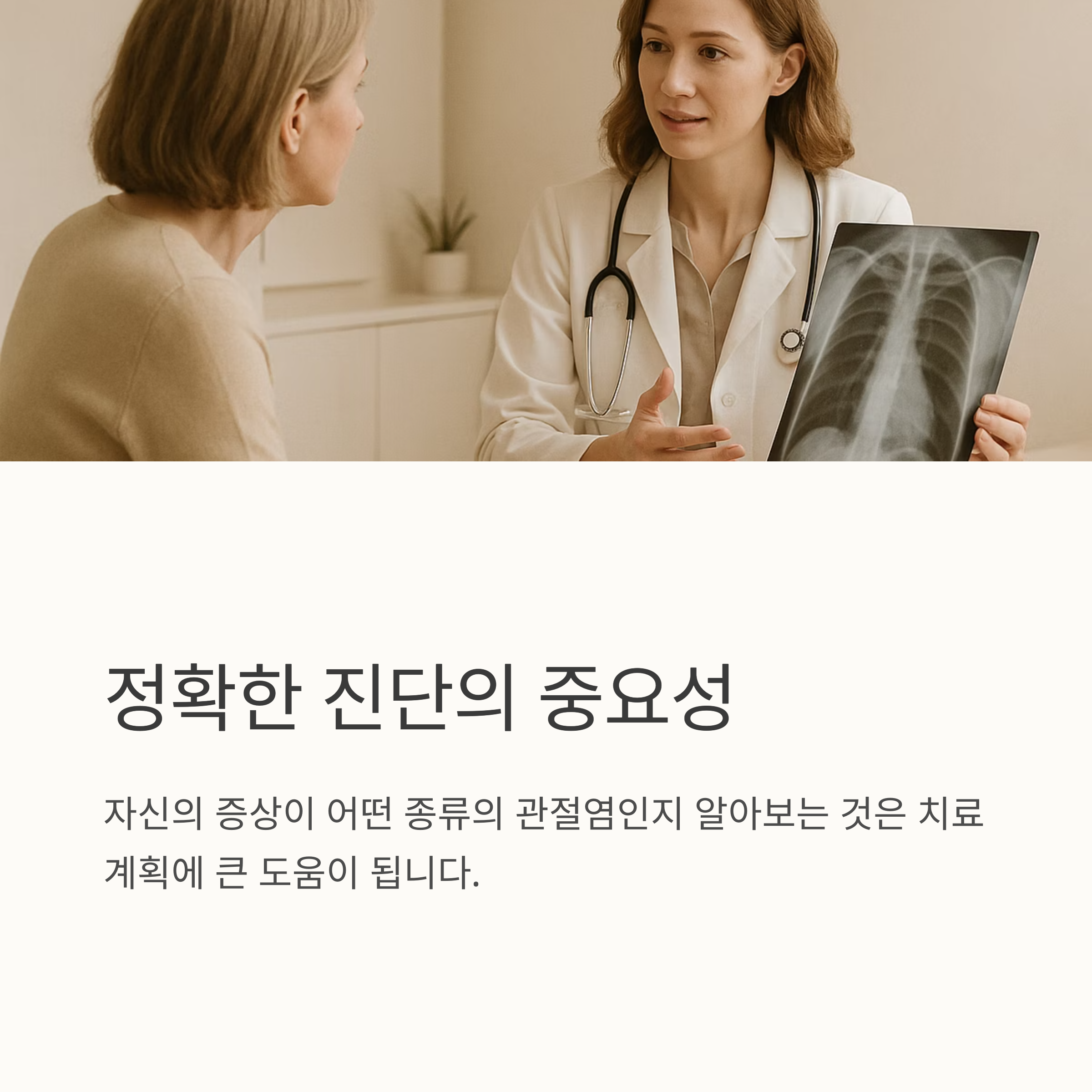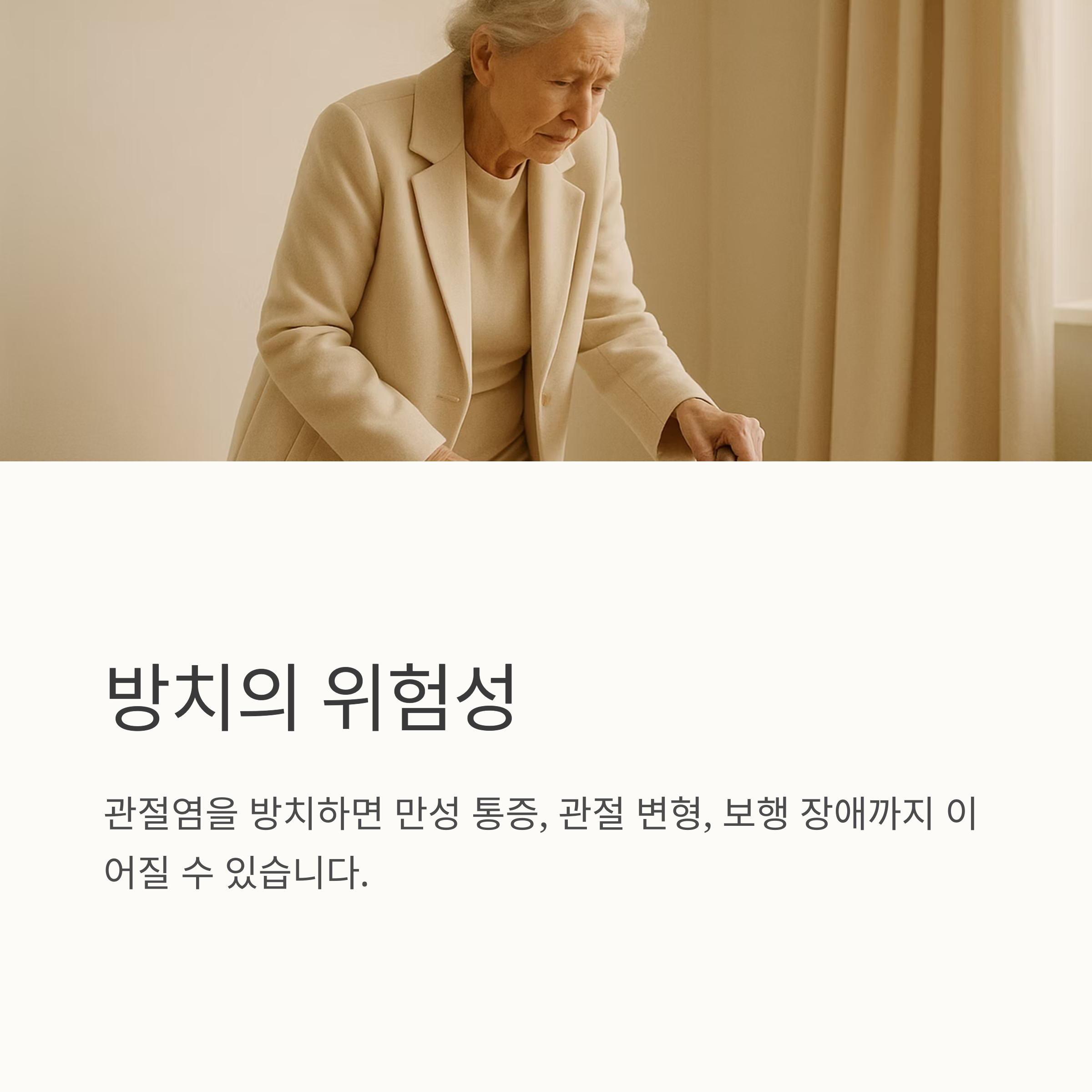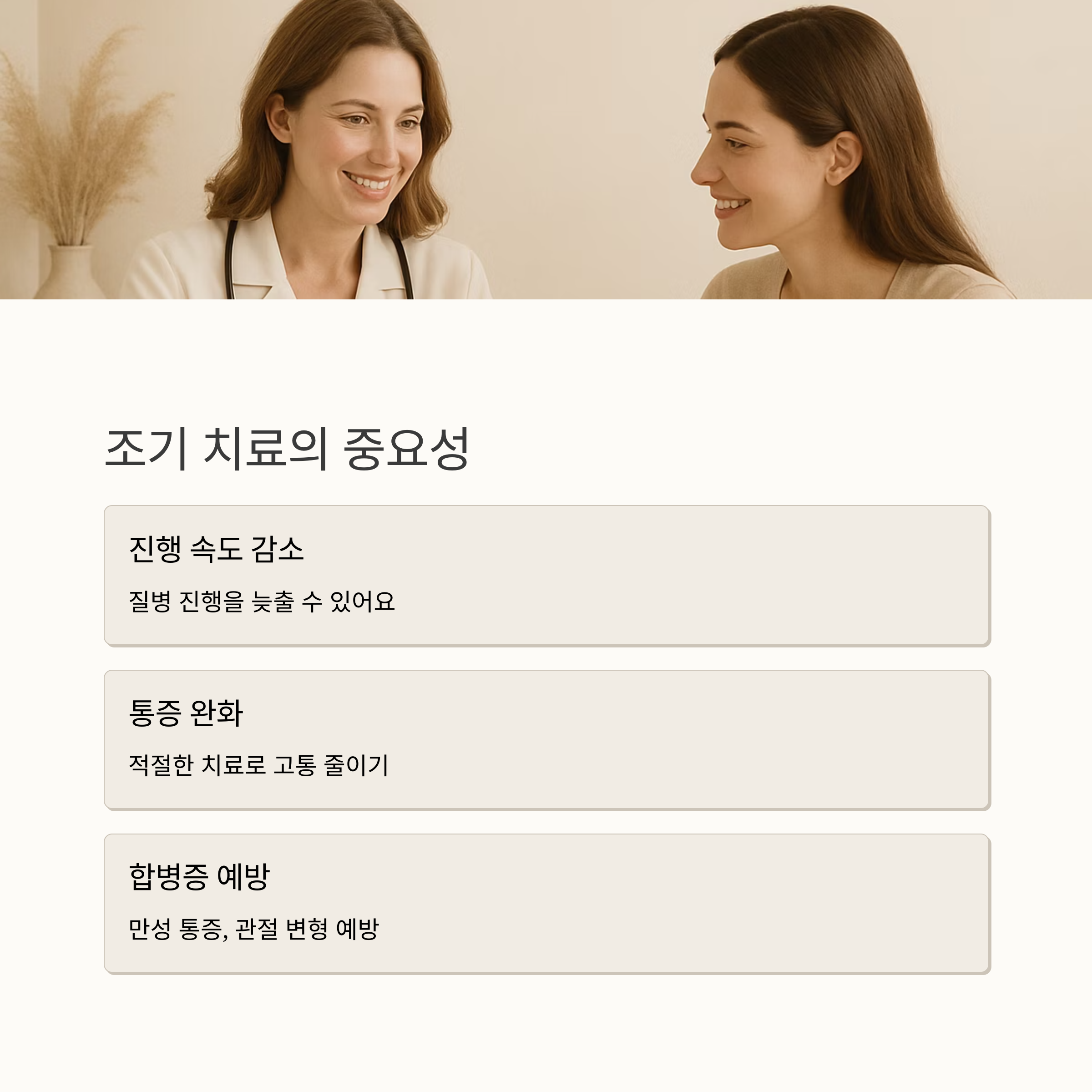 관절염은 초기에 적절한 치료를 받으면 진행 속도를 늦추고 통증을 완화할 수 있지만, 방치하면 만성 통증이나 관절 변형, 보행 장애까지 이어질 수 있으므로 조기에 진료를 받는 것이 무엇보다 중요해요. 미루지 말고, 지금 바로 병원에 가서 정확한 진단과 치료를 받으세요. 이 글이 여러분의 건강한 삶에 도움이 되기를 바랍니다.