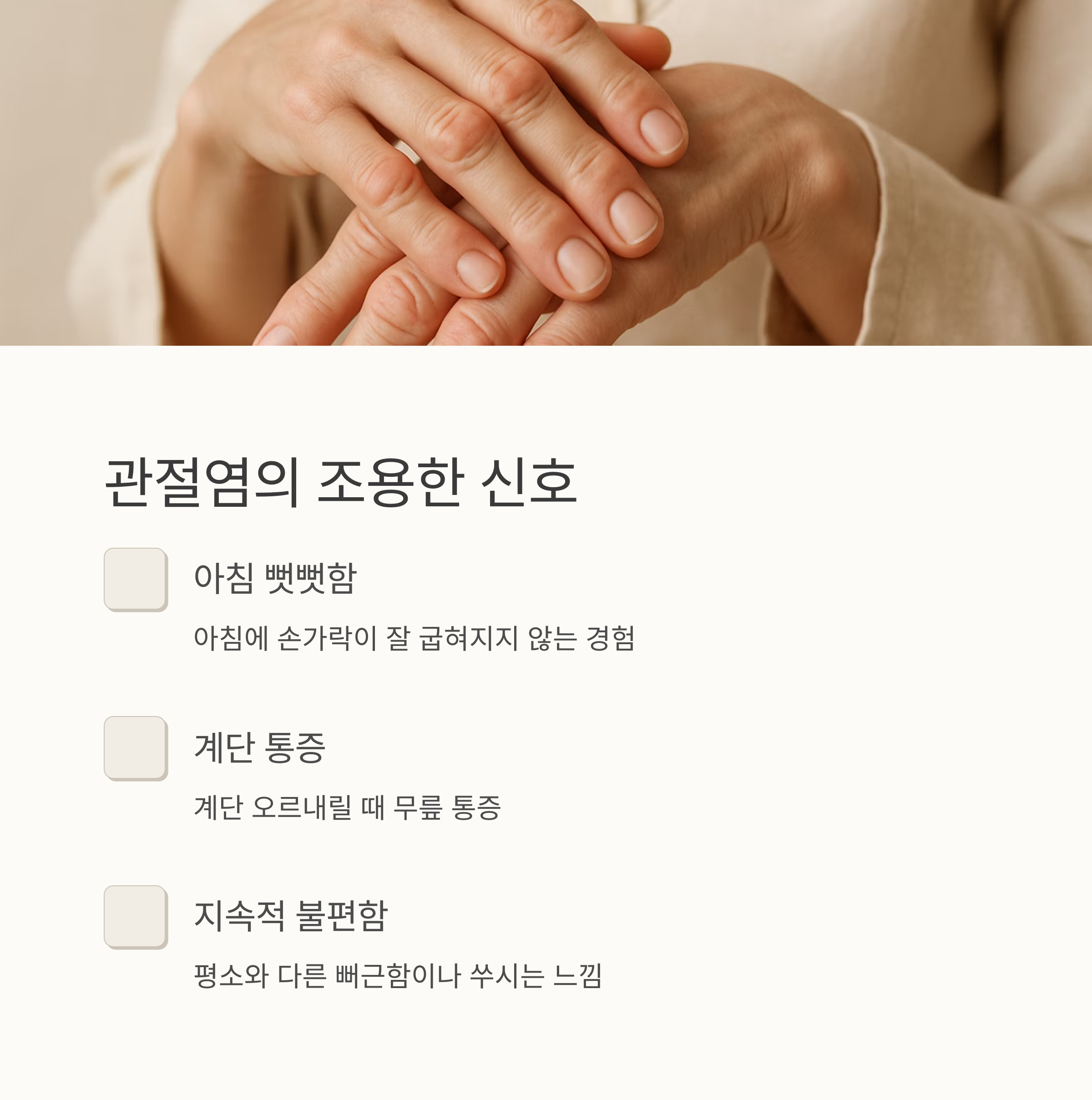 1. 일상 속 작은 신호, 놓치지 마세요: 관절염 초기증상은 무엇일까요?