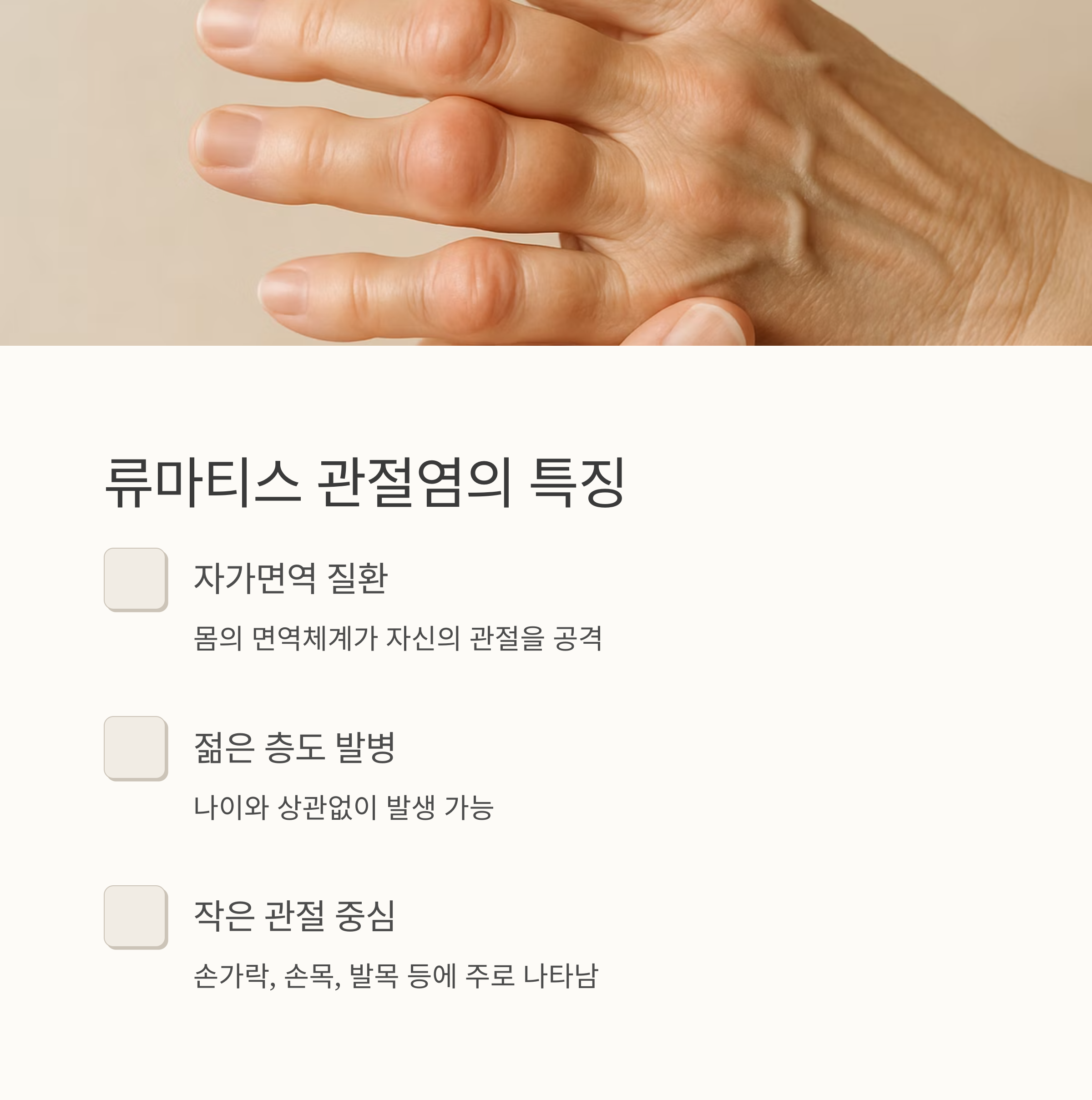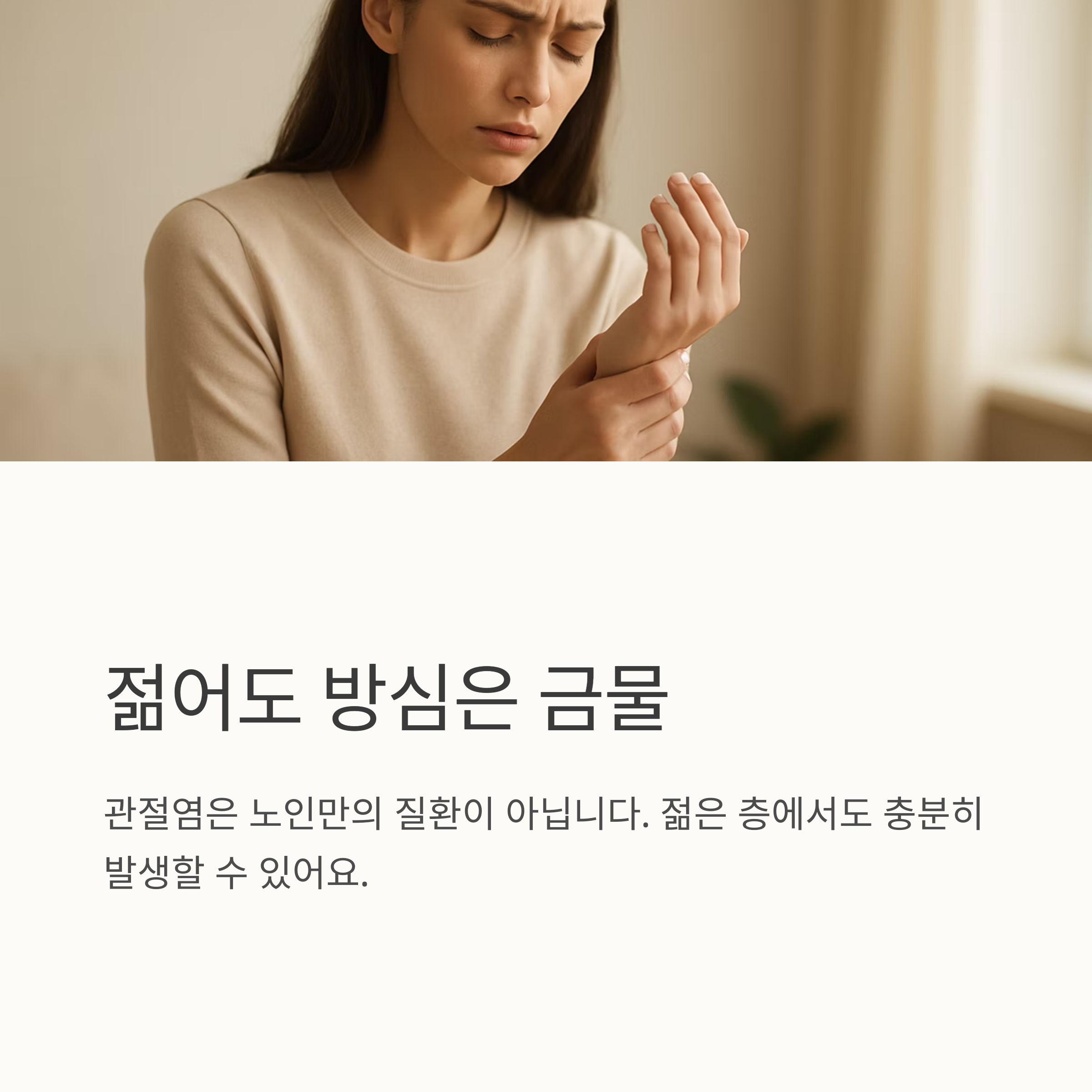 어깨가 결리고, 무릎이 쑤시고.. 혹시 괜찮아지겠지 하고 방치하고 계신가요? 관절염 초기증상은 사실 우리가 흔히 경험하는 작은 통증이나 불편함과 닮아서 쉽게 지나치기 쉬워요. 아침에 일어났을 때 손가락이 뻣뻣해서 잘 굽혀지지 않거나, 계단을 오르내릴 때 무릎에 통증이 느껴지거나, 혹은 밤에 잠 못 이룰 정도로 통증이 심해지지는 않았지만, 평소와 다르게 뻐근하거나 쑤시는 느낌이 지속된다면 말이죠.