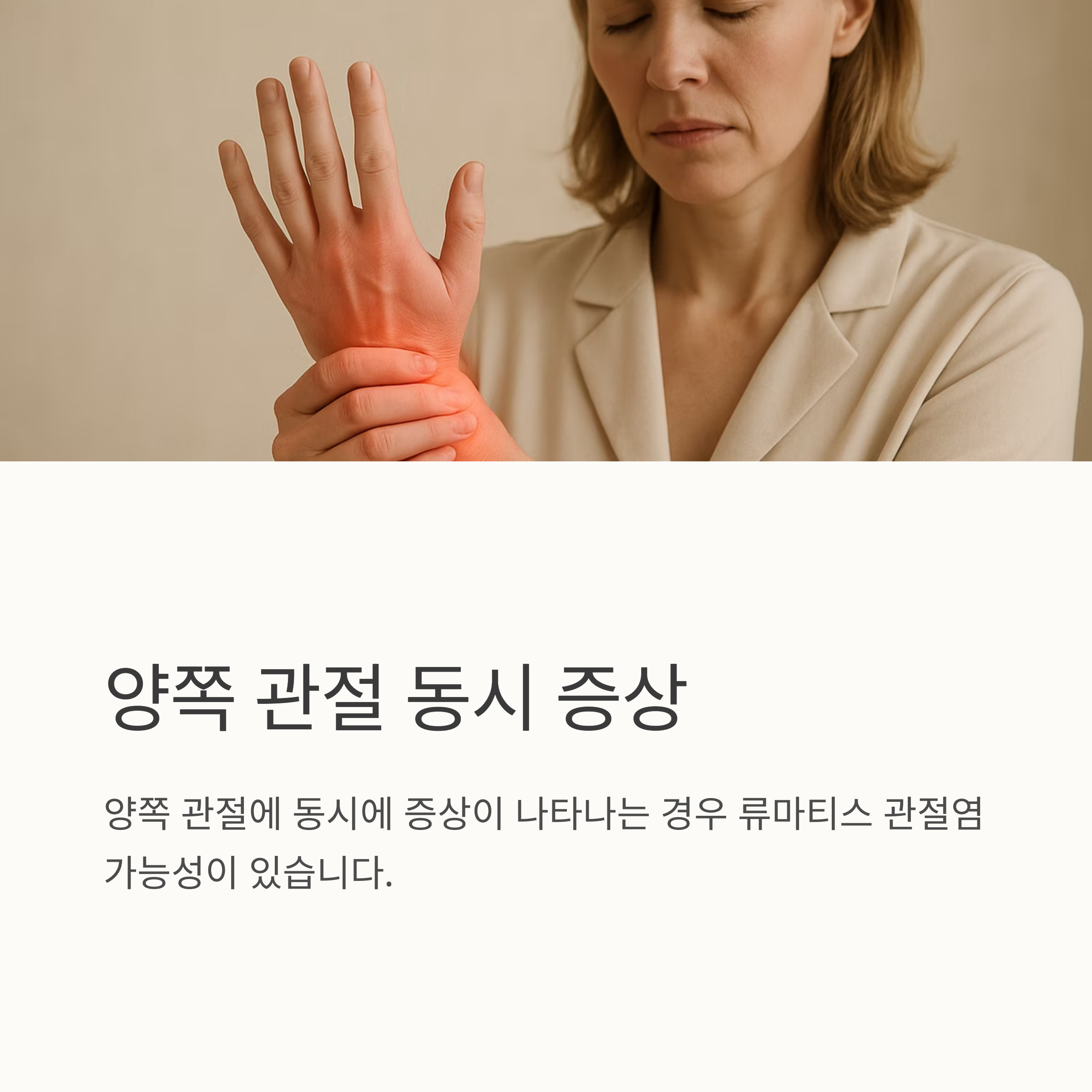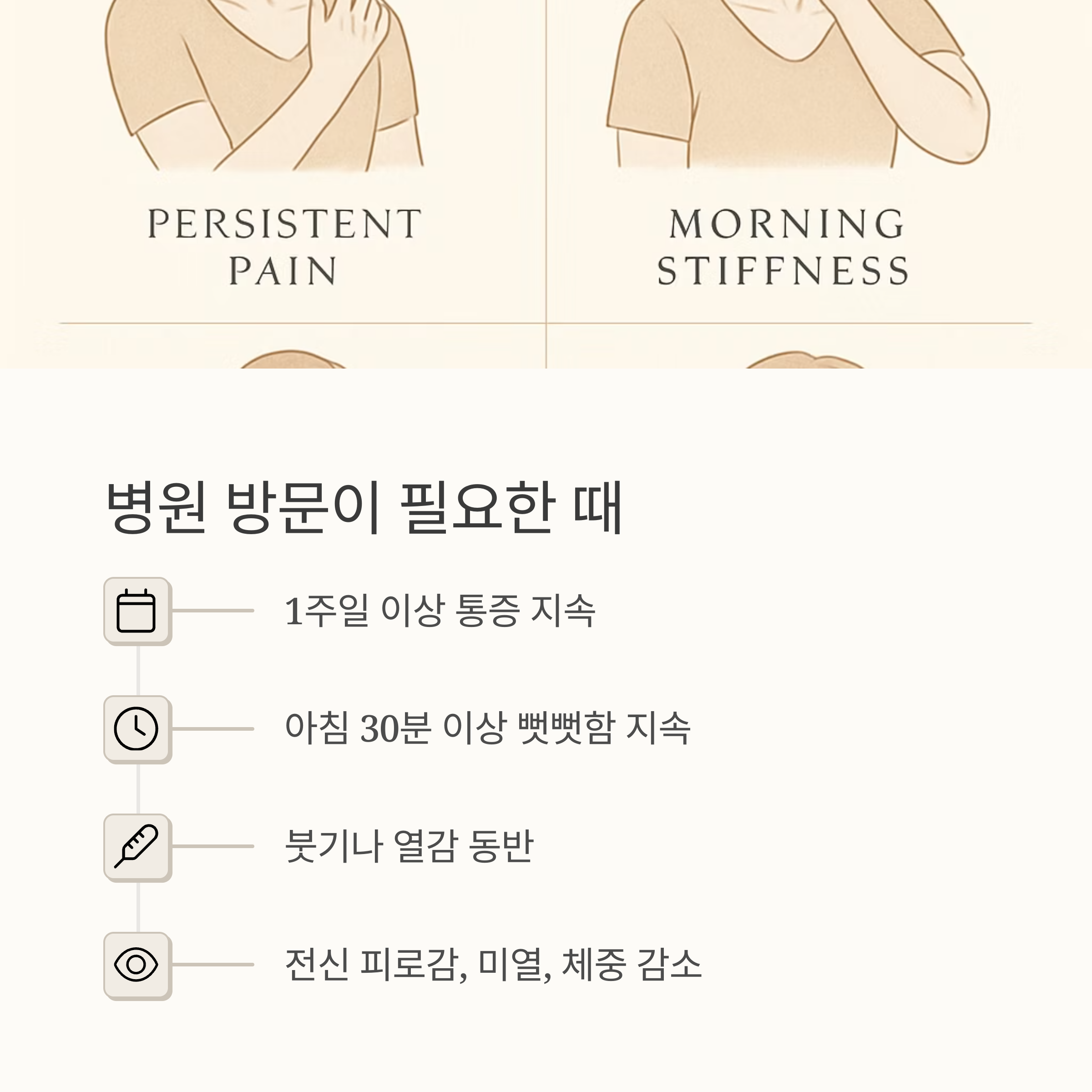 관절 통증이 1주일 이상 지속되거나, 아침에 30분 이상 관절이 뻣뻣한 상태가 유지된다면 병원을 방문해야 합니다. 특히 붓기나 열감이 동반되거나, 전신 피로감이나 미열, 체중 감소와 같은 증상이 나타나면 더욱 빨리 진료를 받아야 해요. 양쪽 관절에 동시에 증상이 나타나는 경우에도 주의해야 합니다.