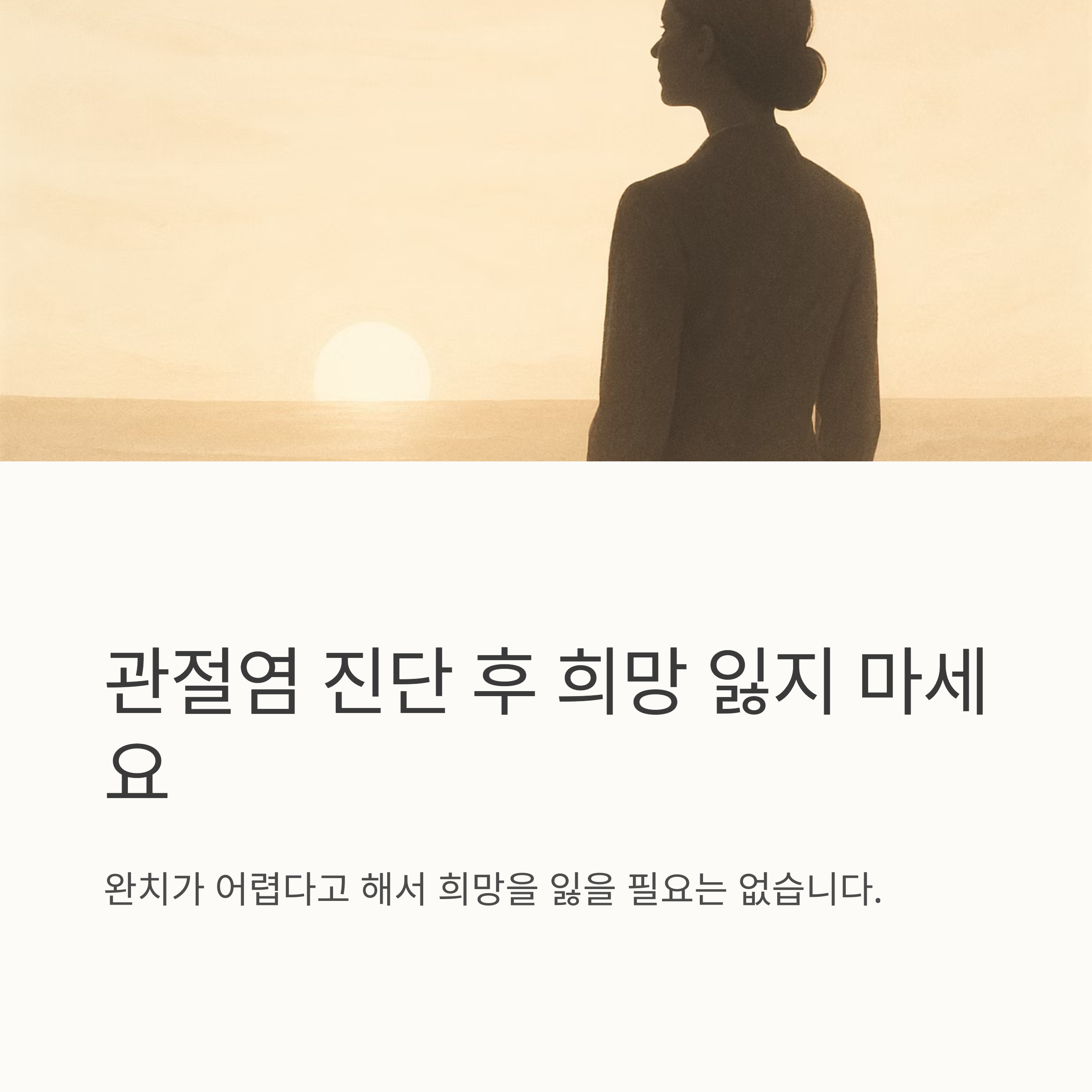많은 분들이 관절염이라는 진단을 받으면 낙담하곤 합니다. 하지만 완치가 어렵다고 해서 희망을 잃을 필요는 없어요. 관절염은 만성 질환이지만, 적절한 치료와 꾸준한 관리를 통해 충분히 증상을 조절하고 삶의 질을 높일 수 있습니다. 전문의의 도움을 받아 약물 치료를 병행하고, 생활 습관을 개선하며 꾸준히 운동하면 통증을 줄이고 관절 기능을 유지할 수 있어요.