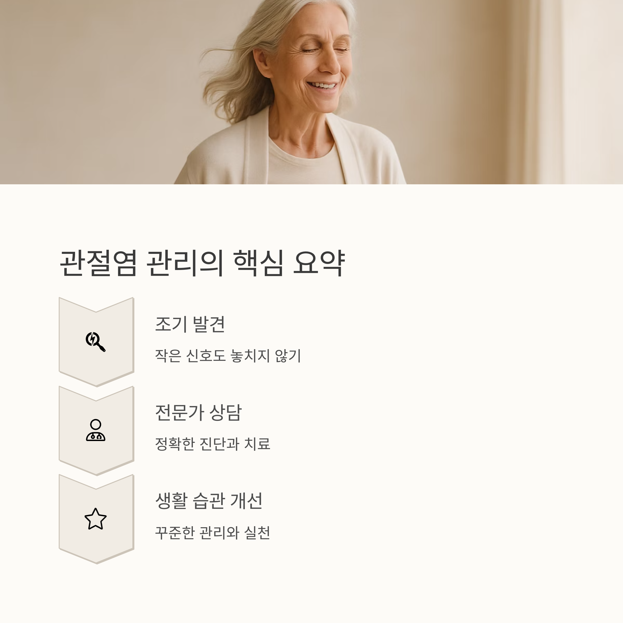 관절염 초기증상은 놓치기 쉽지만, 조기에 발견하고 적절한 관리를 한다면 충분히 극복할 수 있습니다. 본 글에서 소개된 관절염 초기증상 정보들이 여러분의 관절 건강을 지키는 데 도움이 되었기를 바랍니다. 무엇보다 중요한 것은 작은 신호에도 귀 기울이고, 전문가의 도움을 적극적으로 받는 것입니다. 여러분의 건강한 삶을 응원합니다.