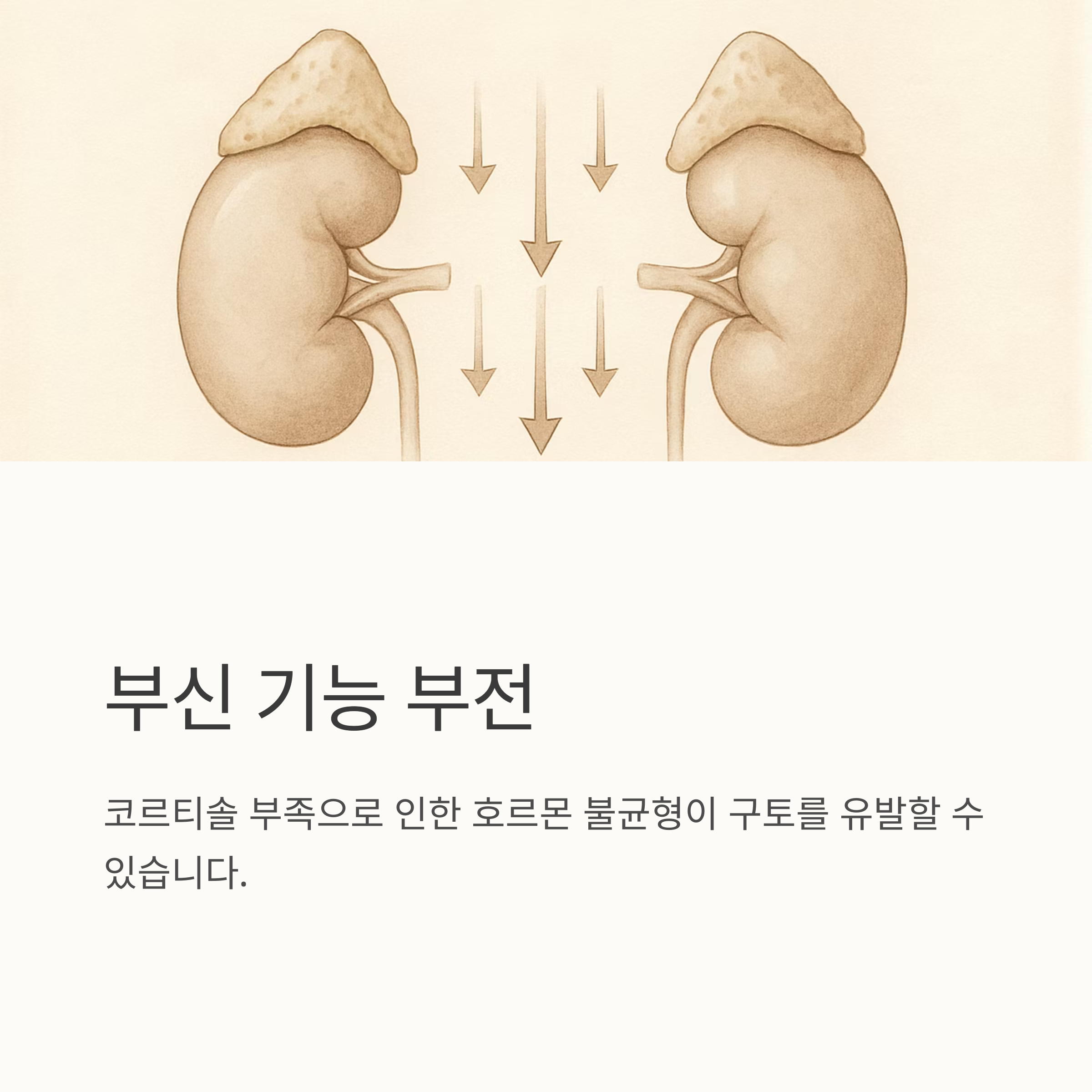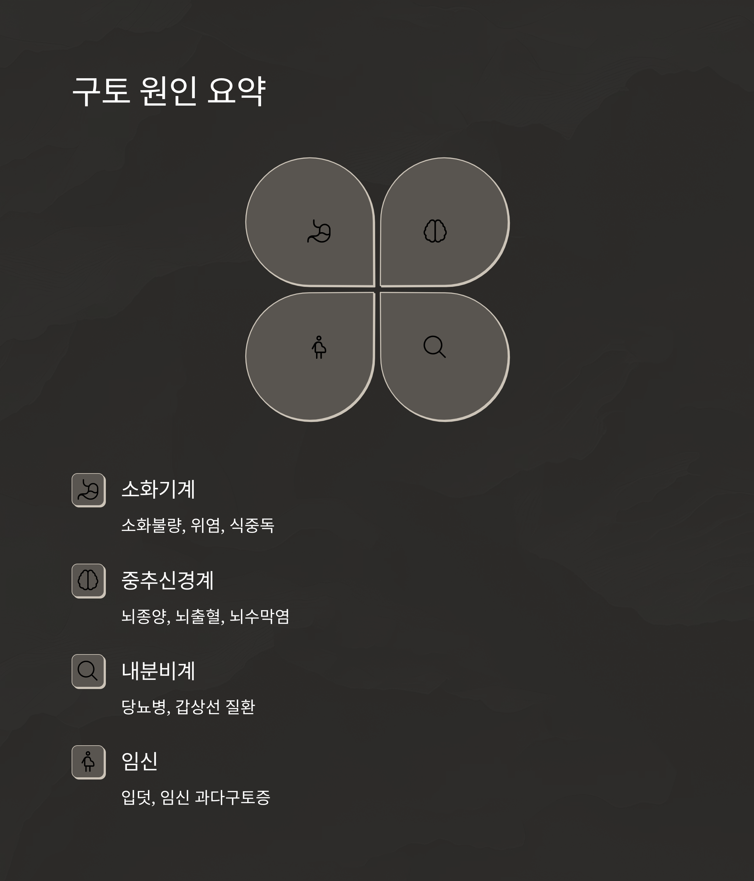 구토의 원인은 우리가 생각하는 것보다 훨씬 다양합니다. 소화기계 문제뿐 아니라 내분비계나 대사계의 이상으로 인해 구토가 발생할 수도 있습니다. 당뇨병 환자의 경우 케톤산증으로 인해 구토가 발생할 수 있으며, 갑상선 기능 항진증이나 부신 기능 부전과 같은 호르몬 불균형 또한 구토를 유발할 수 있습니다. 이러한 질환들은 겉으로 드러나는 증상이 미미할 수 있지만, 몸 안의 균형이 깨지면서 위장에도 영향을 미치는 것입니다.