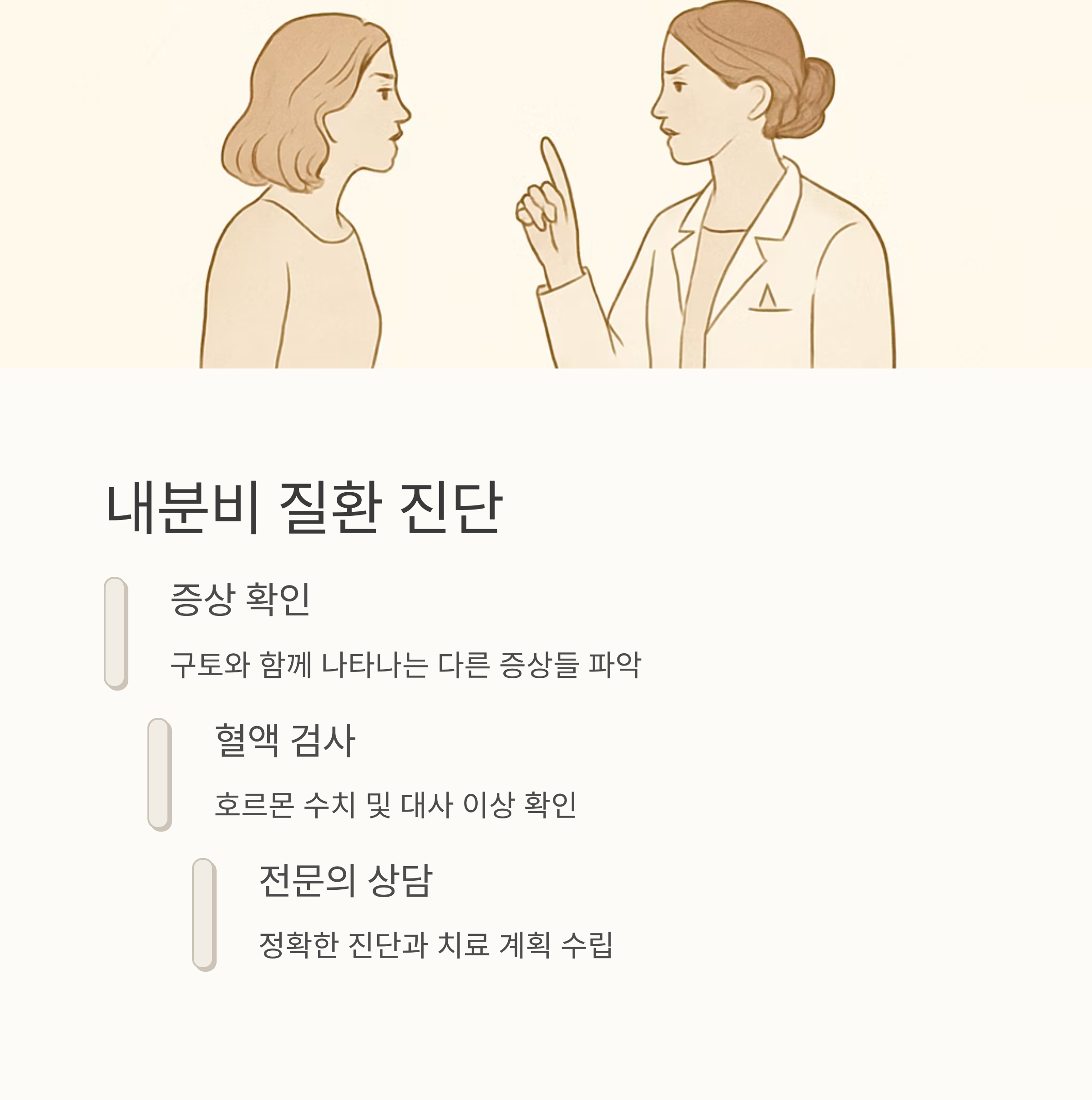 이러한 내분비·대사 질환은 구토 외에도 다른 증상들이 동반될 수 있으므로, 만약 잦은 구토와 함께 다른 이상 증상이 나타난다면 병원에 가서 정확한 진단을 받는 것이 중요합니다. 단순히 구토 증상만으로 판단하지 말고, 다른 증상들을 함께 고려하여 원인을 찾아야 합니다. 몸의 변화에 민감하게 반응하고, 정기적인 건강검진을 통해 건강을 유지하는 것이 무엇보다 중요합니다.