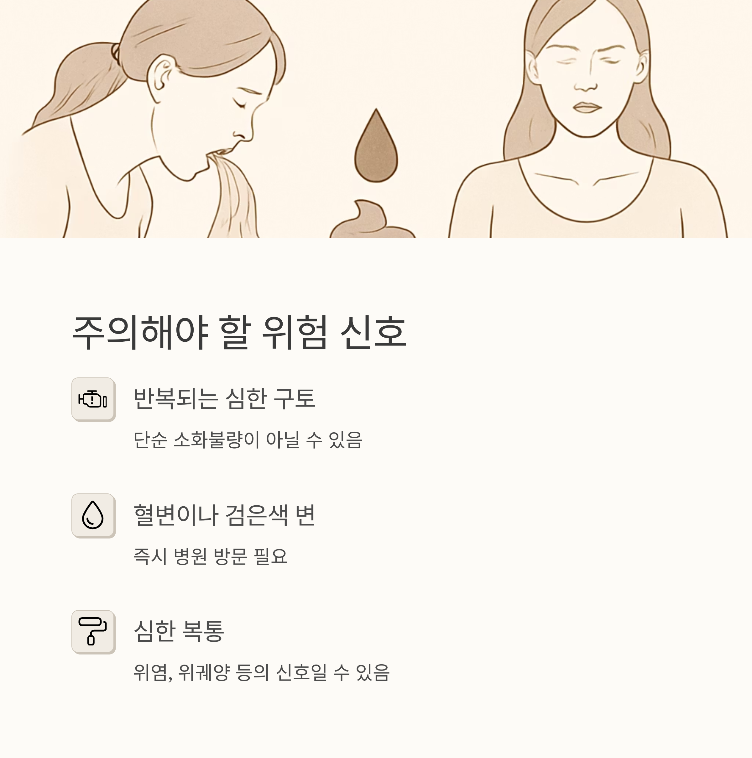 위염이나 위궤양, 역류성 식도염 등 다른 질환일 가능성도 있으니 병원을 방문해서 정확한 진단을 받아보는 게 중요합니다. 잦은 구토는 위 점막 손상을 유발할 수 있으니 방치하지 않는 것이 좋습니다. 구토와 함께 심한 통증, 혈변, 검은색 변 등의 증상이 나타난다면 즉시 병원에 가셔야 해요. 내 몸의 작은 신호를 놓치지 말고 귀 기울여 주세요.