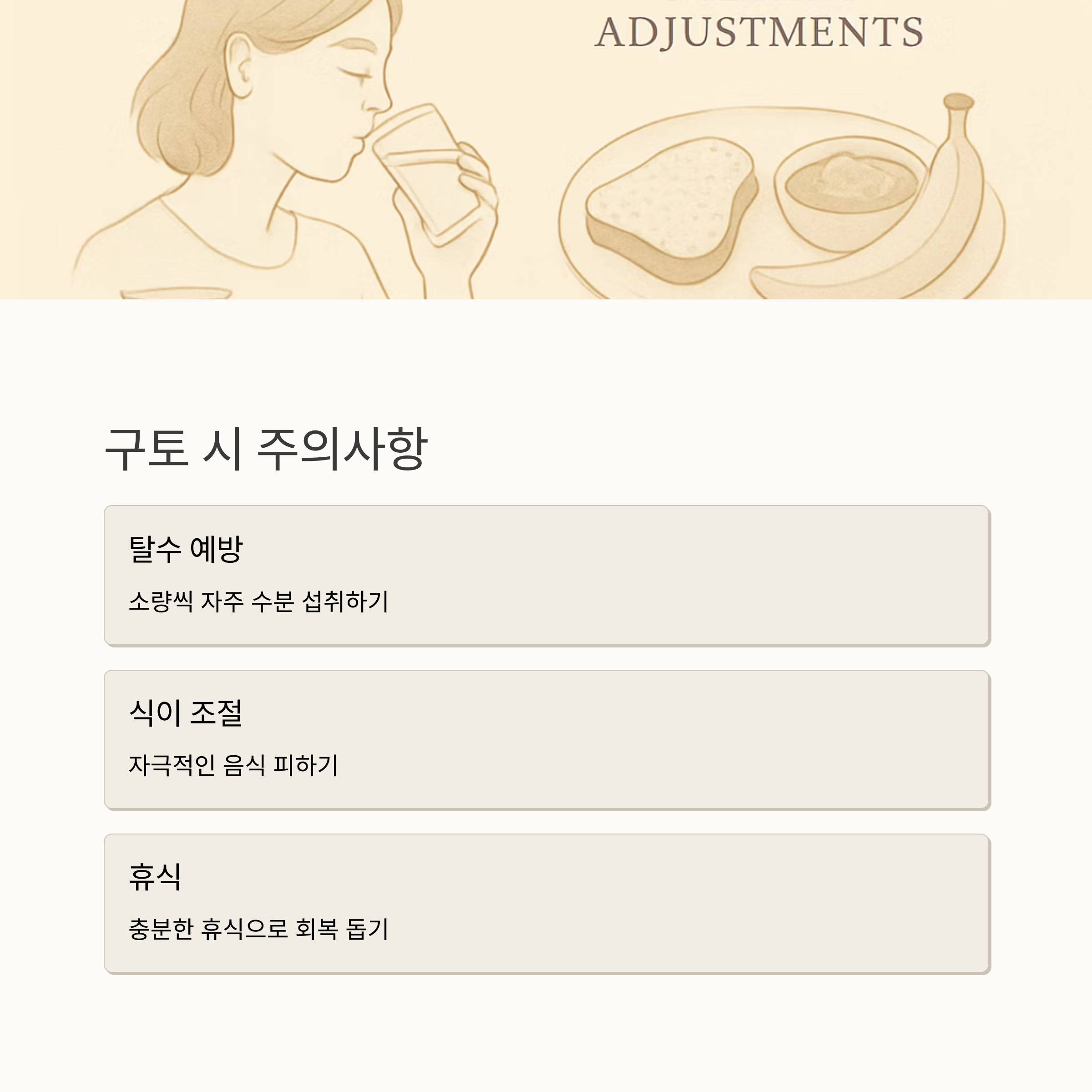 구토와 설사가 심할 경우 탈수 증상이 나타날 수 있으므로 수분을 충분히 섭취하는 것이 중요해요. 이온 음료를 마시거나, 묽은 죽을 먹는 것도 도움이 됩니다. 증상이 심하거나 오래 지속되면 병원을 찾아 진료를 받는 것이 좋습니다. 특히 어린이나 노약자는 탈수 증상에 더 취약하니 각별히 주의해야 합니다.