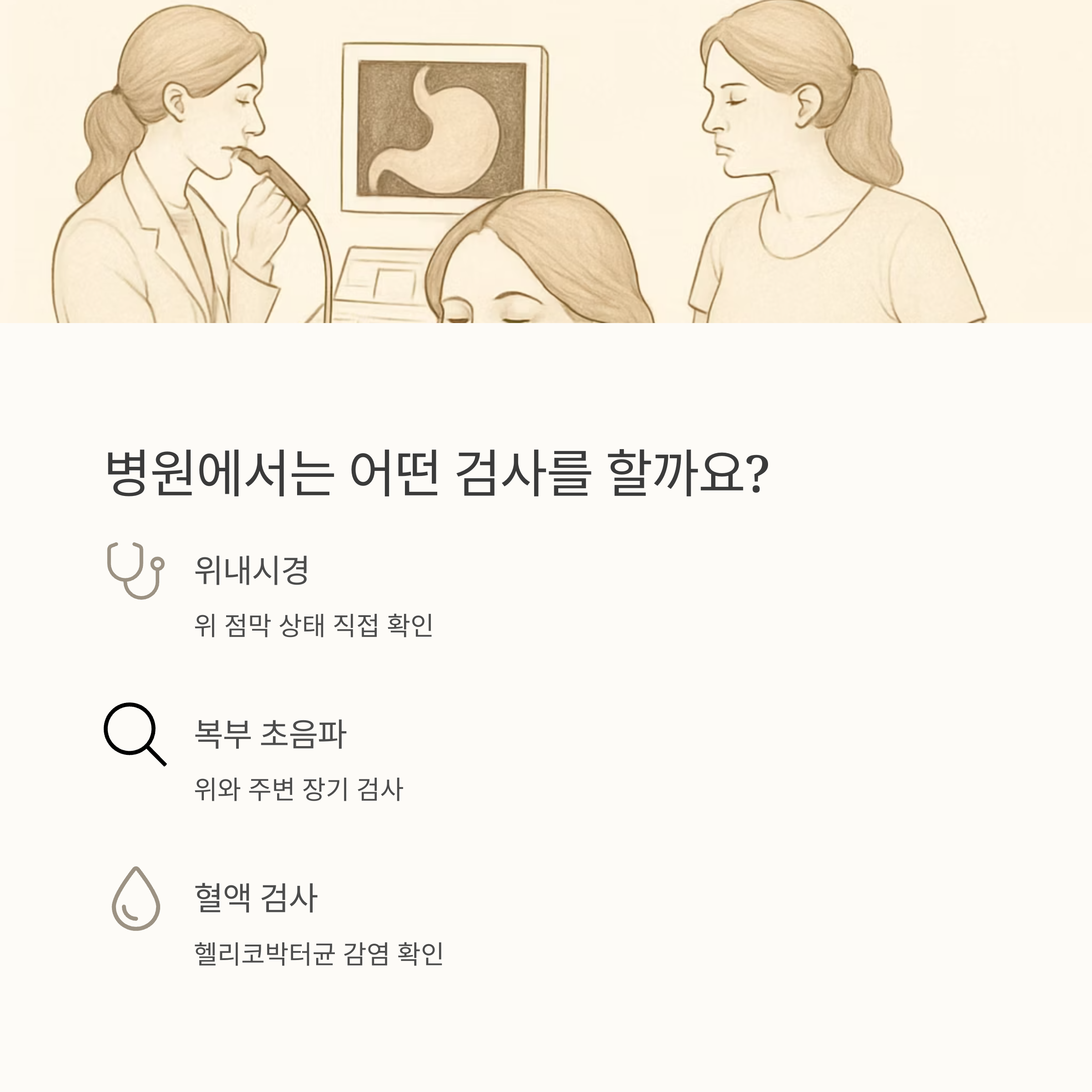 병원에서는 위내시경 검사, 복부 초음파, 혈액 검사 등을 통해 위염의 정도를 확인하고, 헬리코박터균 감염 여부도 확인할 수 있습니다. 정확한 진단을 바탕으로 적절한 치료를 받으면 빠르게 회복할 수 있습니다. 자가 진단보다는 의사의 전문적인 진단을 받는 것이 안전합니다. 주저하지 말고 병원을 방문하여 정확한 진단과 치료를 받는 것이 건강을 지키는 가장 확실한 방법입니다.