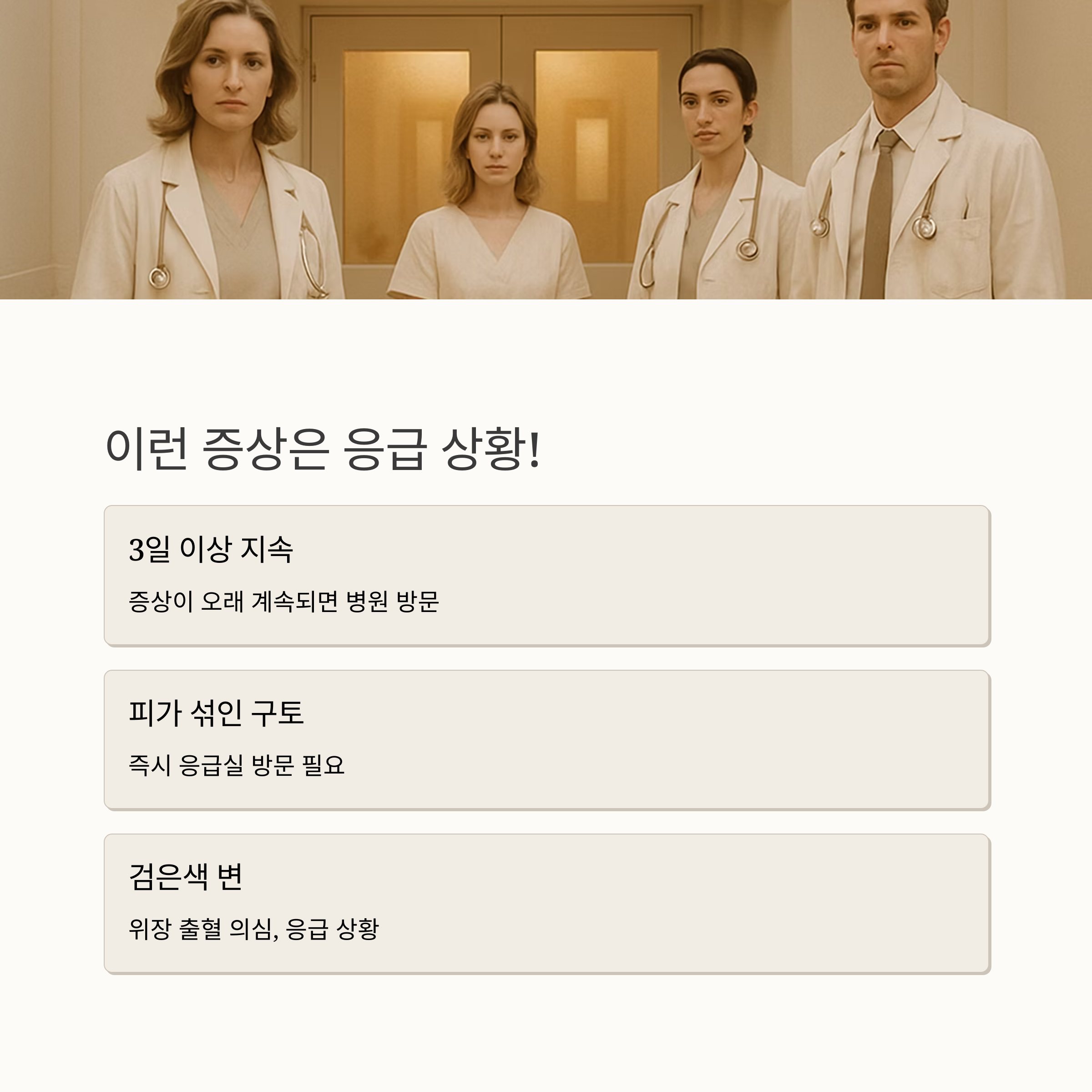 위염 증상이 나타났다고 해서 무조건 병원에 가야 하는 것은 아닙니다. 하지만 증상이 심하거나 오래 지속된다면, 병원을 찾는 것이 좋습니다. 특히 3일 이상 증상이 계속되거나, 구토에 피가 섞여 나오거나, 검은색 변을 보는 경우는 응급 상황일 수 있으므로 즉시 병원에 가야 합니다.