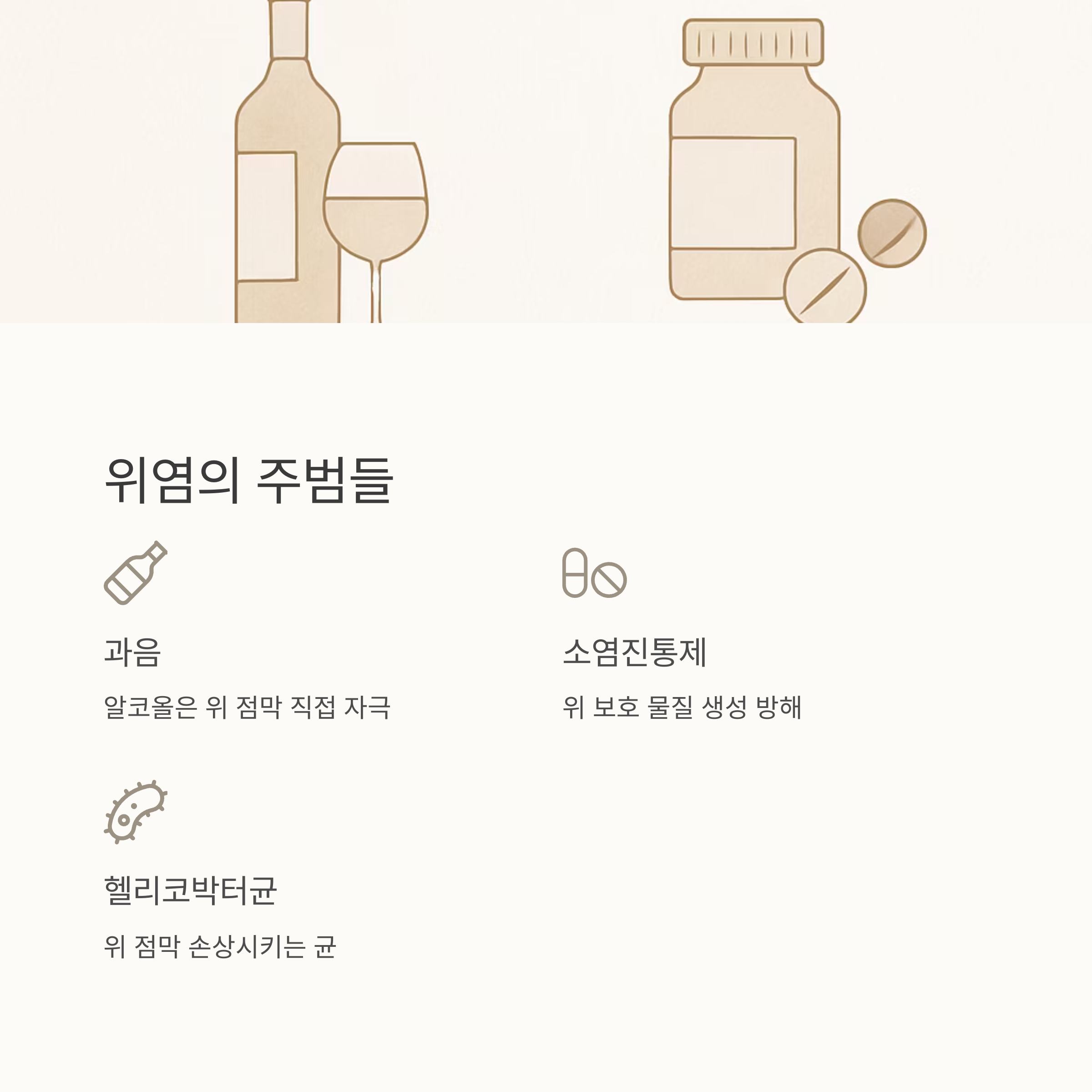 위염의 원인은 다양하지만, 몇 가지 흔한 원인을 짚어볼게요. 가장 흔한 원인은 역시 과음입니다. 알코올은 위 점막을 직접 자극해서 염증을 유발하죠. 소염진통제를 자주 먹는 경우에도 위염 위험이 높아진다는 사실 알고 계셨나요? 이 약들은 위 점막을 보호하는 물질의 생성을 방해하기 때문이에요.
