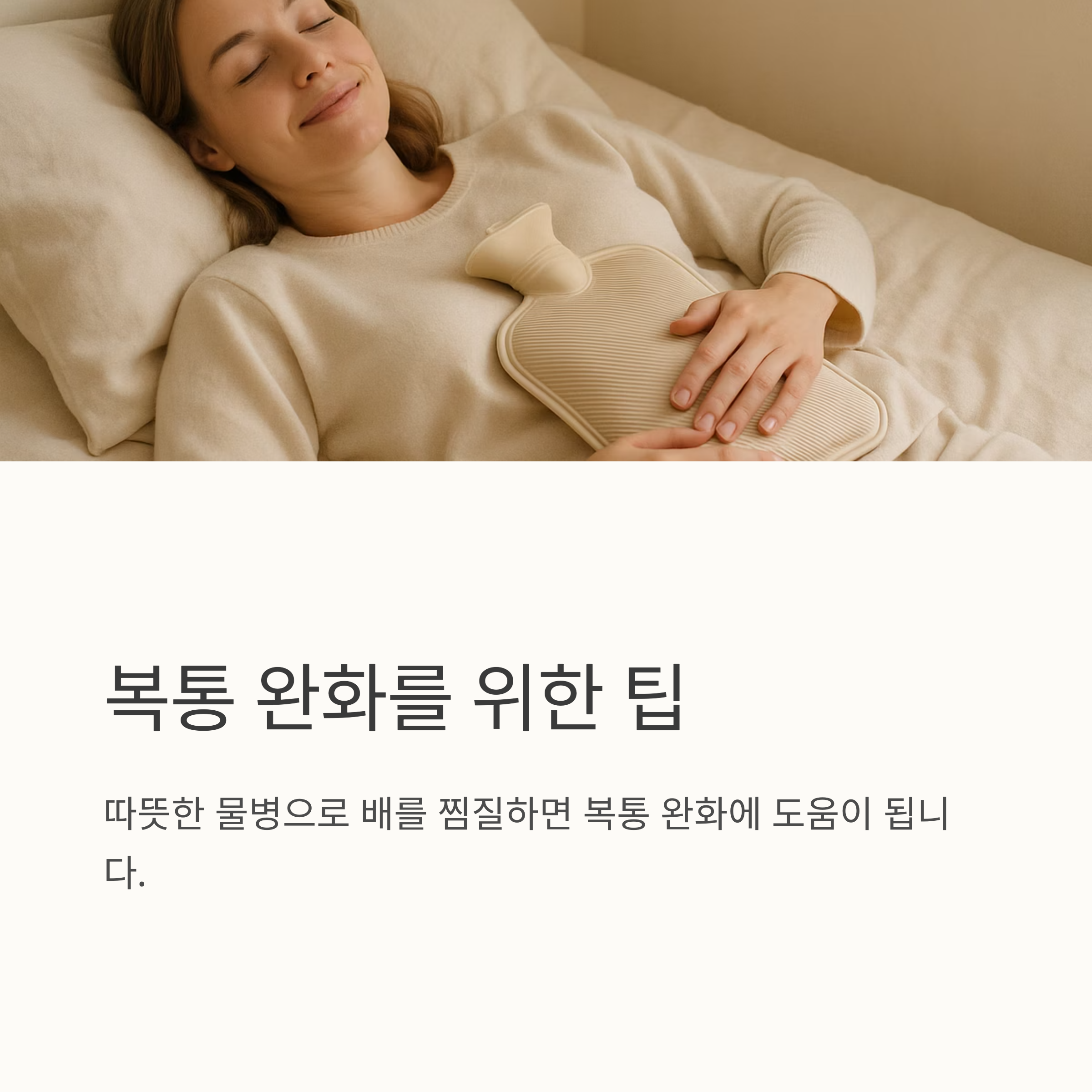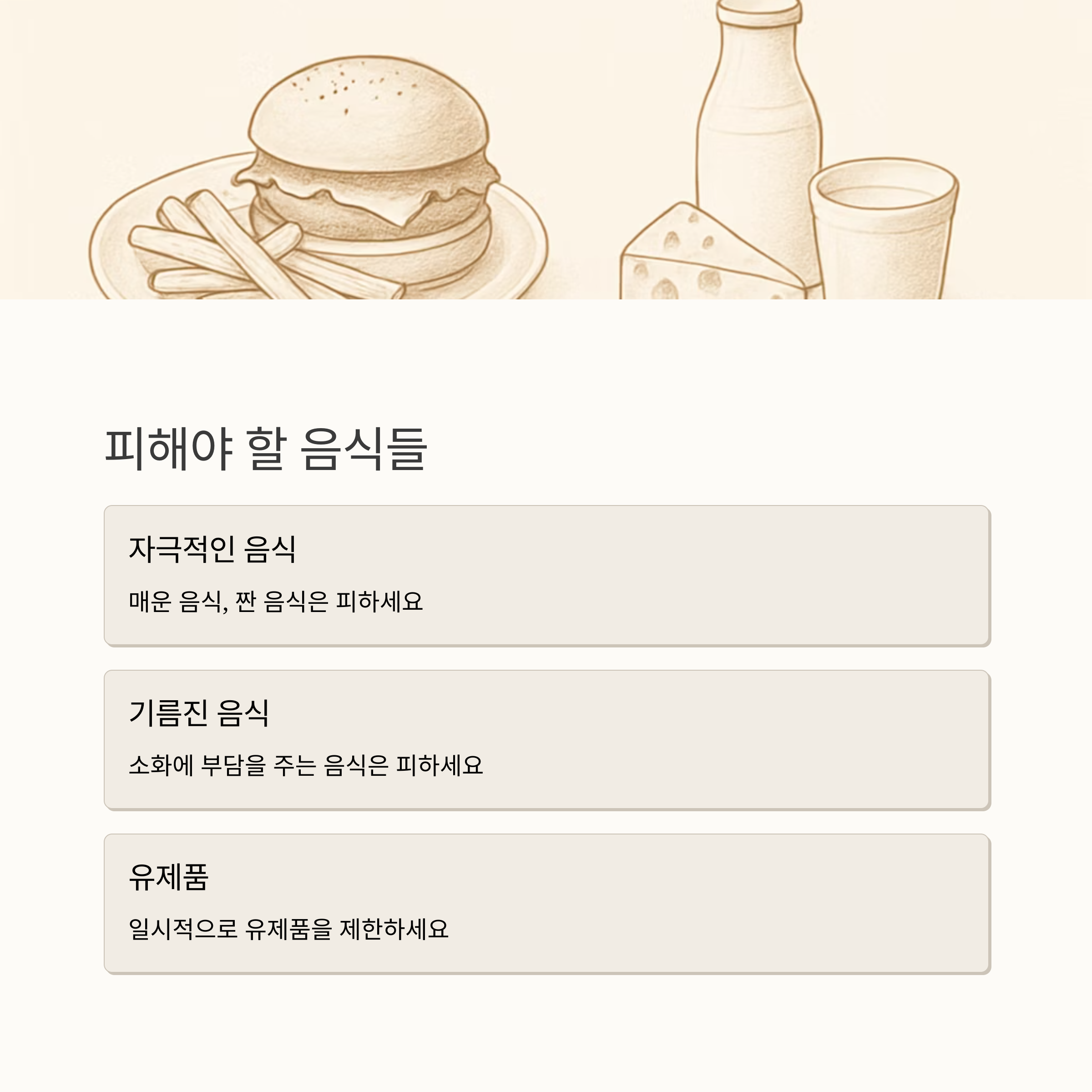 음식은 소화가 잘 되는 죽이나 흰 쌀밥처럼 자극적이지 않은 음식을 소량씩 자주 먹는 것이 좋아요. 맵고 짠 자극적인 음식은 당연히 피해야 하고요. 저는 처음에는 아무것도 먹지 못했지만, 시간이 지나면서 조금씩 죽을 먹기 시작했어요. 그리고 따뜻한 물로 찜질을 해주면 복통을 완화하는데 도움이 될 수 있다고 해요. 저는 따뜻한 물병을 배 위에 올려놓고 쉬었어요.