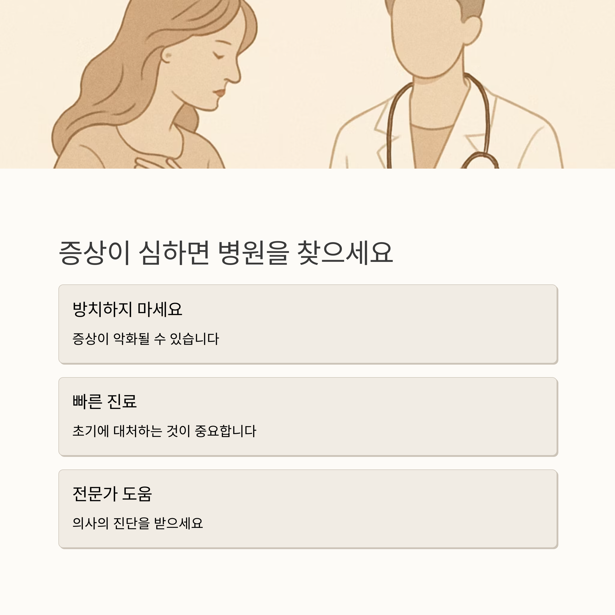 이런 증상이 나타나면 빨리 병원에 가서 진료를 받는 게 중요해요. 방치하면 더 악화될 수 있으니까요. 저도 처음에는 참고 버티다가 결국 병원에 가서 치료받았거든요. 미리미리 대처하는 것이 중요합니다.