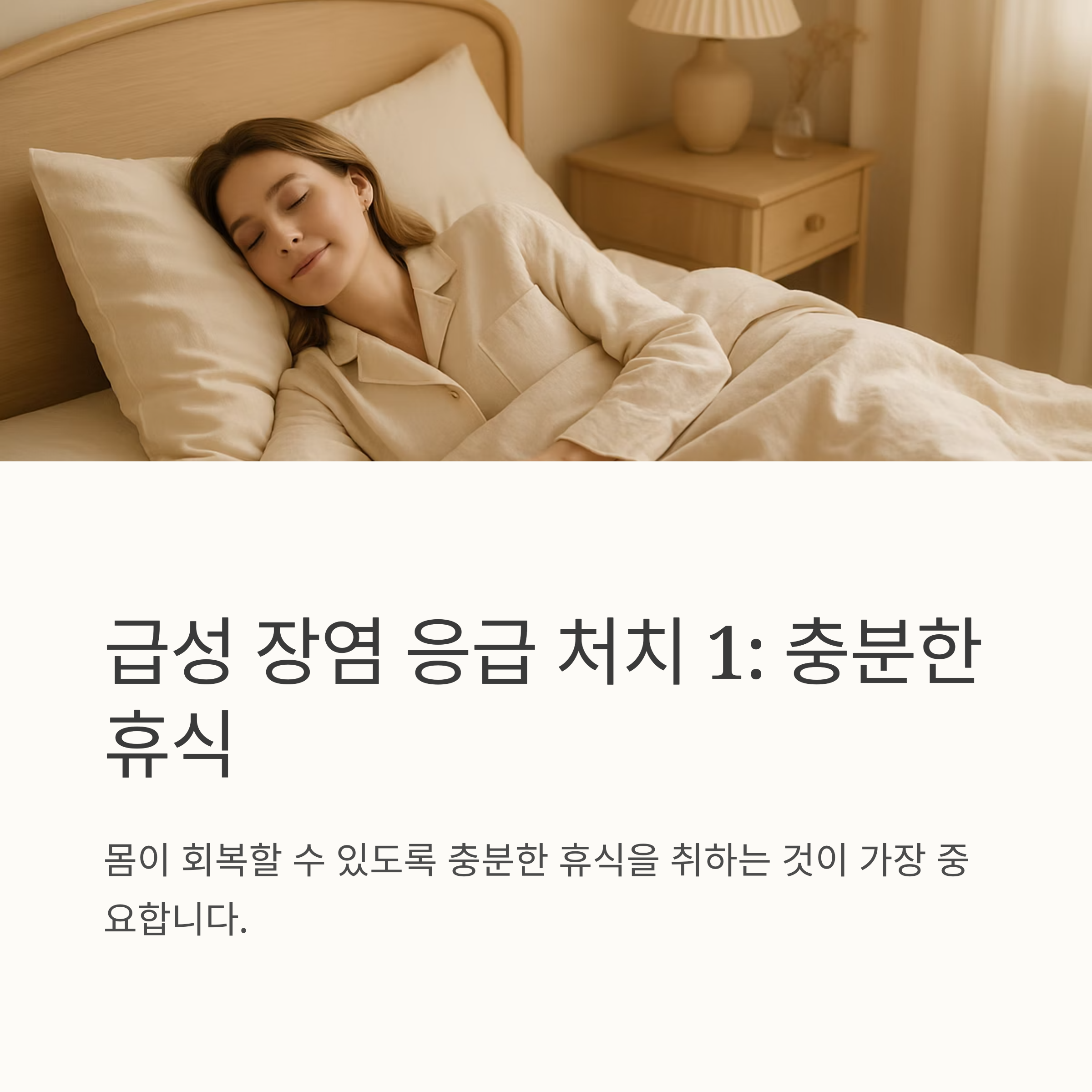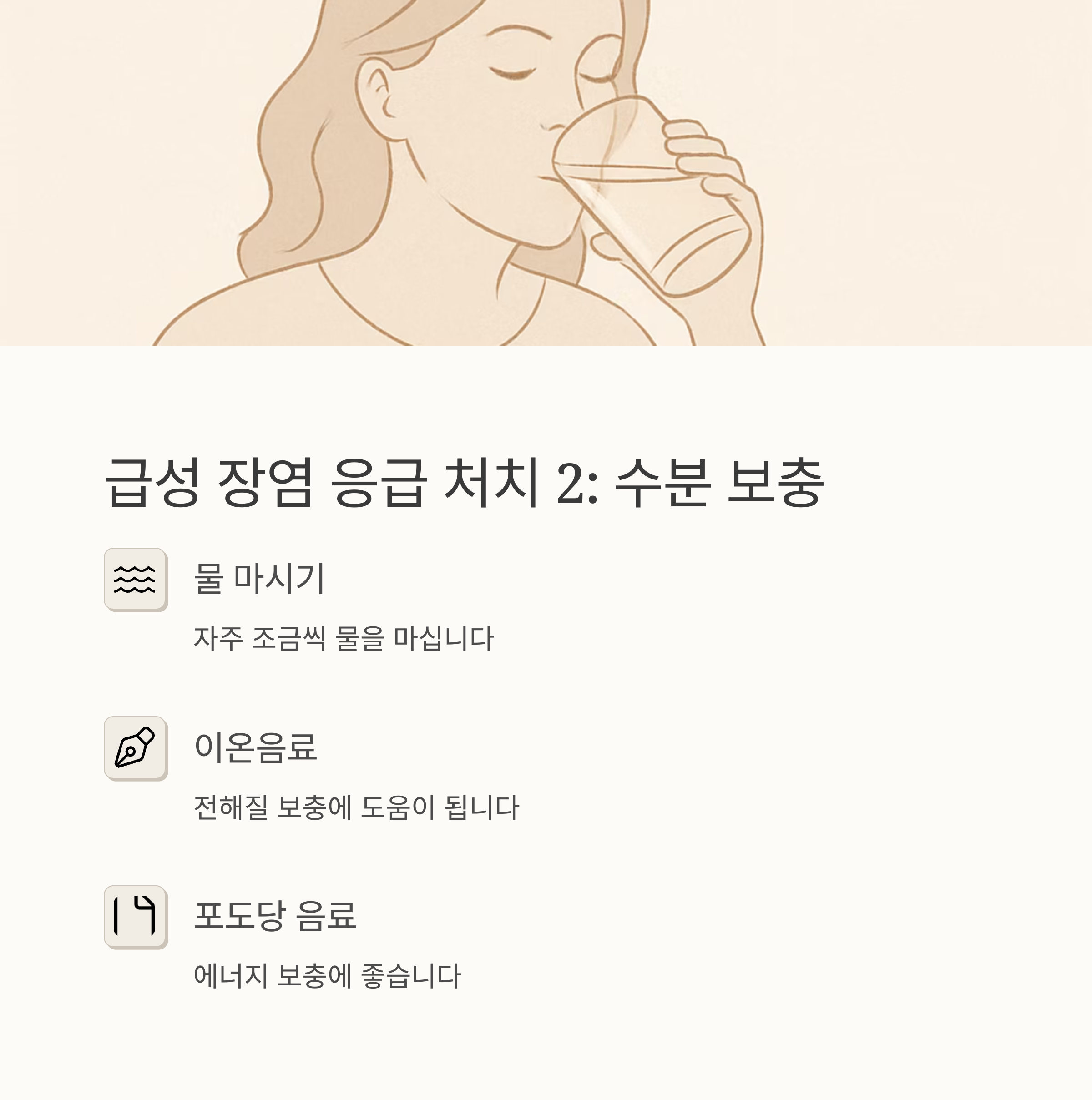 급성 장염 증상이 나타나면 일단 충분한 휴식을 취하는 것이 중요해요. 몸이 힘드니 쉬는게 최고겠죠. 그리고 탈수를 예방하기 위해 물이나 이온음료를 충분히 마셔주세요. 저는 포도당 음료를 마셨는데 도움이 많이 되었어요. 설사로 인해 잃은 수분과 전해질을 보충해줘야 하거든요.