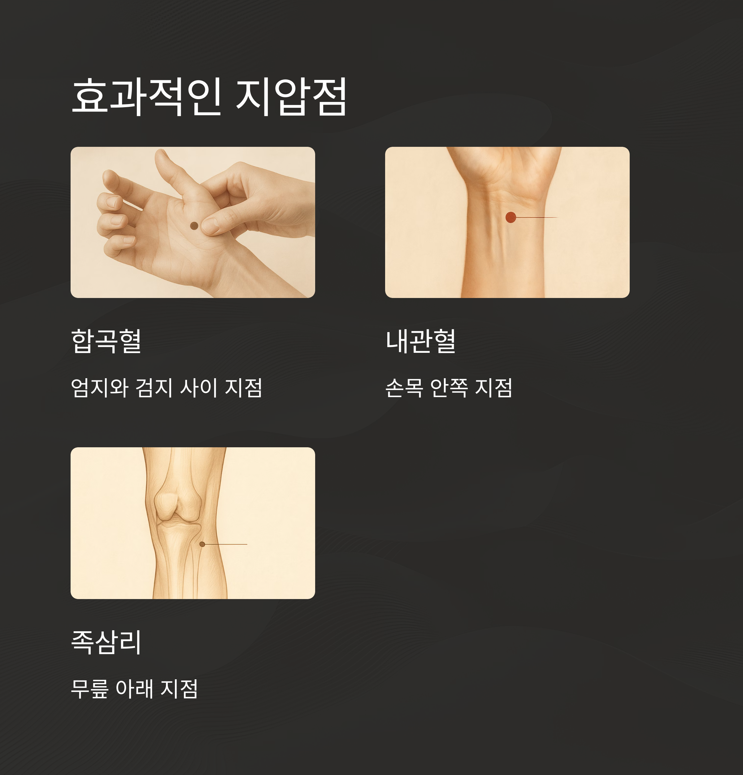 손가락으로 콕콕! 지압만으로도 소화를 촉진할 수 있다는 사실, 알고 계셨나요? 급체 증상이 있을 때 엄지와 검지 사이의 합곡혈, 그리고 손목 안쪽의 내관혈을 30초에서 1분 정도 꾸욱 눌러주세요. 약간 아픈 듯한 느낌이 들 정도로 압력을 가하는 것이 포인트입니다. 또 무릎 아래 족삼리 혈자리도 마사지해보세요. 이 혈자리들은 소화 기능을 돕고, 메스꺼움이나 속 쓰림을 완화하는 데 효과적이랍니다.
