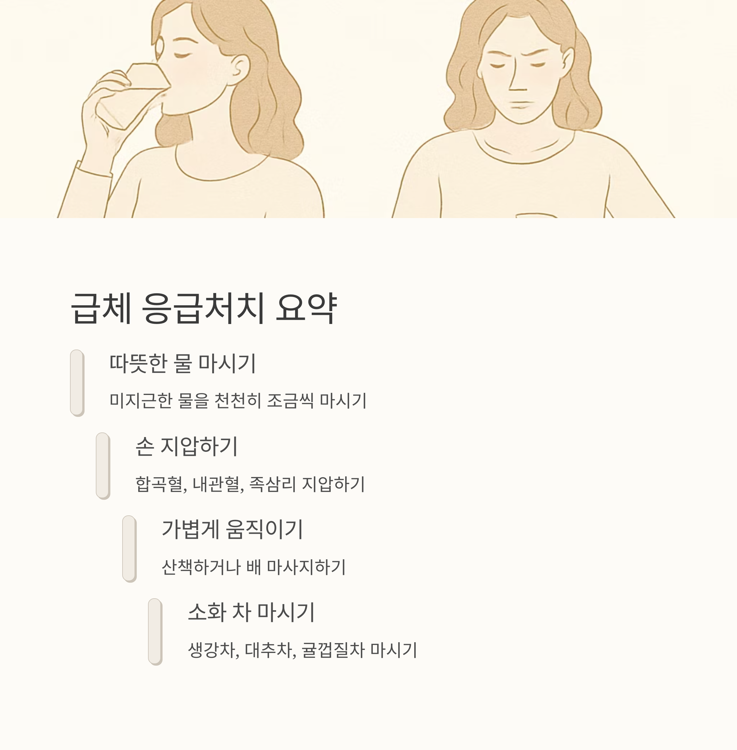급체가 의심될 때 가장 먼저 해야 할 급체 응급 처치는 바로 따뜻한 물을 마시는 거예요. 마법처럼 증상 완화에 도움을 줄 수 있답니다! 하지만 너무 뜨겁거나 차가운 물은 오히려 위를 자극할 수 있으니, 미지근한 정도(약 40~50도)의 물을 조금씩 천천히 마셔주는 것이 중요해요. 한 번에 너무 많은 양을 마시면 위에 부담을 줄 수 있으니, 두세 모금씩 여러 번 나눠 마시는 것이 좋답니다.